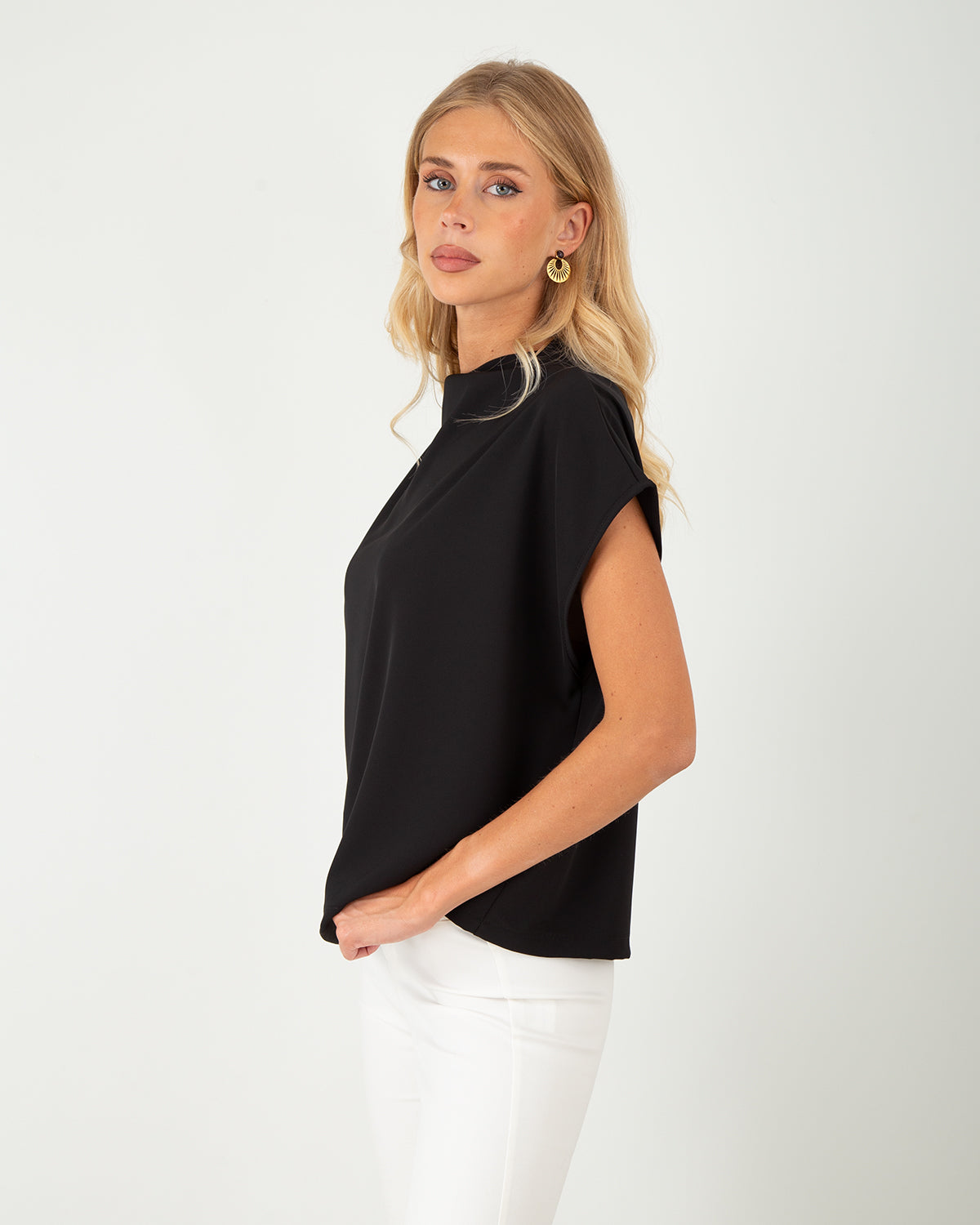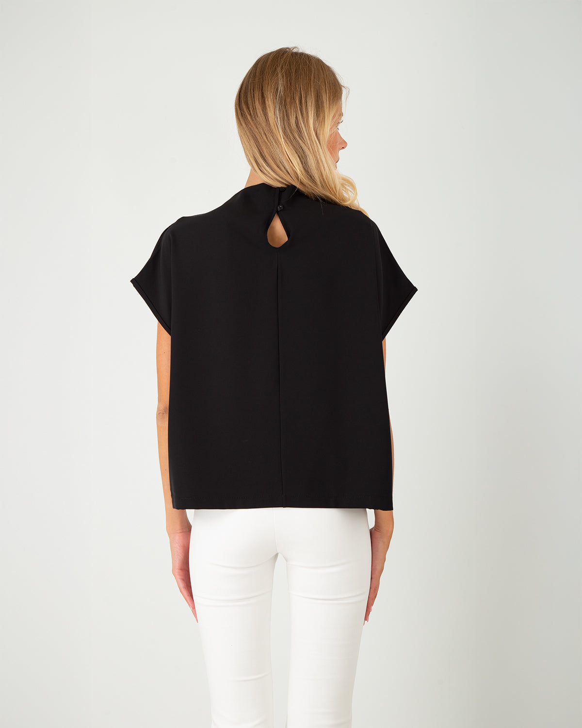 Questa blusa in tessuto fluido e leggero è pensata per la donna che desidera un capo raffinato ma confortevole, ideale per accompagnare ogni momento della giornata con stile. La linea è morbida e ariosa, con dettagli sartoriali che ne esaltano la semplicità sofisticata. Il collo a vulcano aggiunge un tocco moderno e femminile, incorniciando delicatamente il décolleté, mentre la spalla scesa e il taglio ampio regalano una vestibilità rilassata ma curata. Il tessuto scivola dolcemente sulla pelle, valorizzando la silhouette senza costringerla. La chiusura posteriore con bottone è discreta e funzionale, perfetta per una vestizione pratica ma elegante. Un capo versatile e senza tempo, ideale da indossare da solo o in coordinato con il pantalone fluido Basic per un total look armonioso e sofisticato.