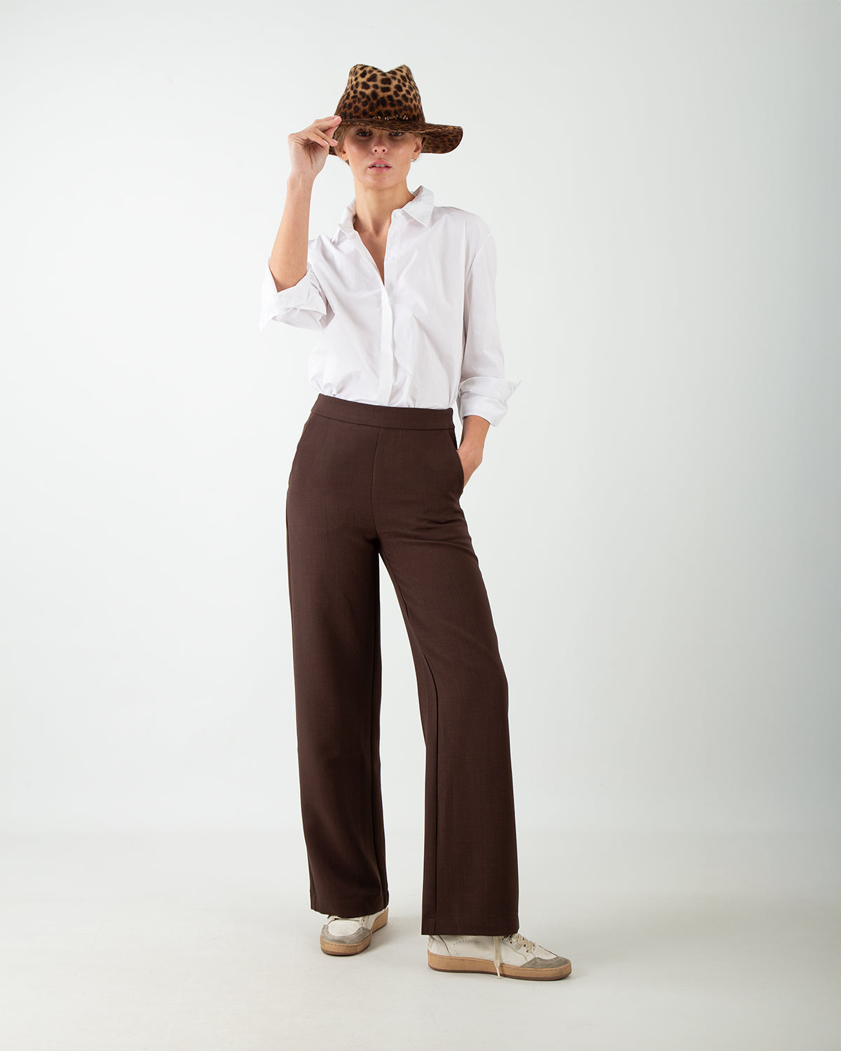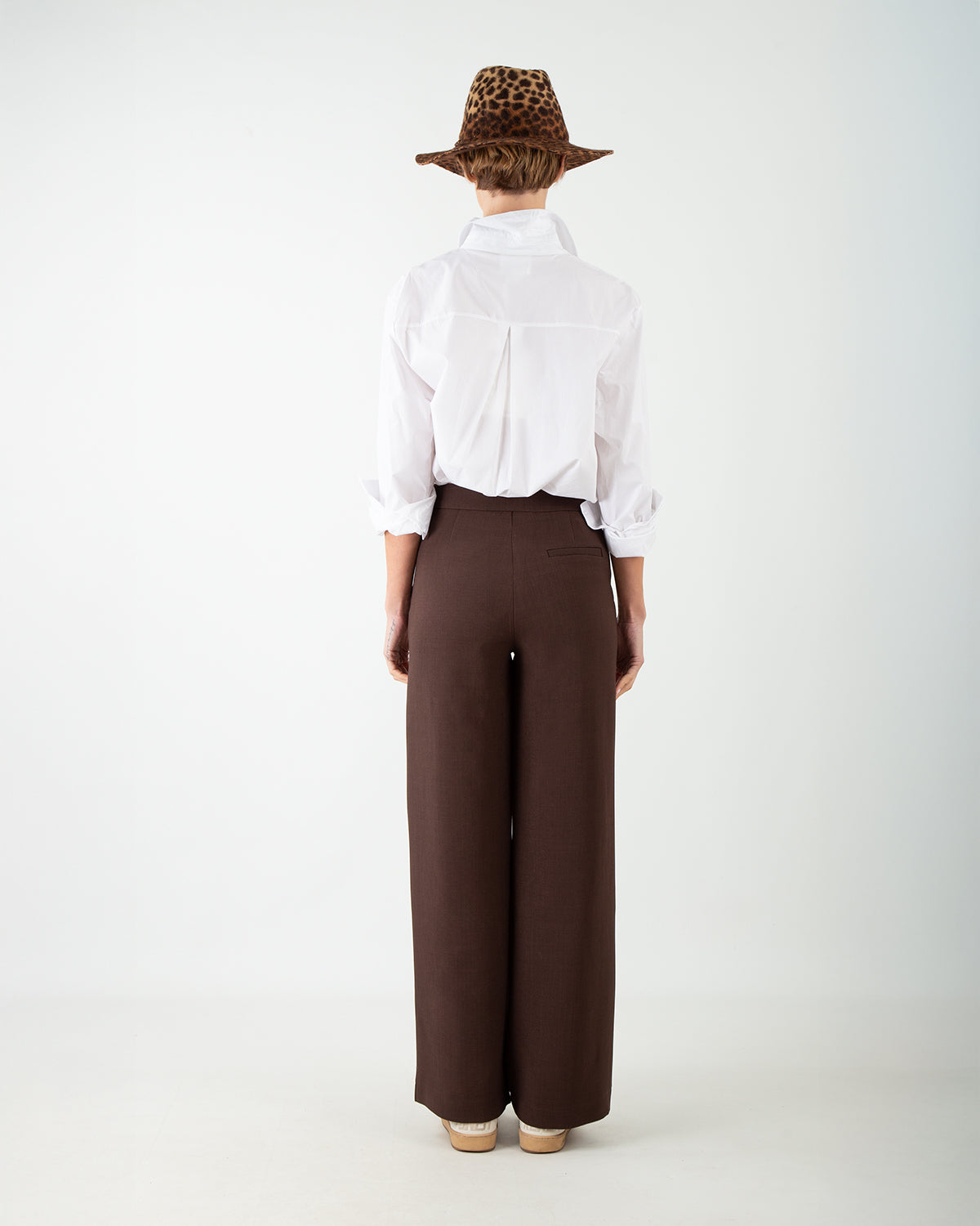 Questo pantalone palazzo a vita medio-alta scivola morbido sulla figura con un taglio dritto che valorizza la silhouette. Le due tasche laterali e quelle posteriori a filetto completano un design elegante, mentre la zip laterale nascosta garantisce una chiusura discreta e raffinata. Perfetto da abbinare a look più formali o da reinterpretare in chiave casual con una sneaker, un pantalone versatile che unisce stile e classe in ogni occasione.