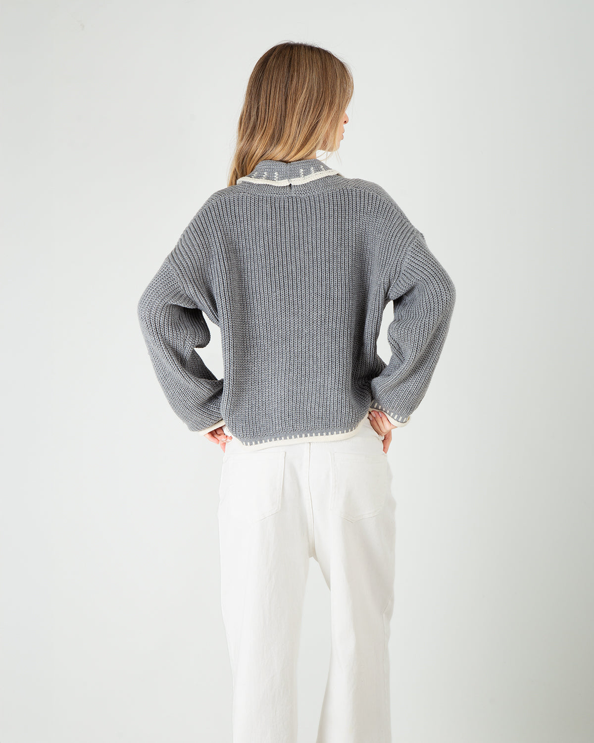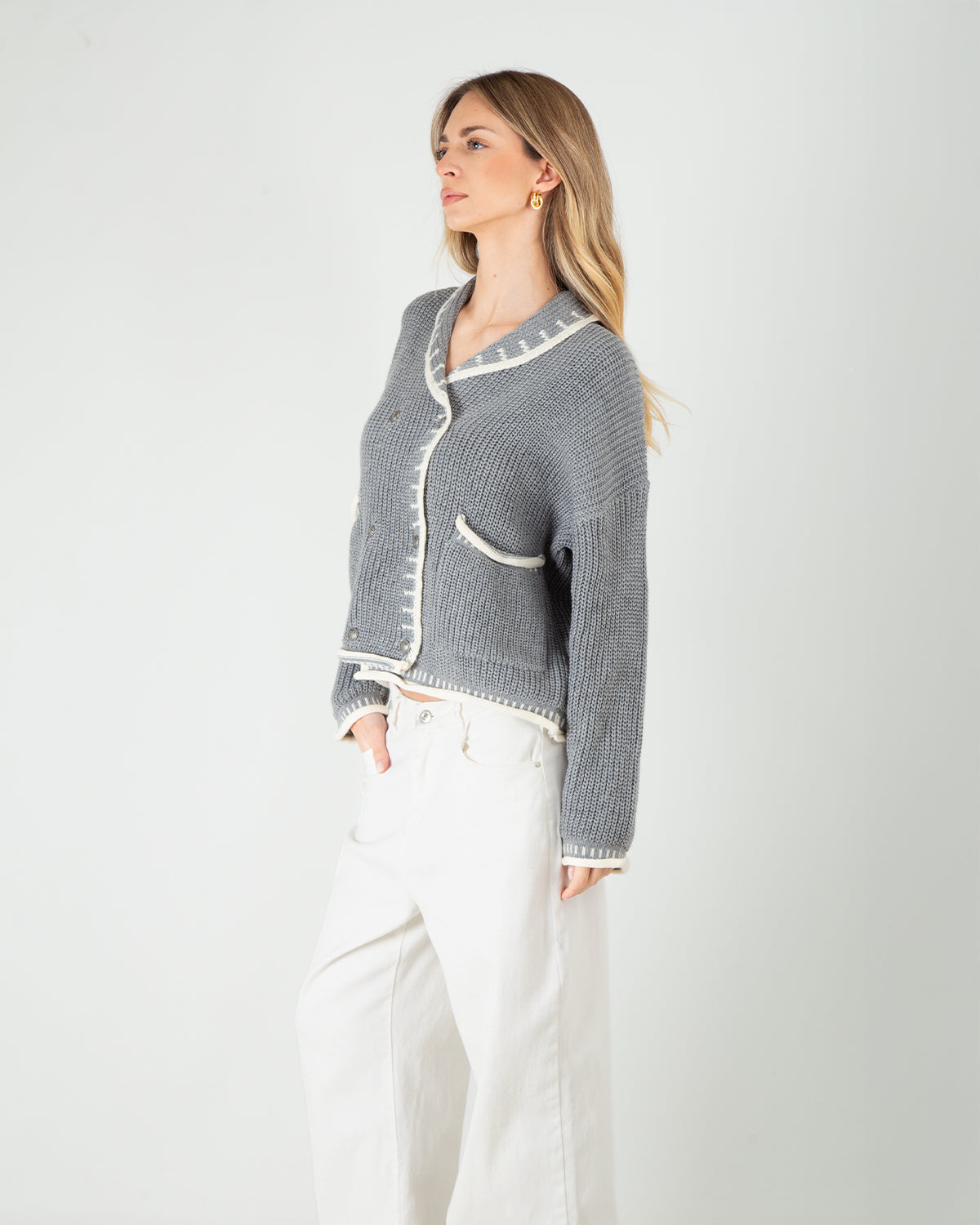 Questo cardigan doppiopetto in maglia interpreta uno stile classico e sofisticato, pensato per chi ama i dettagli curati e l’eleganza senza eccessi. I profili a contrasto definiscono la silhouette con precisione, mentre i bottoni dallo stile vintage aggiungono carattere e fascino d’altri tempi. Le due tasche frontali completano il design, rendendolo pratico e perfetto per costruire look raffinati dal giorno alla sera.