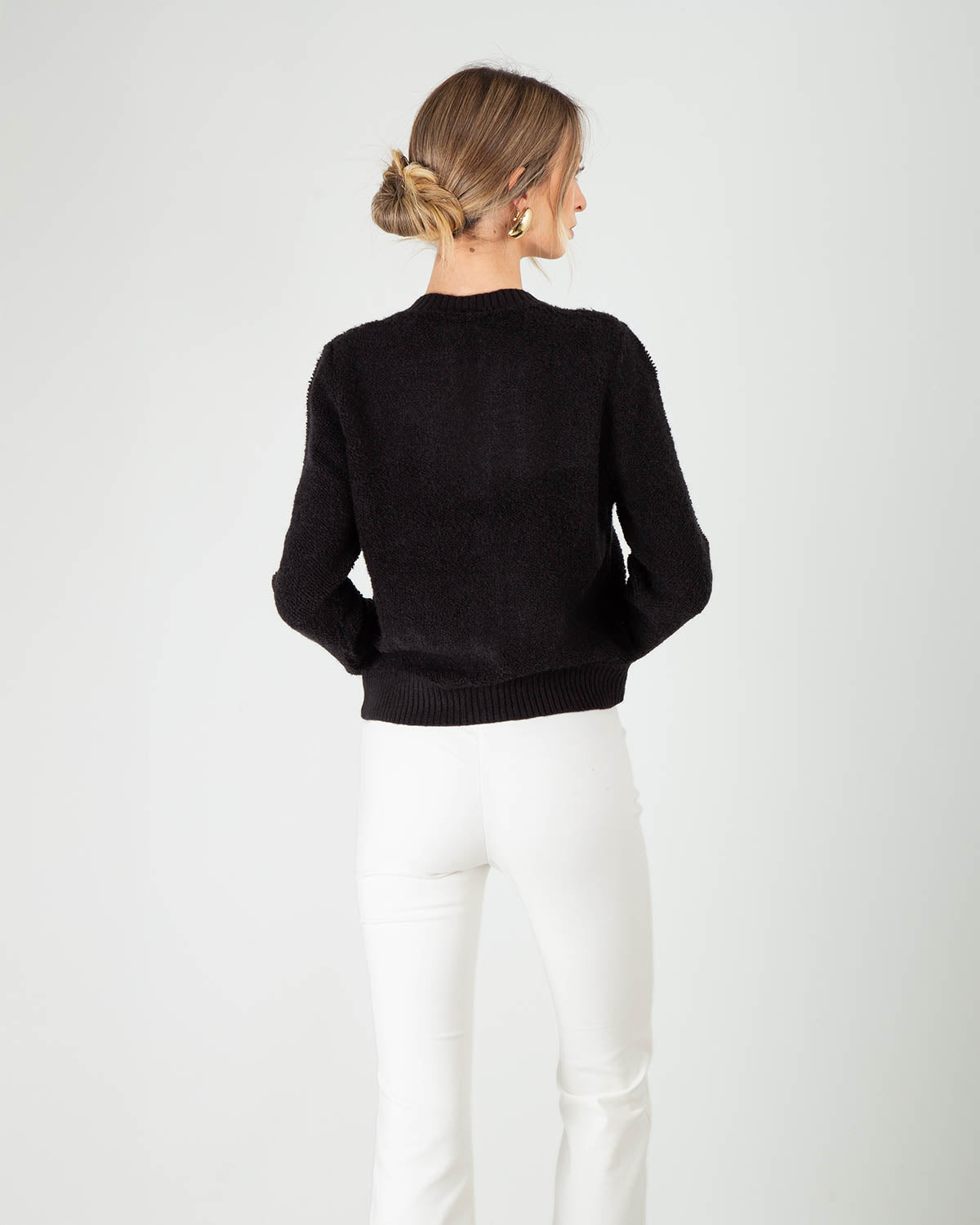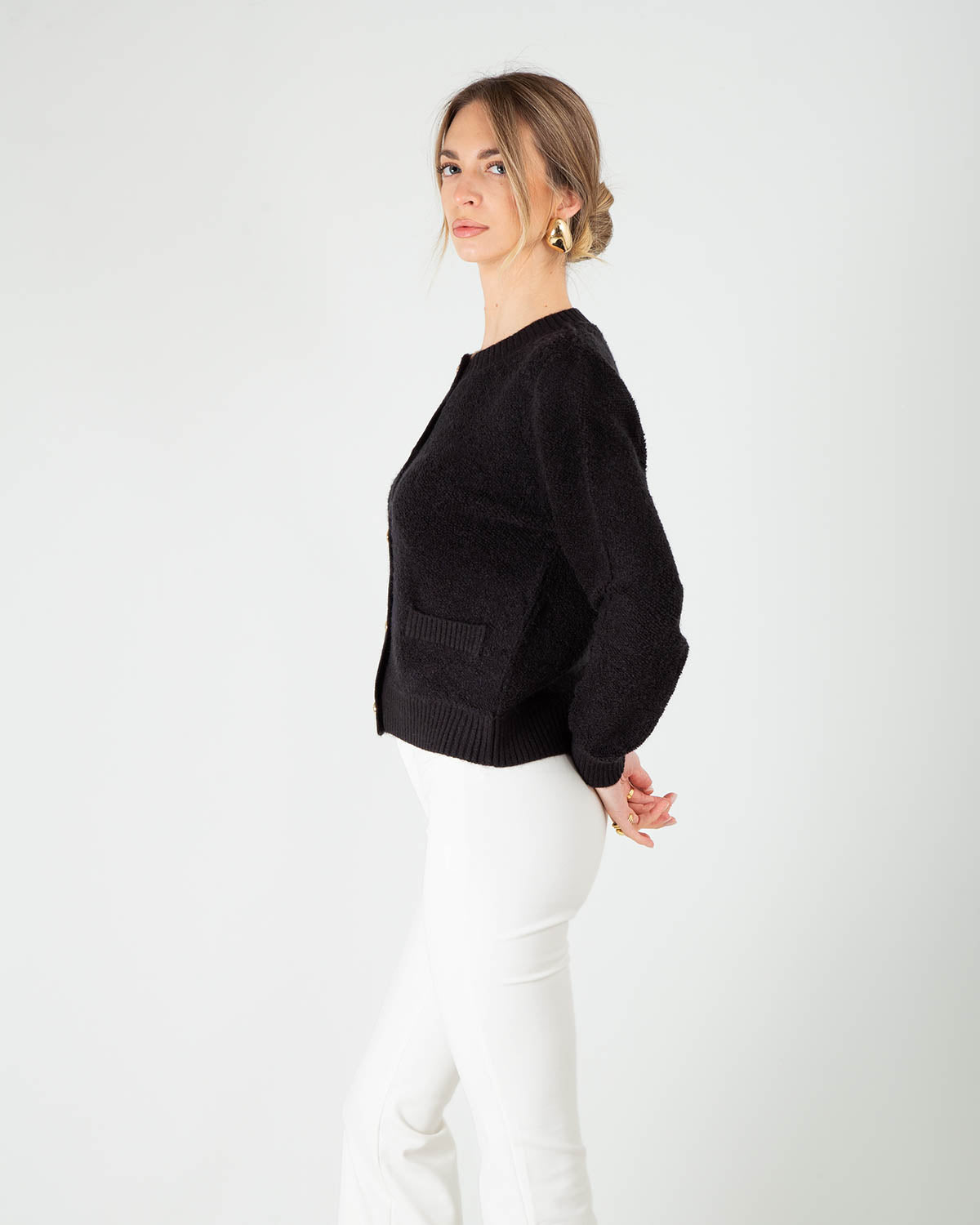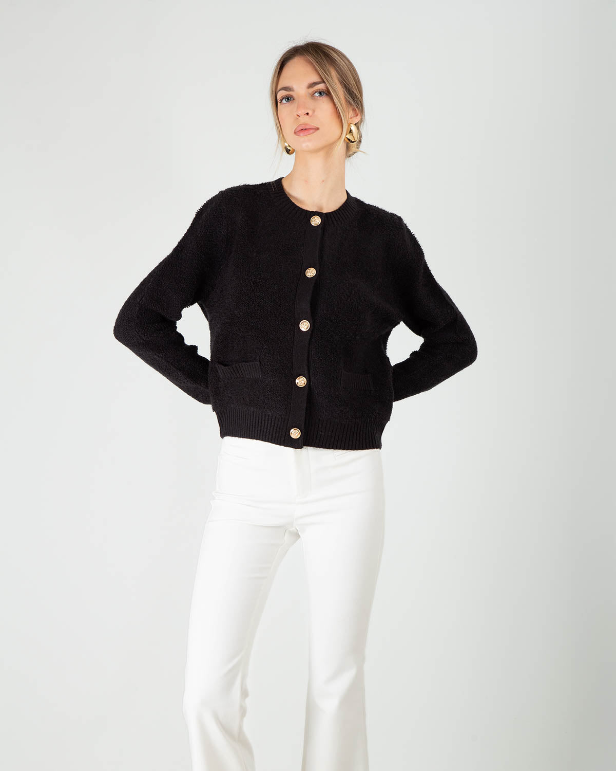 Dettagli: Giacchina/cardigan in bouclé. Filato morbido. Vestibilità regolare. Girocollo. Chiusura con bottoni dorati.