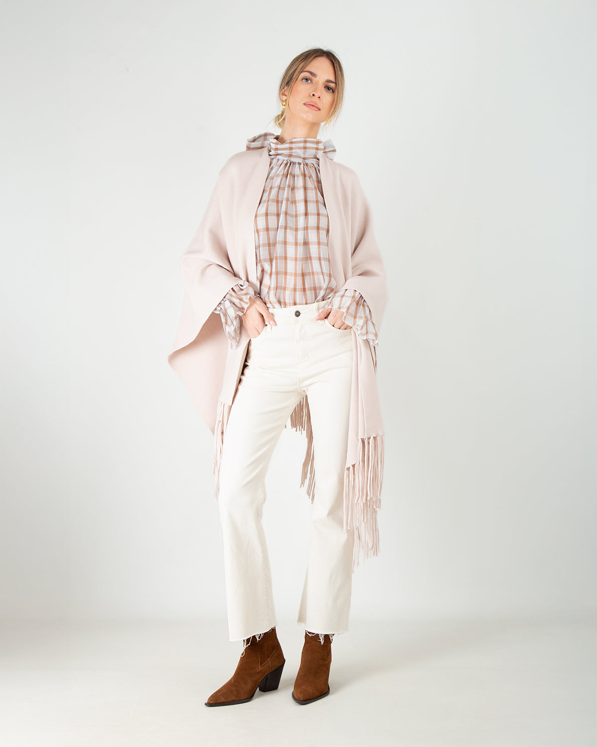 Questa mantella con frange, realizzata in misto viscosa morbido e caldo, avvolge la silhouette con una vestibilità over che garantisce comfort ed eleganza disinvolta. Lo stile fluido e le frange lungo il bordo creano dinamismo ad ogni passo, mentre il suo carattere boho chic la rende perfetta sia come coprispalla per la mezza stagione sia come cardigan avvolgente per i mesi più freddi. Un capo versatile, pensato per elevare anche gli outfit più essenziali.