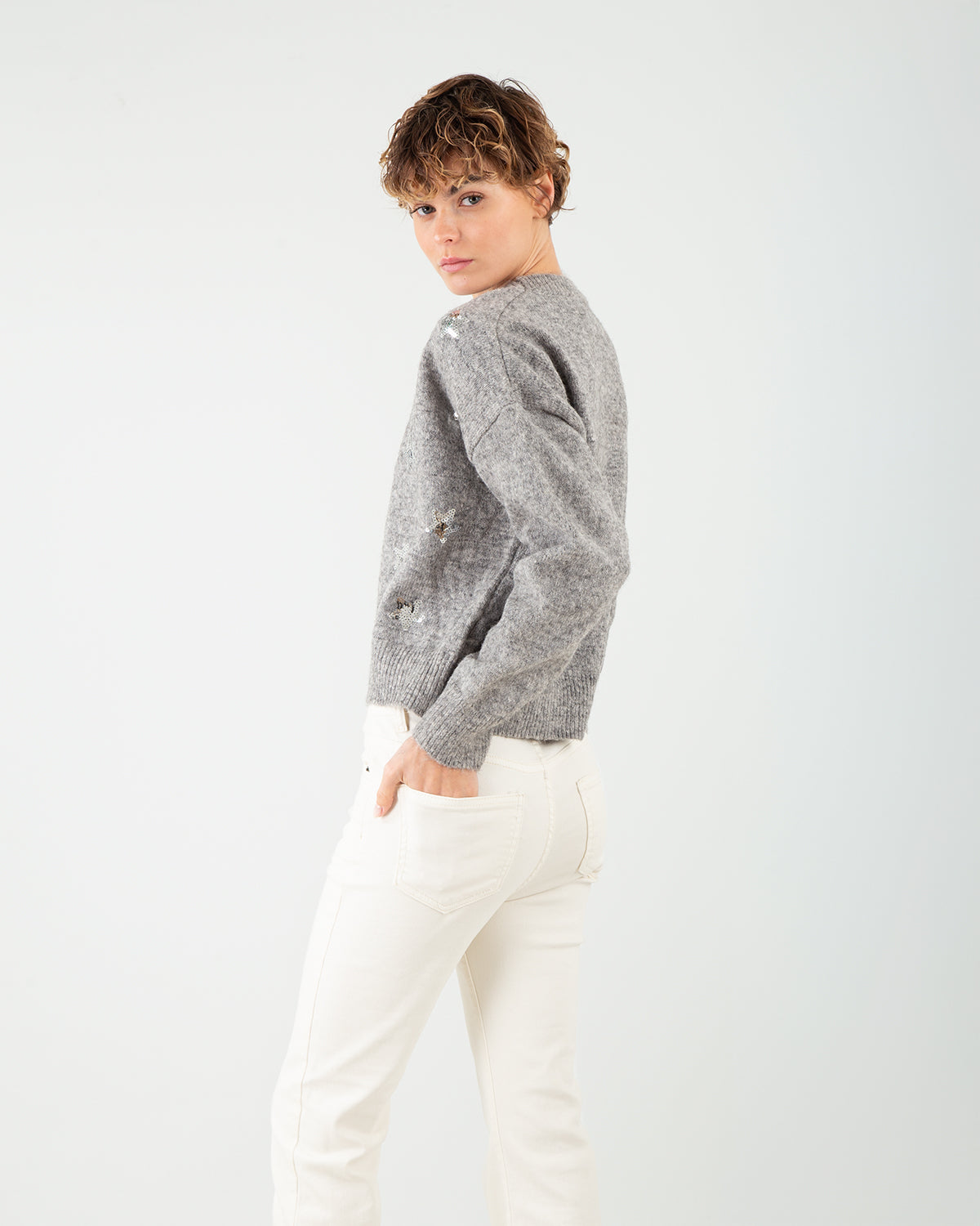 Il Maglioncino Stelle Paillettes è realizzato in un filato morbido e caldo, perfetto per affrontare le giornate invernali con comfort. Le stelle in paillettes aggiungono un tocco luminoso e scenografico, rendendolo ideale per le feste e per chi ama donare un dettaglio brillante ai propri look. Il girocollo classico lo rende versatile e facile da abbinare.