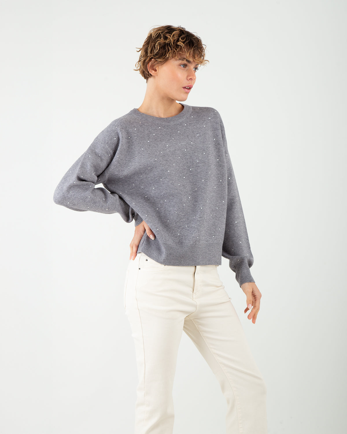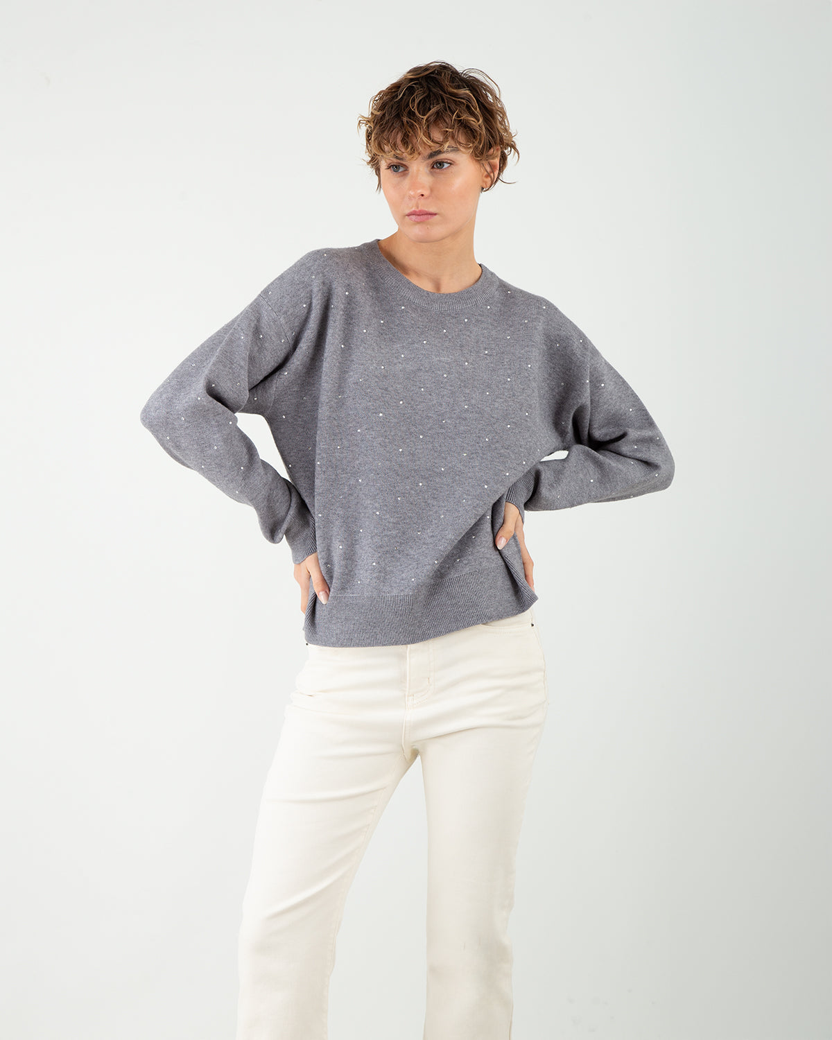 Realizzato in un morbido e caldo misto viscosa, questo maglione aggiunge un’eleganza discreta grazie alle piccole applicazioni di strass che illuminano il look. La vestibilità regolare lo rende confortevole e facile da abbinare, perfetto per creare outfit raffinati senza rinunciare alla comodità. Ideale per le feste e le occasioni speciali, ma anche per dare un twist luminoso ai look quotidiani.