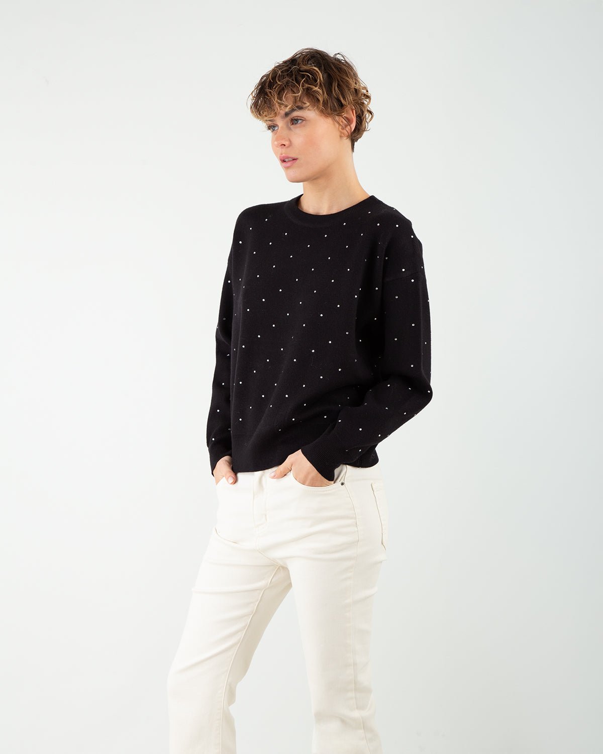 Dettagli: Morbido e caldo misto viscosa. Applicazioni di piccoli strass per un tocco luminoso. Vestibilità regolare. Girocollo classico. Perfetto per le feste e i look eleganti.