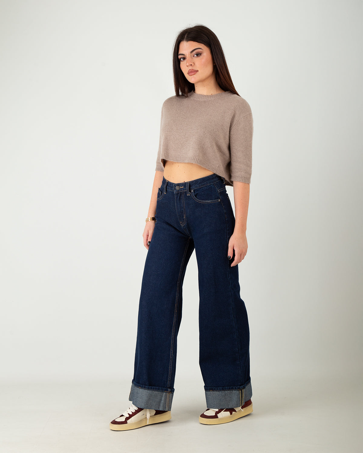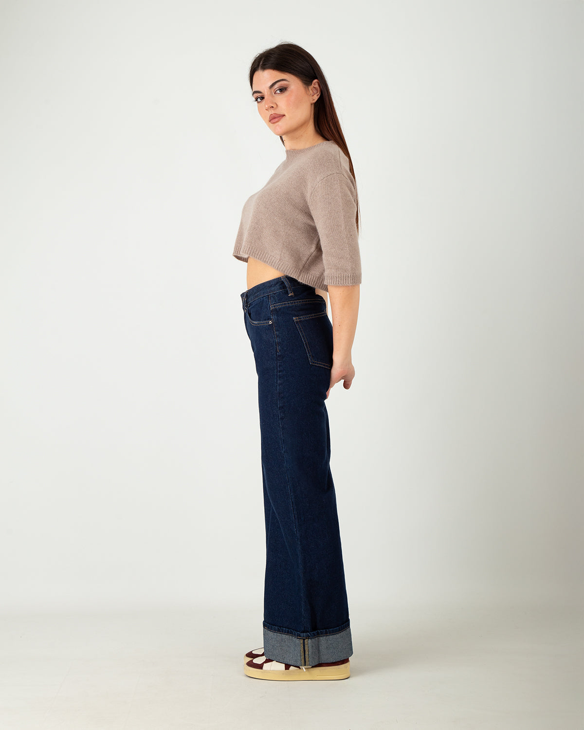 I jeans palazzo con risvolto sono l’alleato ideale per la donna che cerca un capo comodo, strutturato e ricco di personalità. La vita alta valorizza la figura e slancia la silhouette, mentre la gamba ampia e fluida dona movimento e un tocco sofisticato. Il risvolto al fondo aggiunge un dettaglio distintivo e moderno, perfetto per dare carattere anche ai look più minimal. Un capo versatile da indossare con top aderenti o blazer oversize, per un outfit chic e contemporaneo.