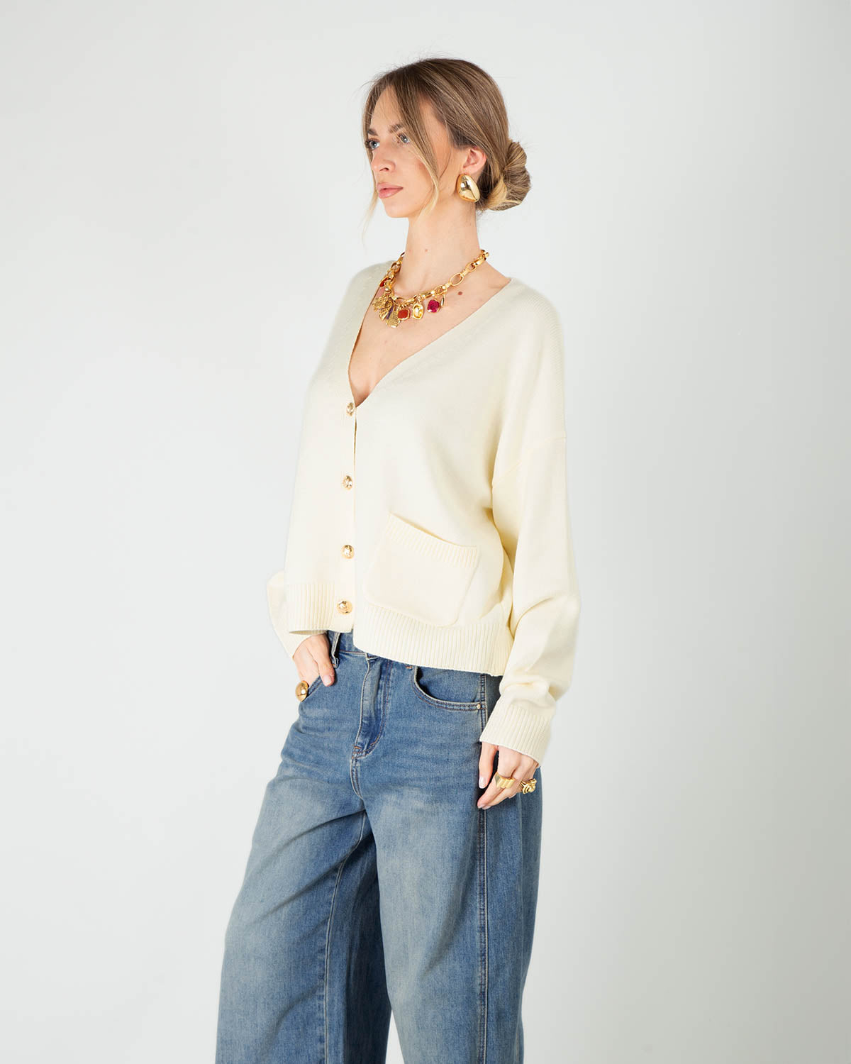 Dettagli: Cardigan over. Filato morbido. Profondo scollo a V. Chiusura con bottoni dorati. Due taschine frontali.