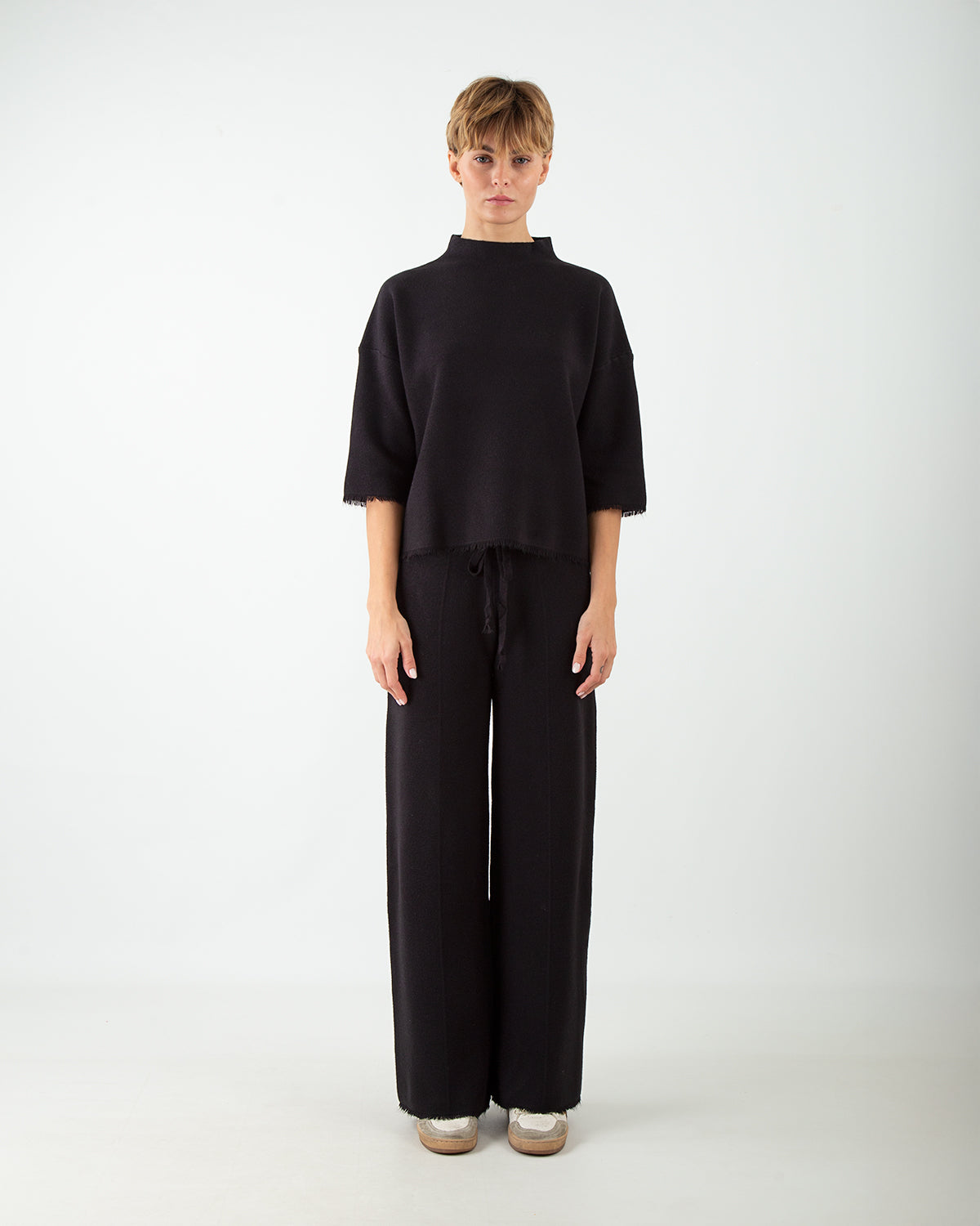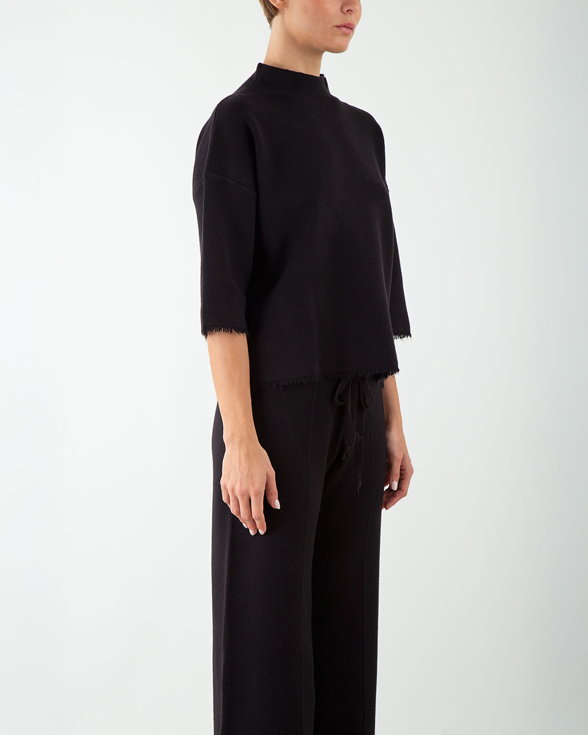 Dettagli: Completo in maglia misto viscosa caldo e morbido. Maglia a maniche 3/4 con collo morbido e finiture sfrangiate.