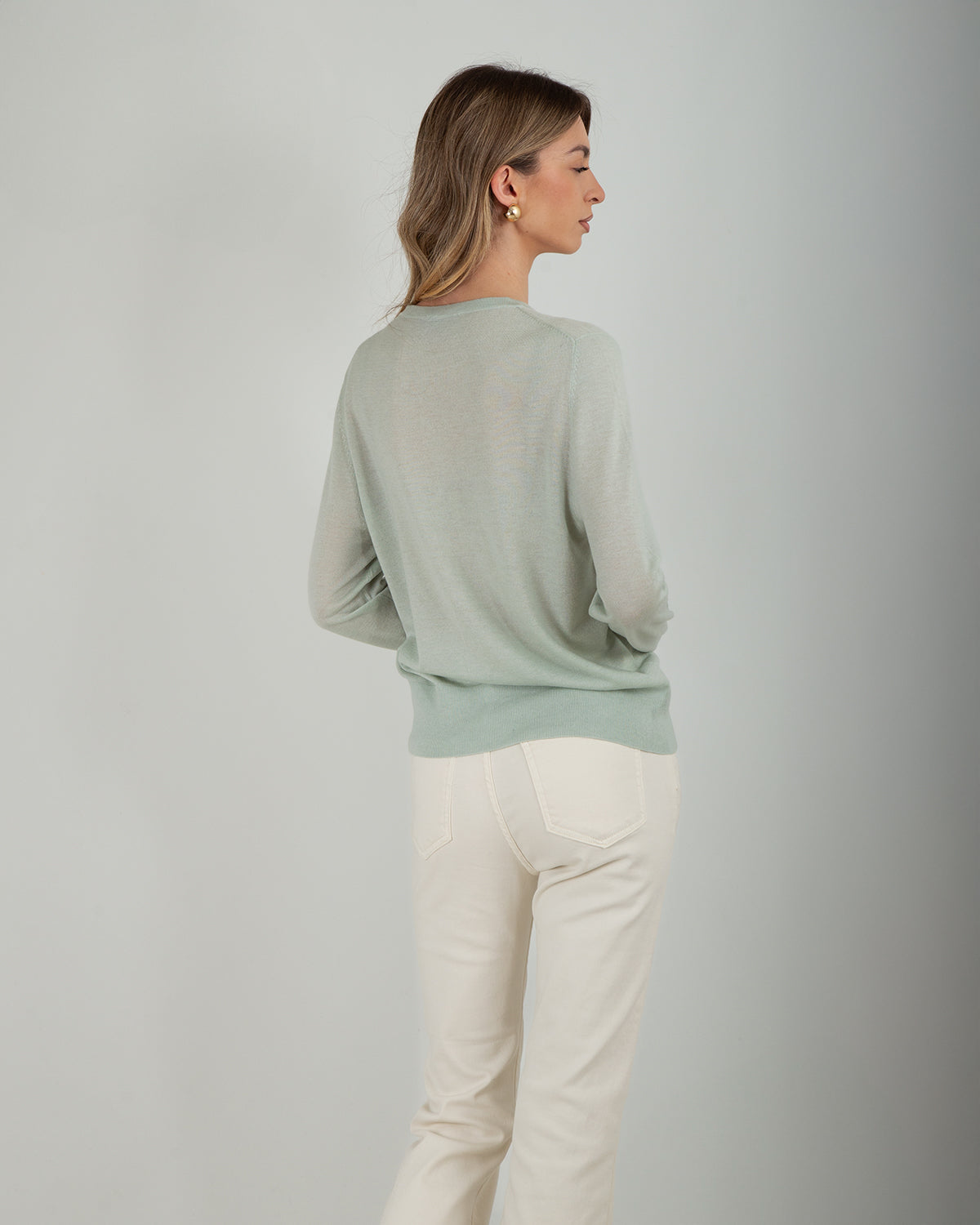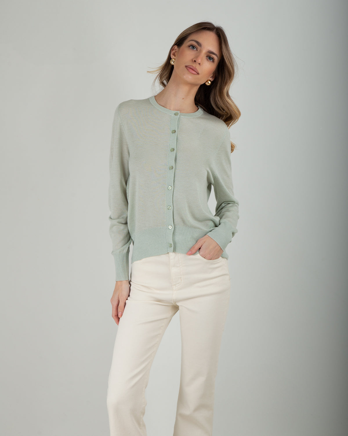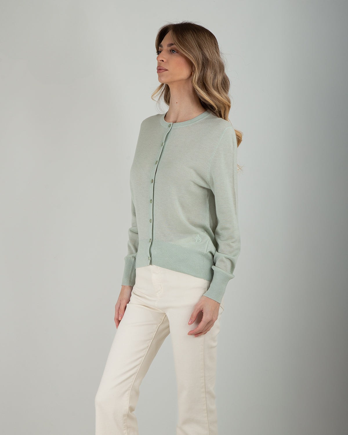 • Giacchina girocollo in lana merino con bottoni frontali, ideale per la primavera.