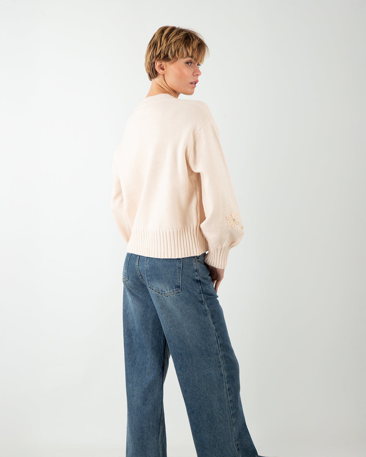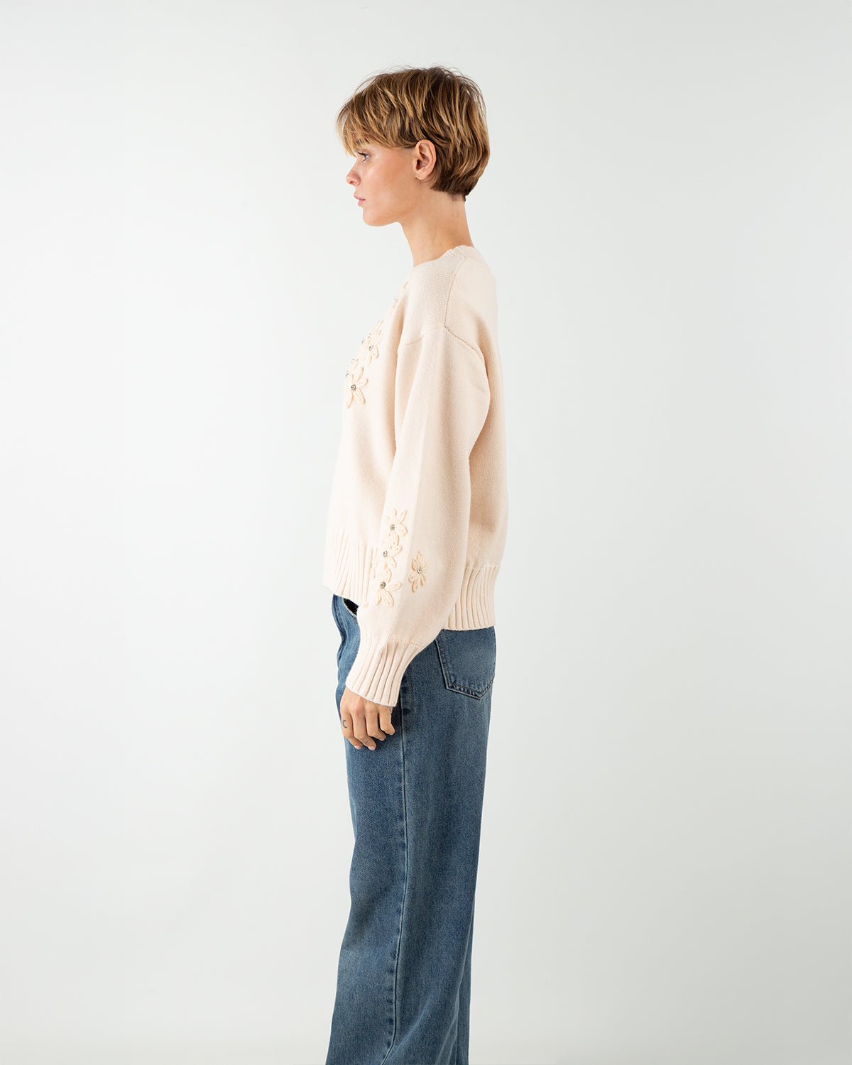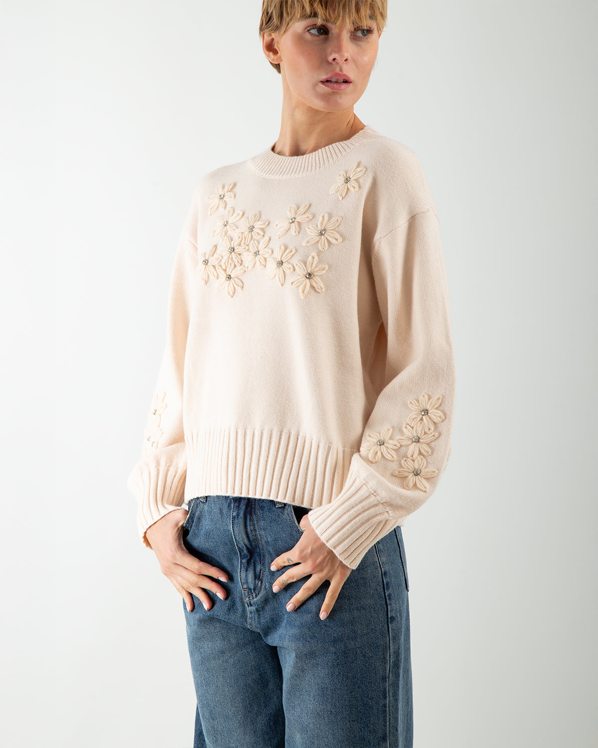 Un maglione che unisce romanticismo e femminilità con un tocco di luce. Realizzato in morbido e caldo misto viscosa, avvolge con eleganza e valorizza la silhouette. I fiori ricamati che decorano il girocollo e i polsi donano un fascino sofisticato, mentre i piccoli strass al centro dei ricami aggiungono una luminosità discreta e raffinata. Le maniche leggermente a palloncino e i polsini strutturati completano un design romantico ma deciso, perfetto per look che uniscono delicatezza e personalità.