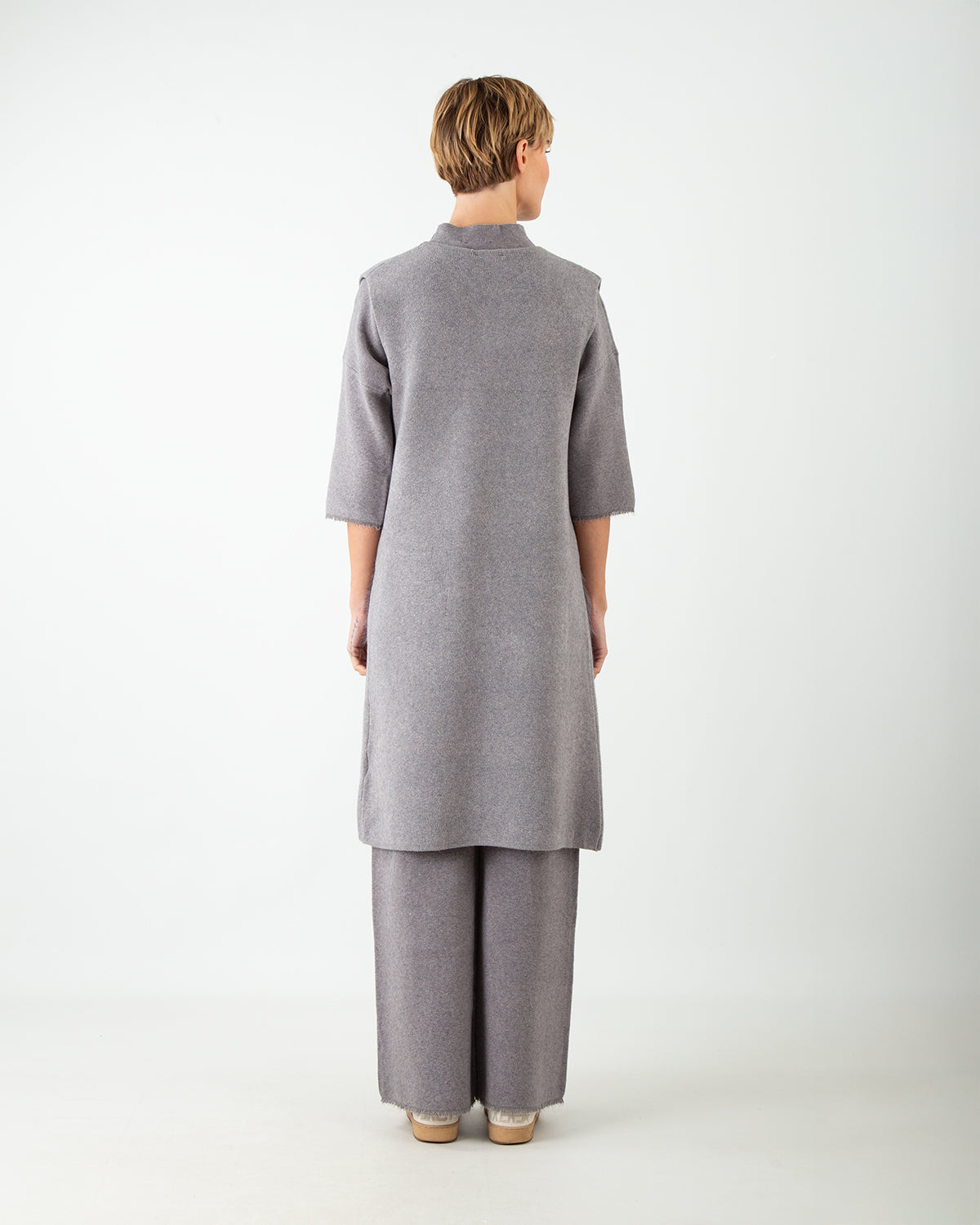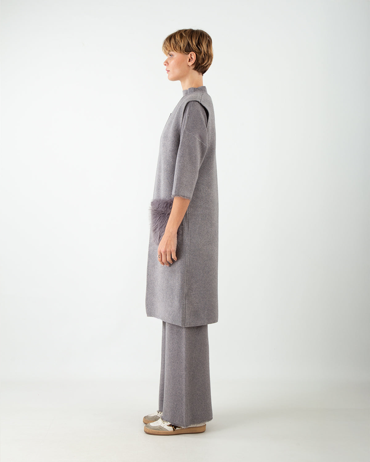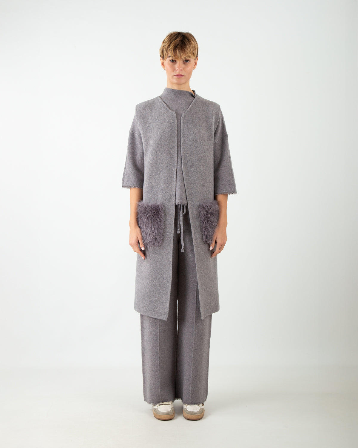 Questo maxi gilet in maglia realizzato in morbido filato misto viscosa, avvolge la silhouette con leggerezza, aggiungendo un tocco caldo alla stagione fredda. Le tasche frontali in eco-pelliccia diventano protagoniste di un design contemporaneo e raffinato, perfetto da indossare sopra look casual come il nostro Completo in Maglia Frange o outfit più ricercati. Un capo essenziale per chi ama vivere la quotidianità con eleganza senza rinunciare alla comodità.