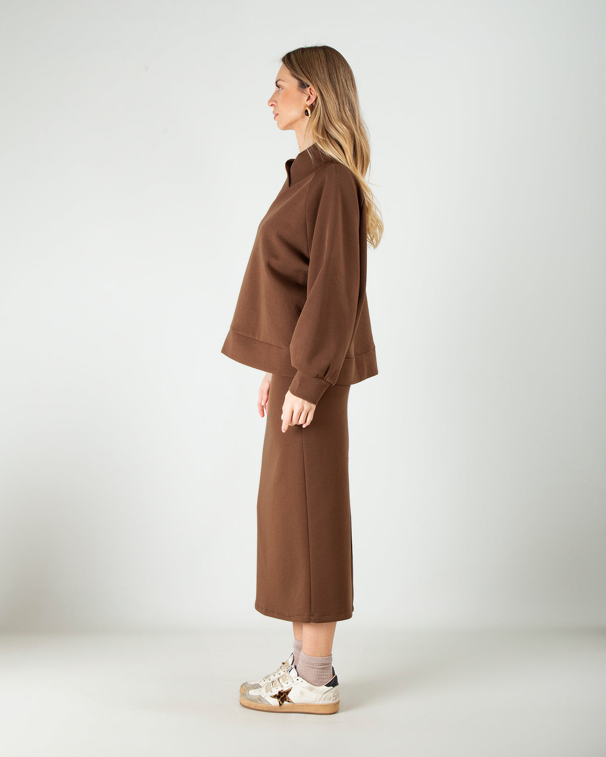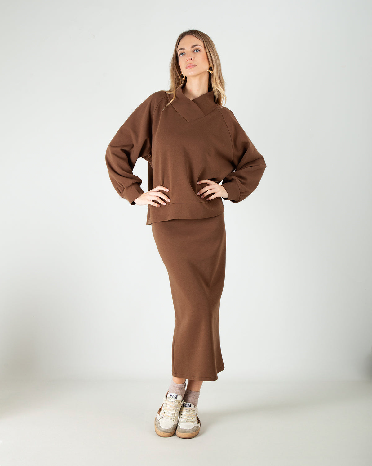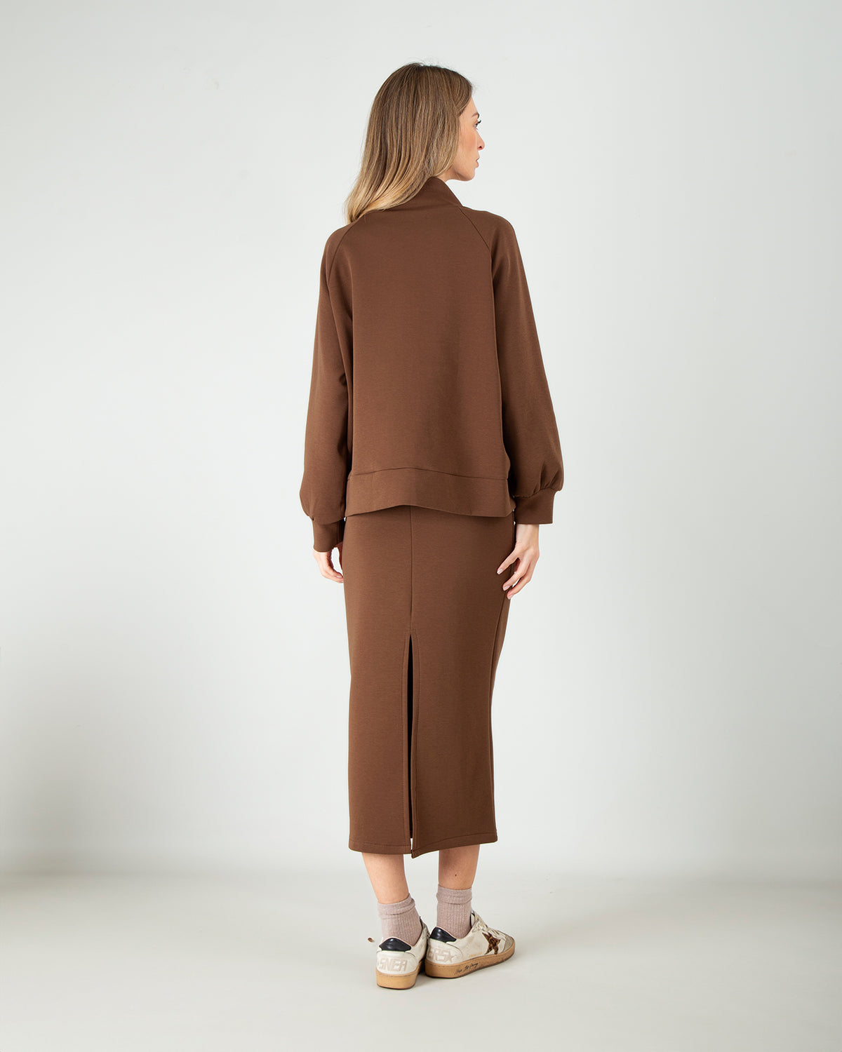 Questo set coordinato scuba in cotone è pensato per chi ama uno stile pulito, elegante e versatile. La felpa con scollo a V valorizza la parte superiore con discrezione, mentre le maniche leggermente a palloncino aggiungono un tocco femminile e attuale. La gonna longuette scuba in cotone completa il look con una linea classica e ordinata, impreziosita da un piccolo spacco sul retro che facilita il movimento e dona leggerezza alla silhouette. Un completo dalla linea pulita e senza tempo, ideale da indossare insieme per un look coordinato oppure separatamente per creare abbinamenti sempre nuovi, perfetto sia per il giorno che per occasioni più curate.