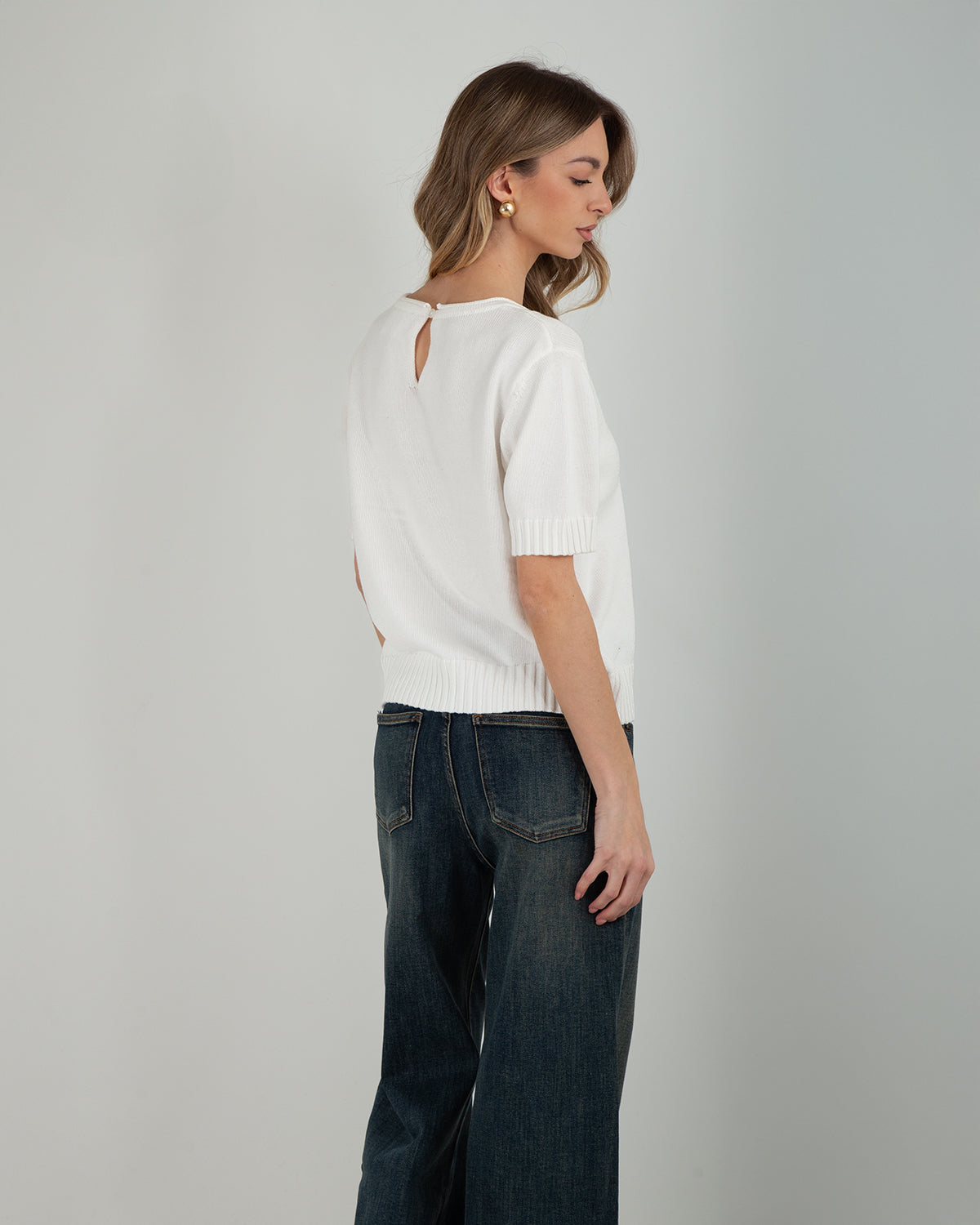 La Maglia Manica Corta 100% Cotone è un capo semplice ma curato nei dettagli, ideale per accompagnarti in ogni momento della giornata. Realizzata in cotone naturale, garantisce morbidezza, traspirabilità e comfort. I bordi a costine su fondo e maniche aggiungono struttura al design, mentre la chiusura sul retro con bottone dona un tocco delicato e femminile, rendendo il capo più ricercato. Perfetta da abbinare a jeans, gonne o pantaloni, è una maglia versatile che si adatta facilmente a look casual o più eleganti, a seconda degli abbinamenti.