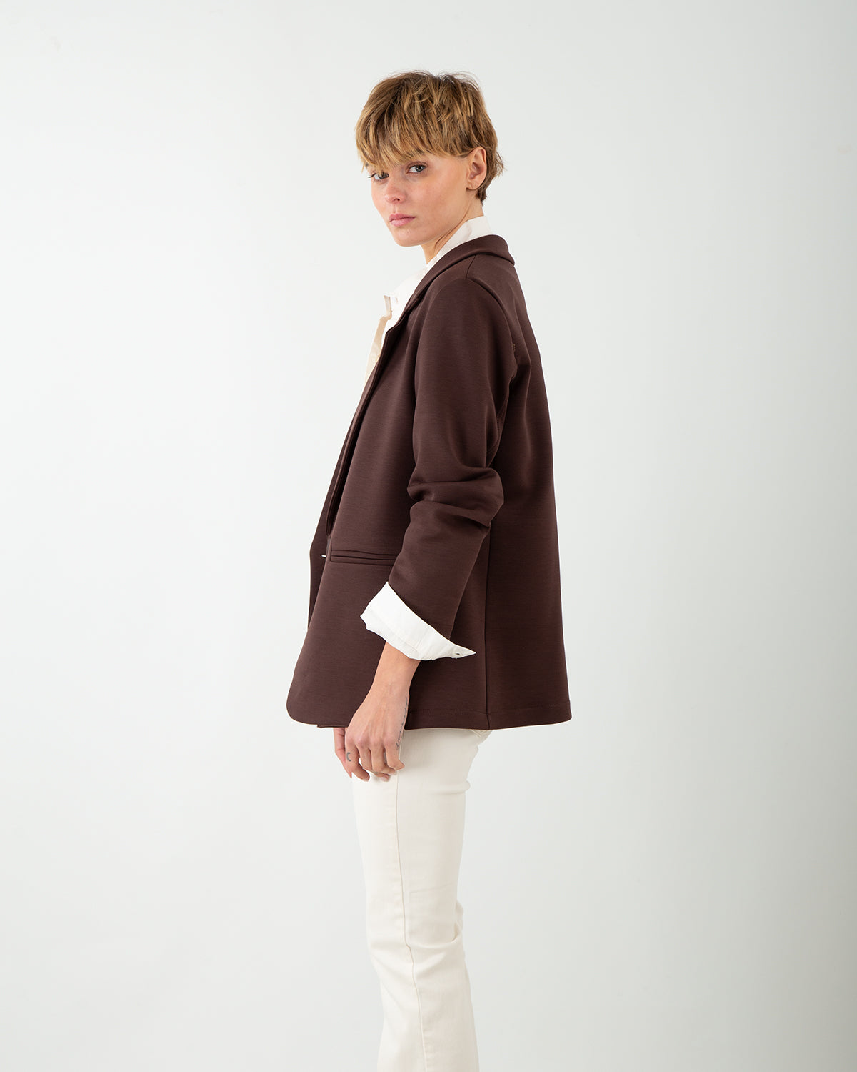 Ispirata al taglio impeccabile del blazer tradizionale, questa giacca in tessuto scuba reinterpreta un’icona del guardaroba con una nuova idea di versatilità. La linea dritta e regolare valorizza la figura con eleganza, mentre la struttura elastica del tessuto assicura libertà di movimento e comfort in ogni momento della giornata. Perfetta per le occasioni più eleganti ma facile da indossare anche con un denim, è il capo che unisce la raffinatezza sartoriale alla praticità contemporanea. Un investimento intelligente per uno stile senza tempo.