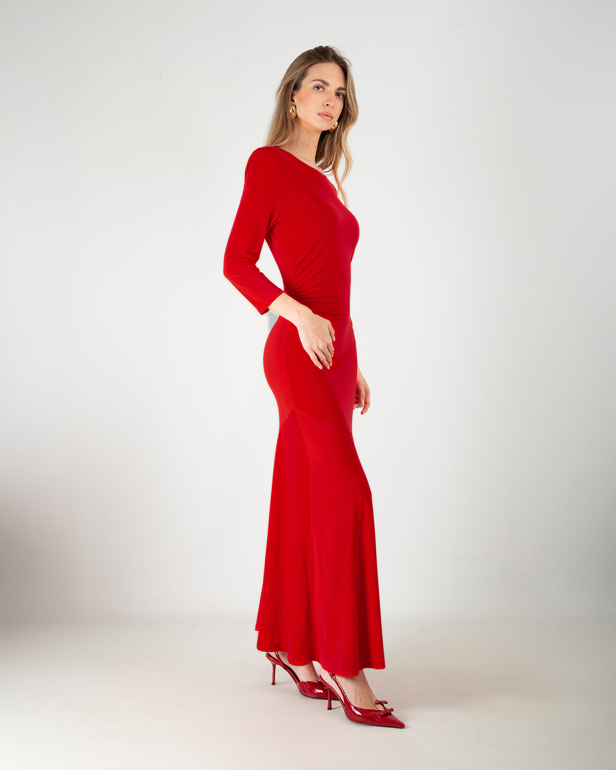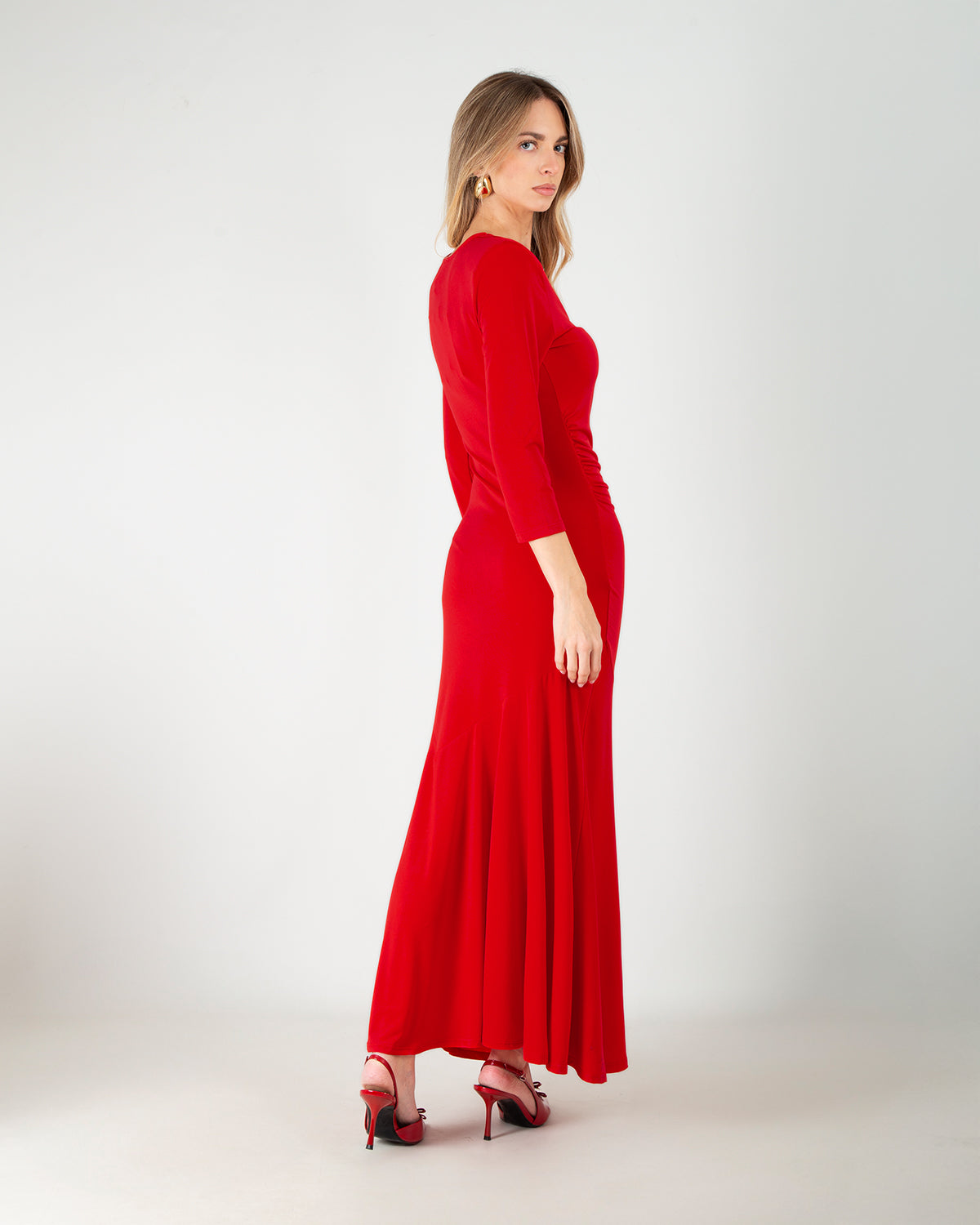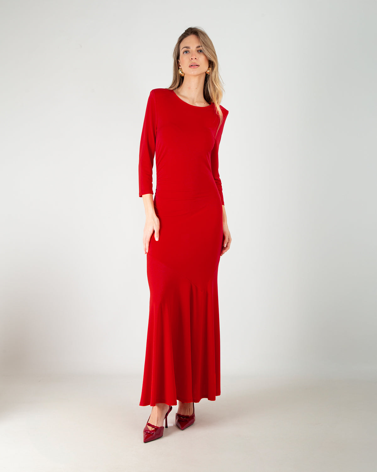 Dettagli: Abito lungo elegante. Scollo rotondo. Spalline imbottite. Maniche a tre quarti. Drappeggio laterale. Fondo morbido e svasato