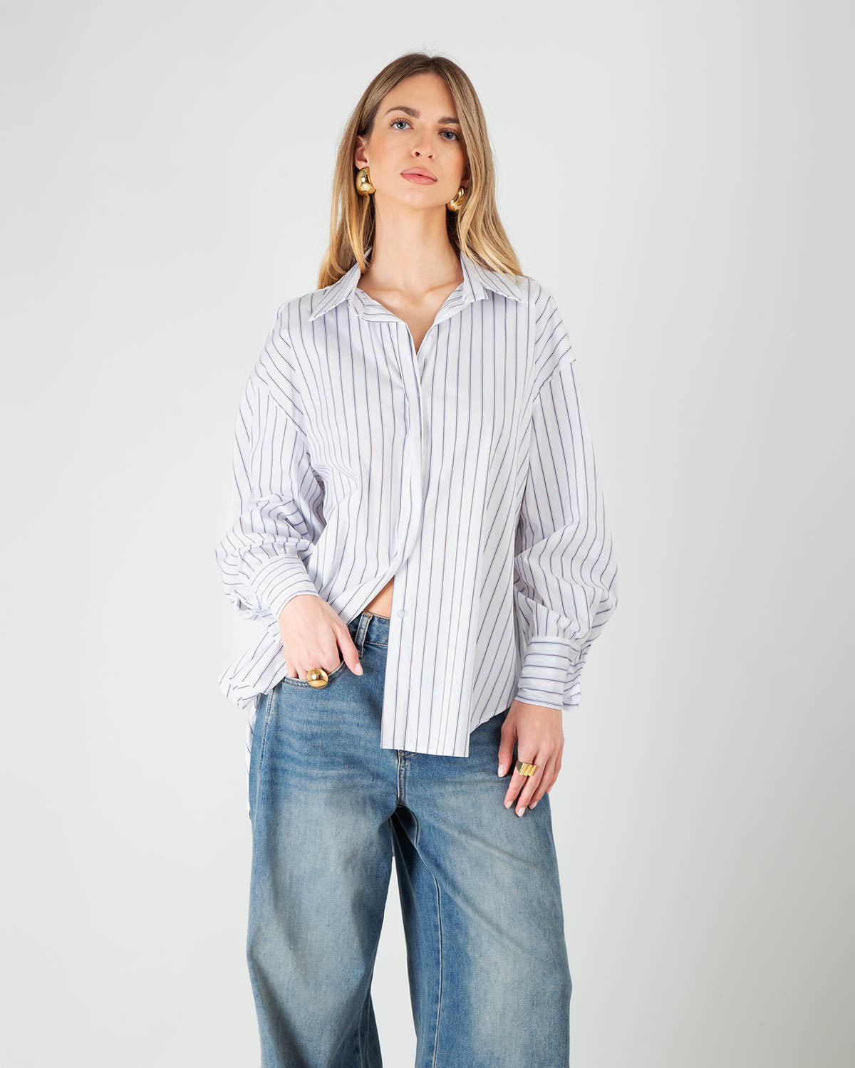 La classica camicia a righe si reinventa con dettagli che valorizzano la silhouette senza rinunciare al comfort. La vestibilità over dona un fit ampio e rilassato, mentre il fondo sagomato slancia la figura e rende il capo perfetto sia da indossare all’interno dei pantaloni che lasciato morbido all’esterno. Perfetta da indossare da sola o in layering sotto maglie leggere e blazer, per look da giorno eleganti e pratici.