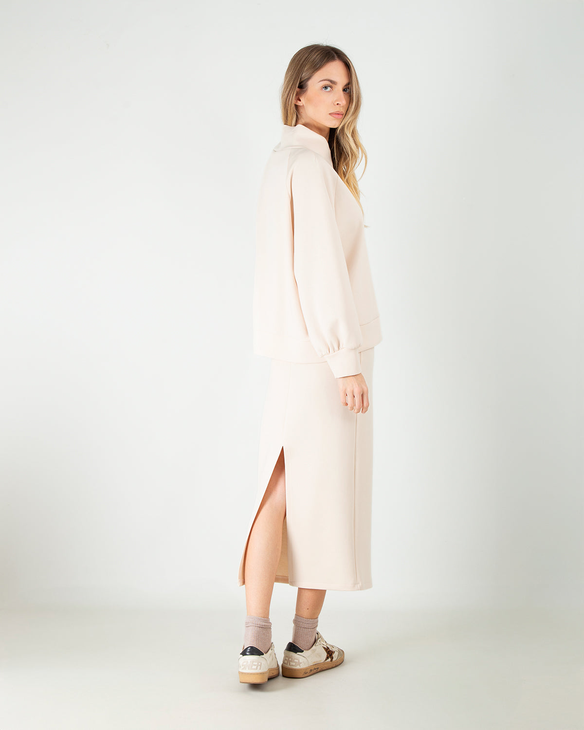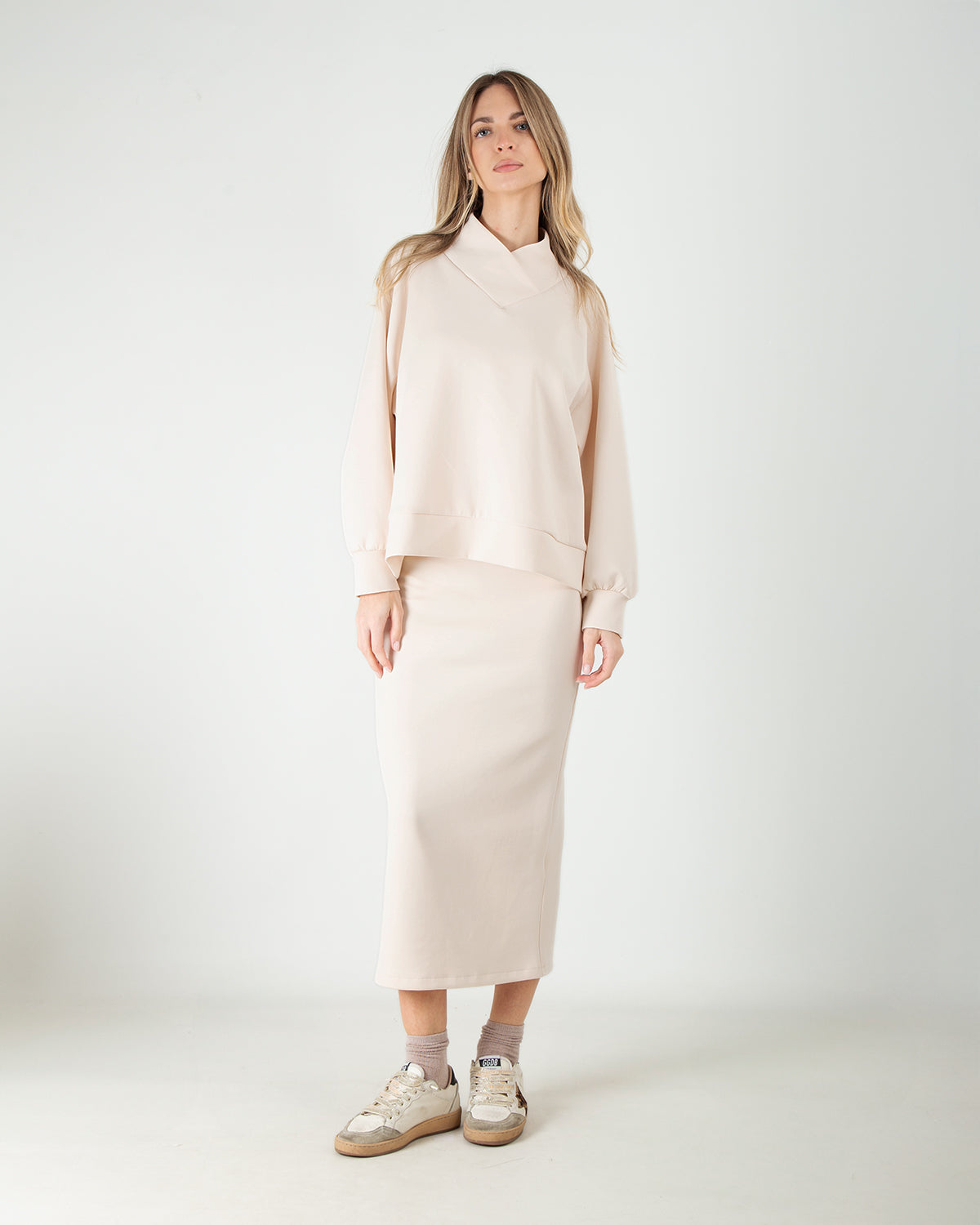 Questo set coordinato scuba in cotone è pensato per chi ama uno stile pulito, elegante e versatile. La felpa con scollo a V valorizza la parte superiore con discrezione, mentre le maniche leggermente a palloncino aggiungono un tocco femminile e attuale. La gonna longuette scuba in cotone completa il look con una linea classica e ordinata, impreziosita da un piccolo spacco sul retro che facilita il movimento e dona leggerezza alla silhouette. Un completo dalla linea pulita e senza tempo, ideale da indossare insieme per un look coordinato oppure separatamente per creare abbinamenti sempre nuovi, perfetto sia per il giorno che per occasioni più curate.