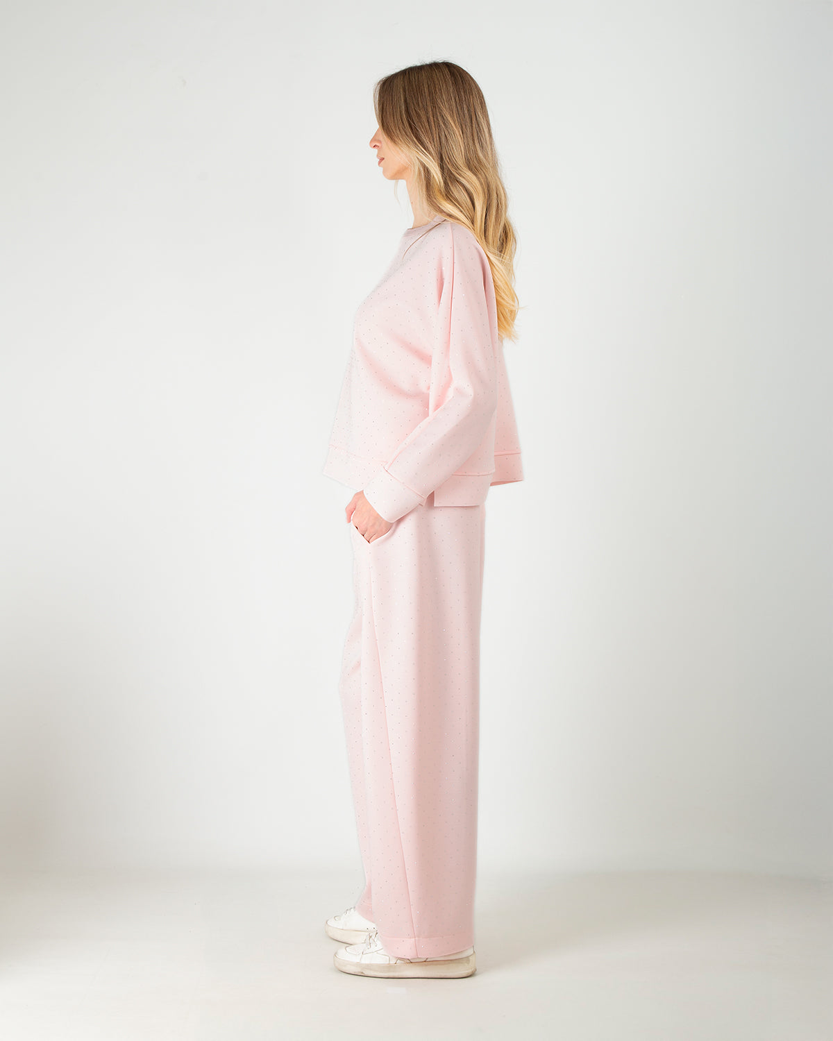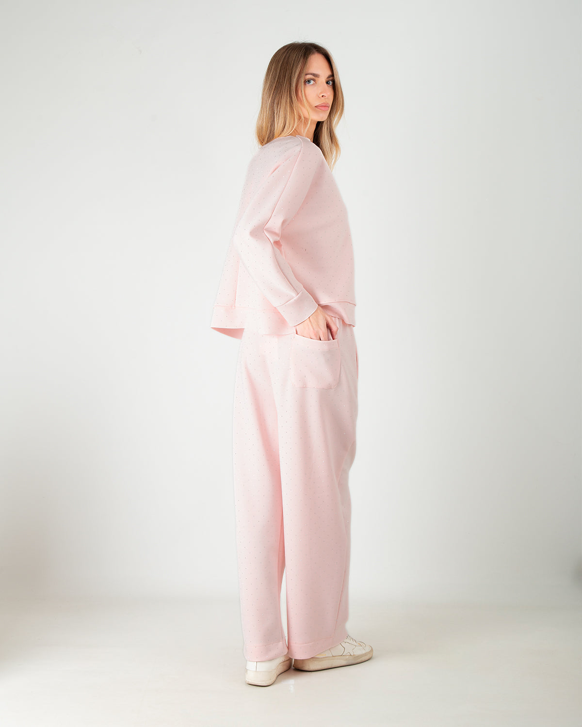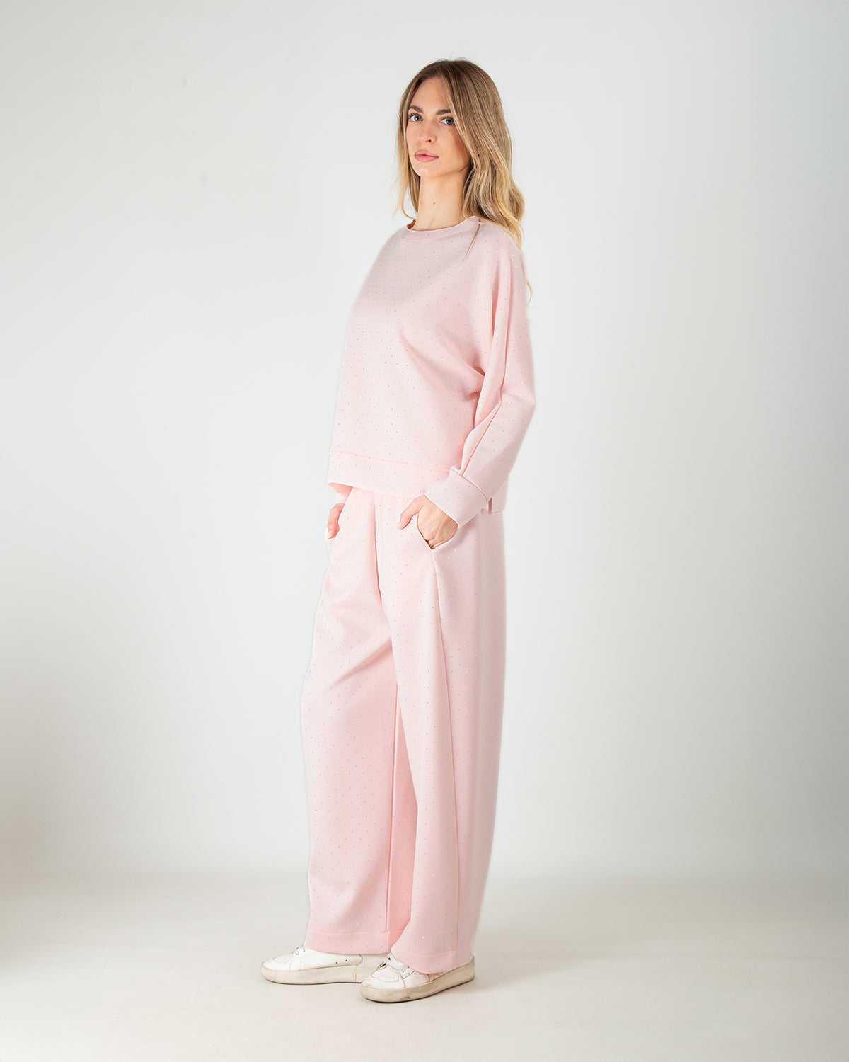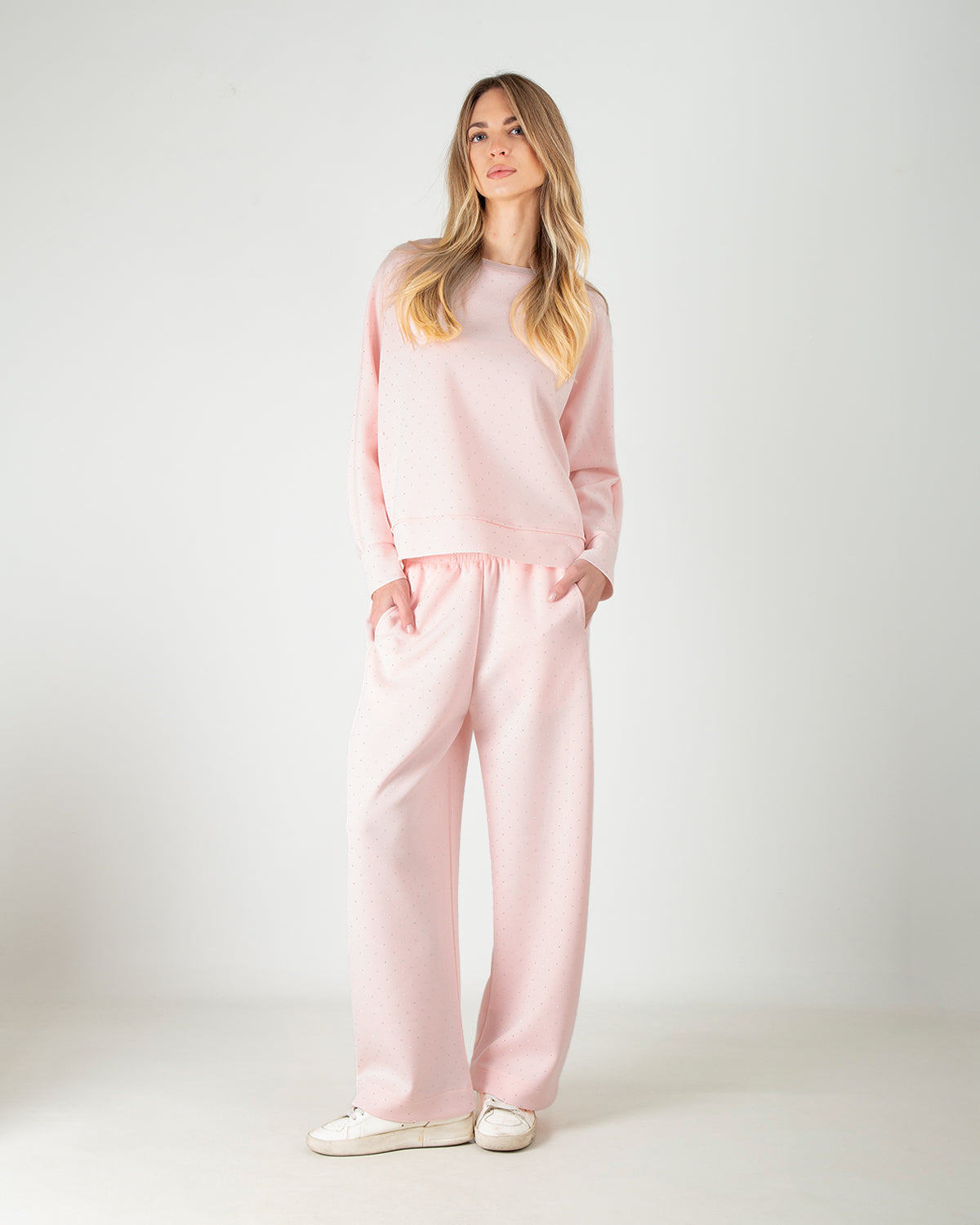La nostra tuta scuba must have, uno dei capi più amati, ritorna in una nuova versione impreziosita da strass che donano luce e carattere al look. Pensata per la donna che ama unire stile e funzionalità con un’attitudine decisa, questa tuta interpreta alla perfezione l’equilibrio tra sporty e sofisticato. Realizzata in tessuto scuba compatto e leggermente strutturato, mantiene una straordinaria morbidezza al tatto. L’elasticità multidirezionale accompagna la figura con naturalezza, garantendo comfort e vestibilità su diverse corporature. Il completo è composto da felpa crop dalla linea oversize e pantalone baggy dal taglio rilassato: la felpa si appoggia delicatamente sul punto vita, mentre il pantalone scivola morbido sulle gambe. I dettagli di strass aggiungono un tocco luminoso e contemporaneo, rendendo il set ancora più speciale.