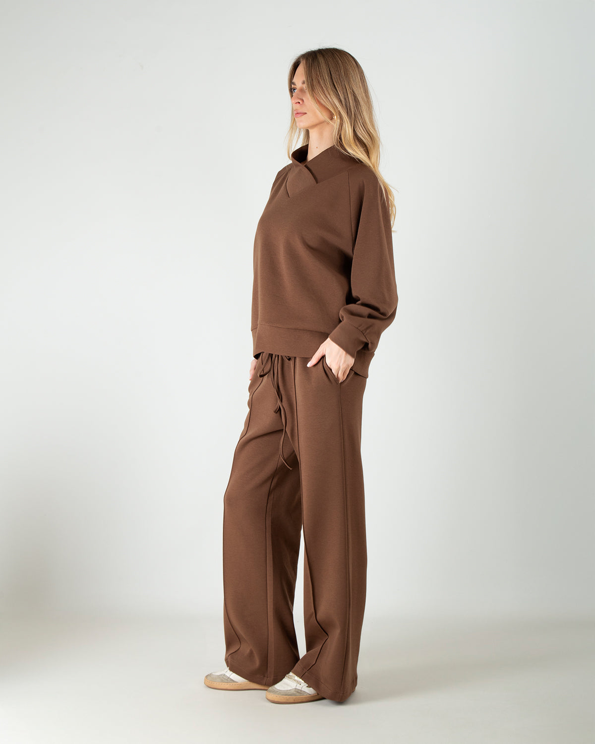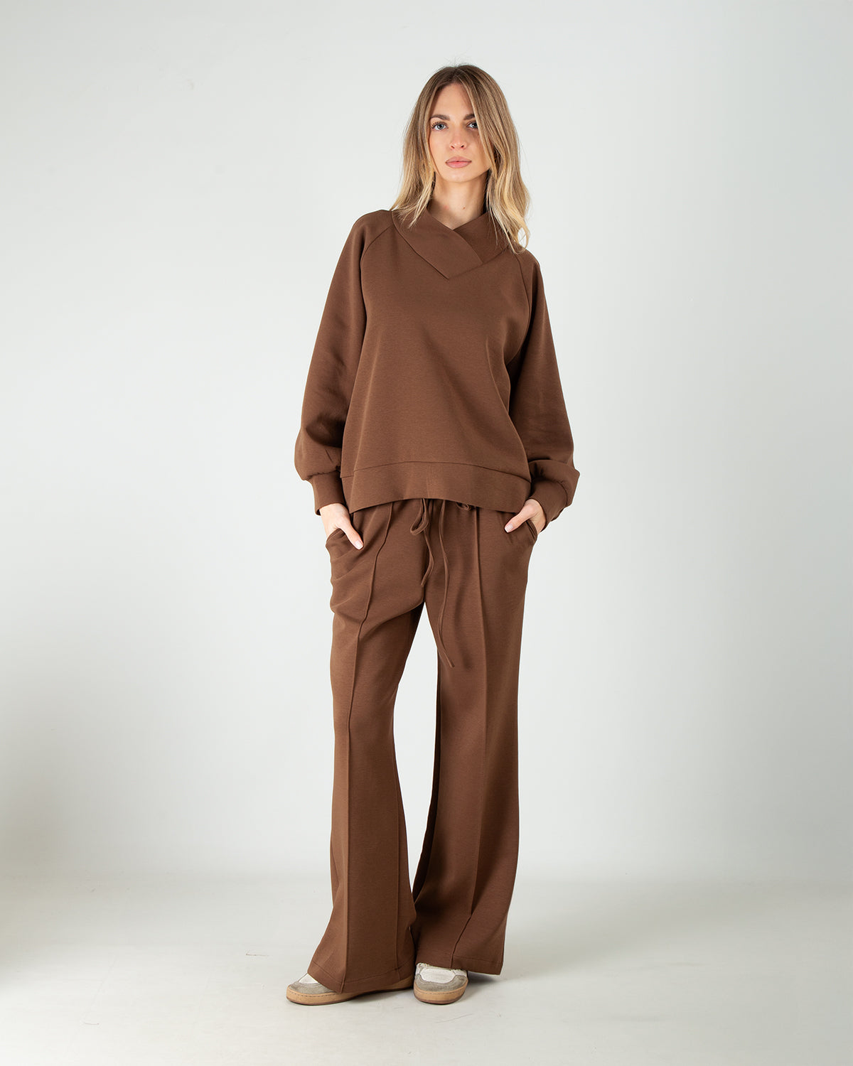 Dettagli: Set coordinato in scuba di cotone. Felpa con scollo a V. Maniche leggermente a palloncino. Pantalone con elastico in vita e coulisse. Cucitura centrale che slancia la figura. Tasche laterali.
