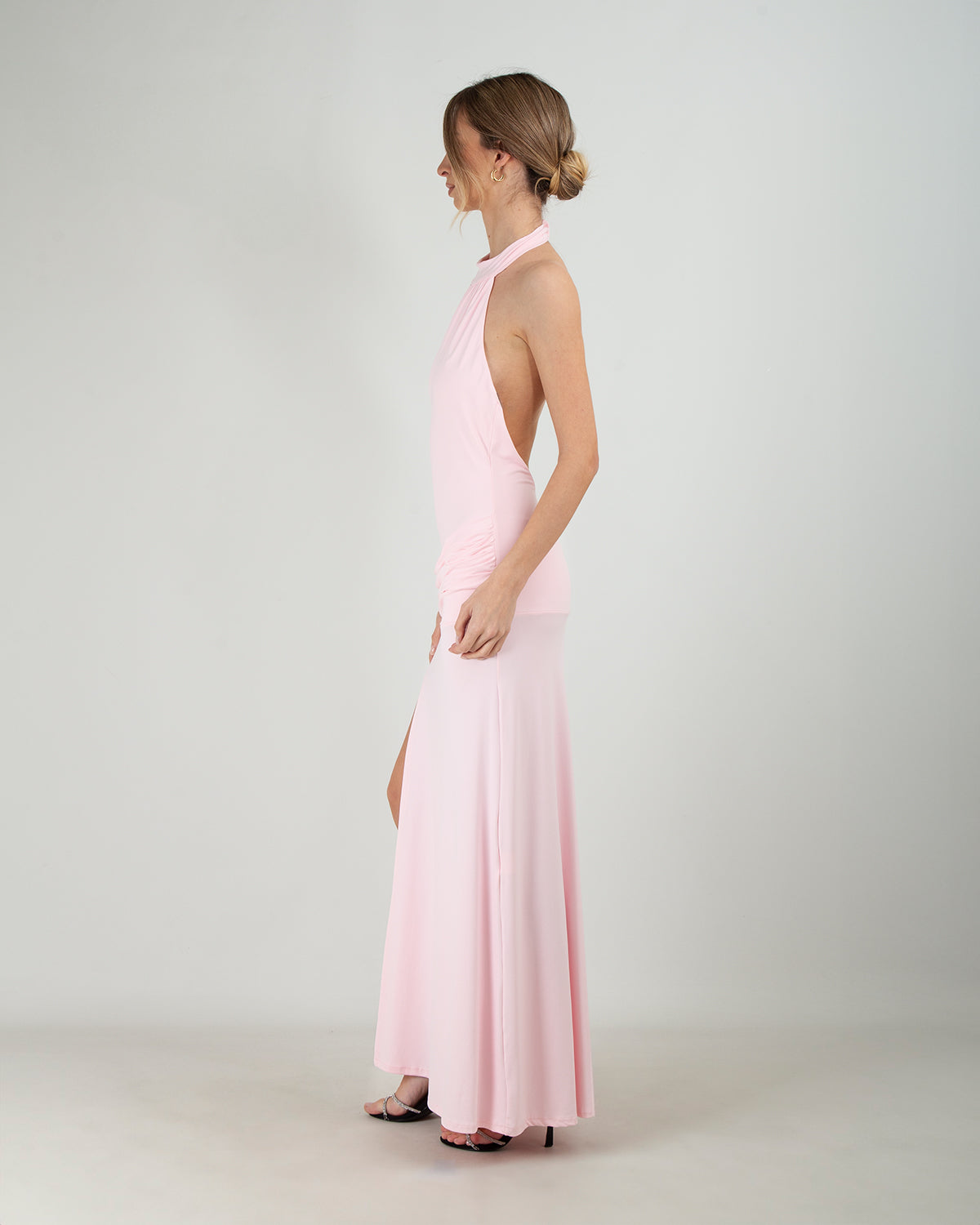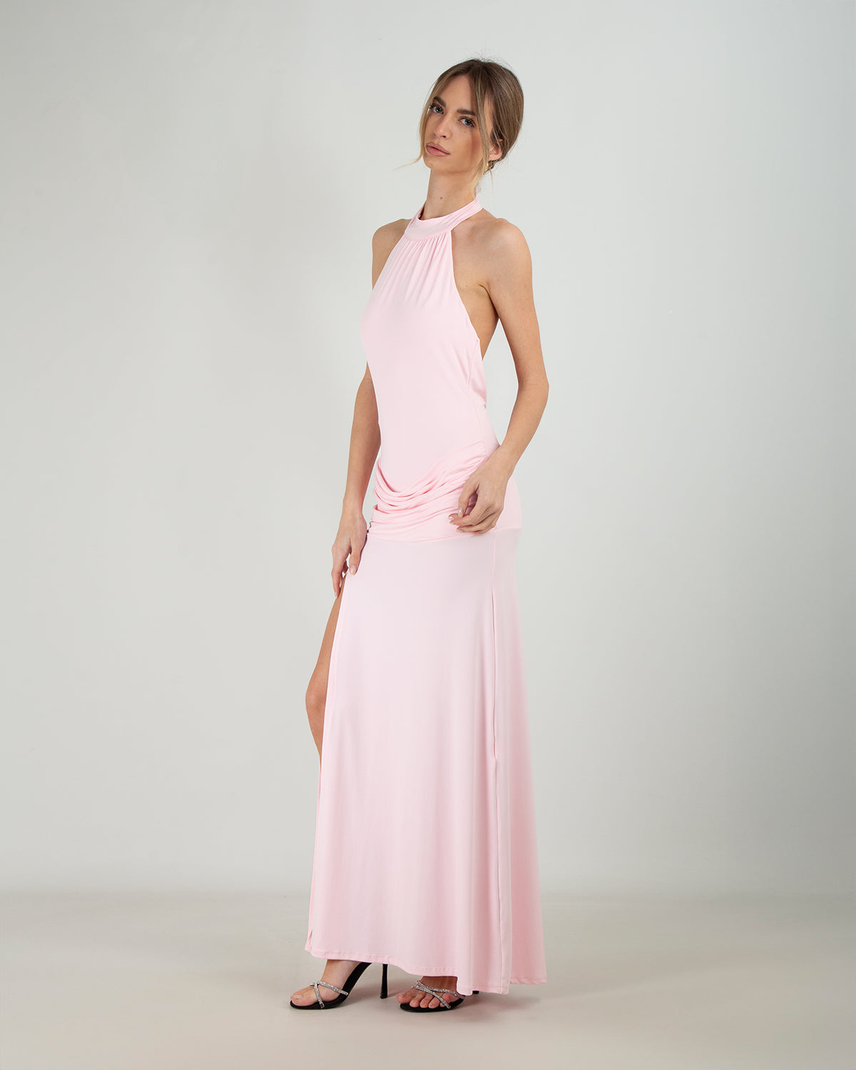 Dettagli: Abito lungo. Collo all’americana. Chiusura posteriore con bottoncini. Schiena scoperta. Drappeggio frontale. Spacco laterale. Elegante e femminile