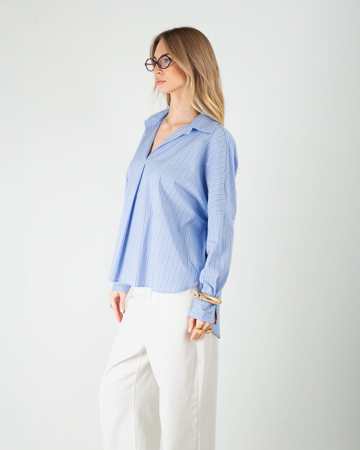 La classica camicia a righe si reinventa con dettagli che valorizzano la silhouette senza rinunciare al comfort. La vestibilità over dona un fit ampio e rilassato, mentre il fondo sagomato slancia la figura e rende il capo perfetto sia da indossare all’interno dei pantaloni che lasciato morbido all’esterno. Perfetta da indossare da sola o in layering sotto maglie leggere e blazer, per look da giorno eleganti e pratici.