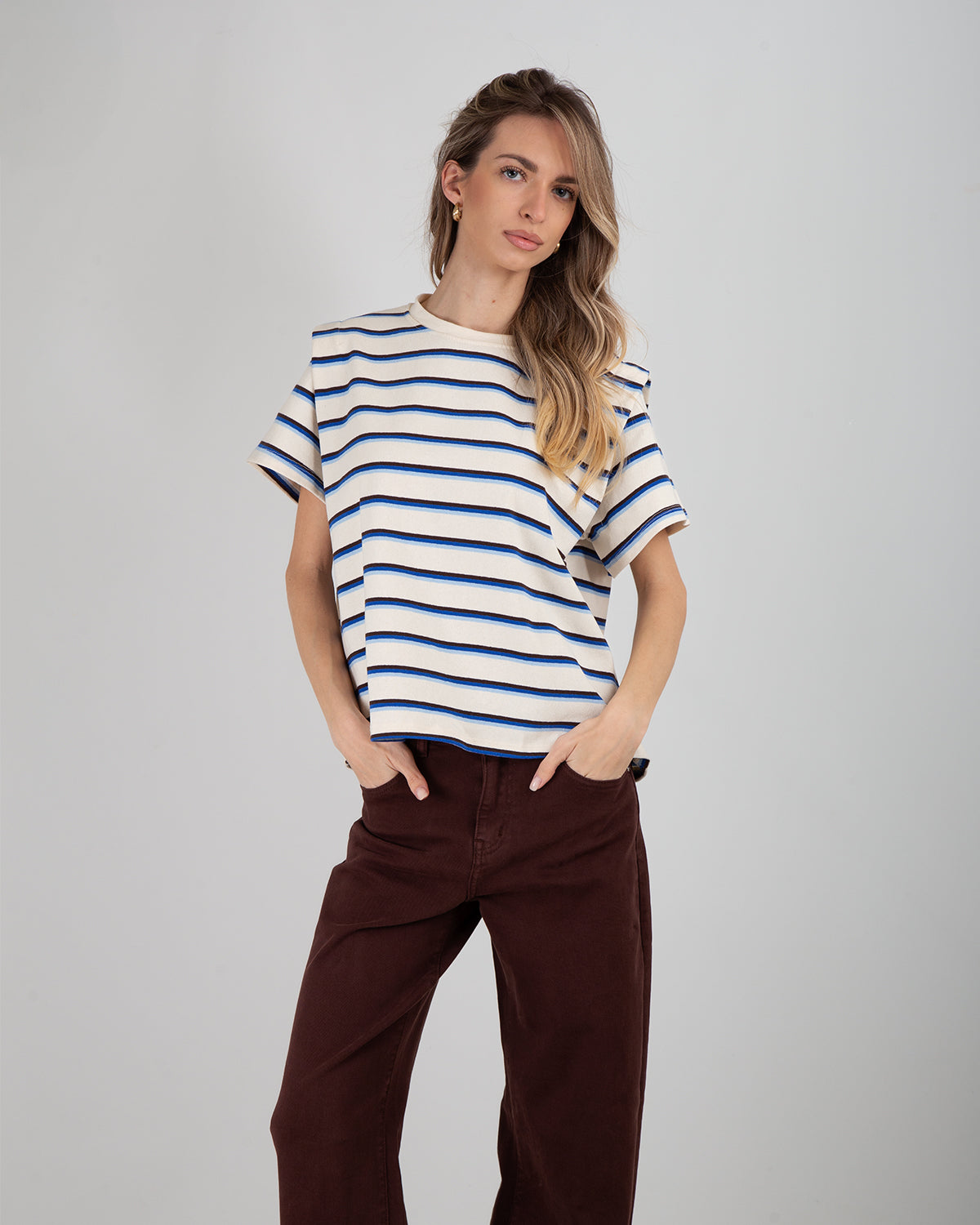 Dettagli: T-shirt in cotone. Fantasia a righe. Manica corta. Dettaglio cucitura sulla manica. Vestibilità over. Stile casual e contemporaneo