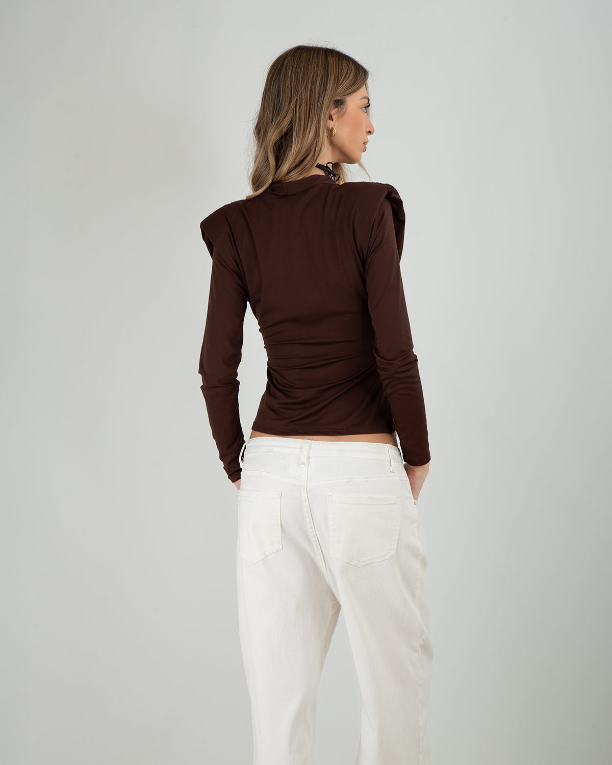 Il Top Incrociato è pensato per esaltare le forme con equilibrio e raffinatezza. La scollatura a V con incrocio frontale mette in risalto il décolleté in modo elegante, mentre le maniche lunghe bilanciano il design rendendolo perfetto anche per le stagioni più fresche. Le spalline imbottite donano struttura alla parte superiore, definendo le spalle e creando una linea decisa e contemporanea. Il taglio fasciante sui fianchi valorizza il punto vita e accompagna la figura con femminilità. Un capo ideale per occasioni eleganti, serate speciali o da abbinare a pantaloni sartoriali e gonne per un look sofisticato e moderno.
