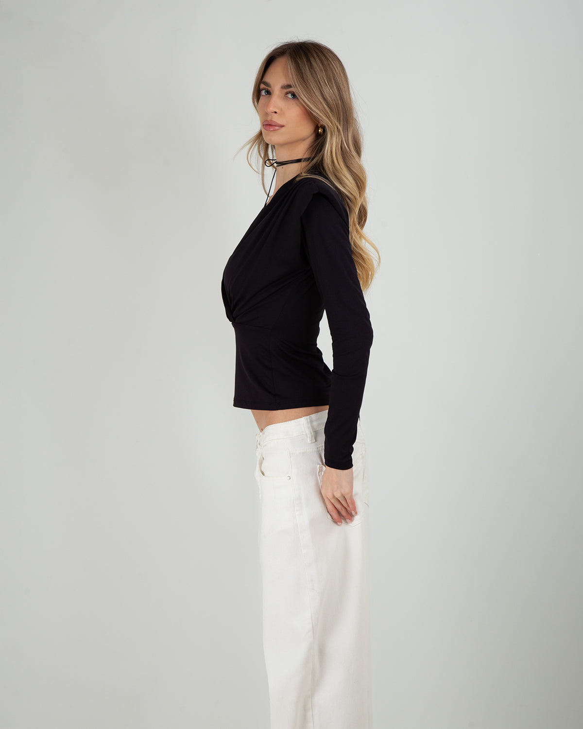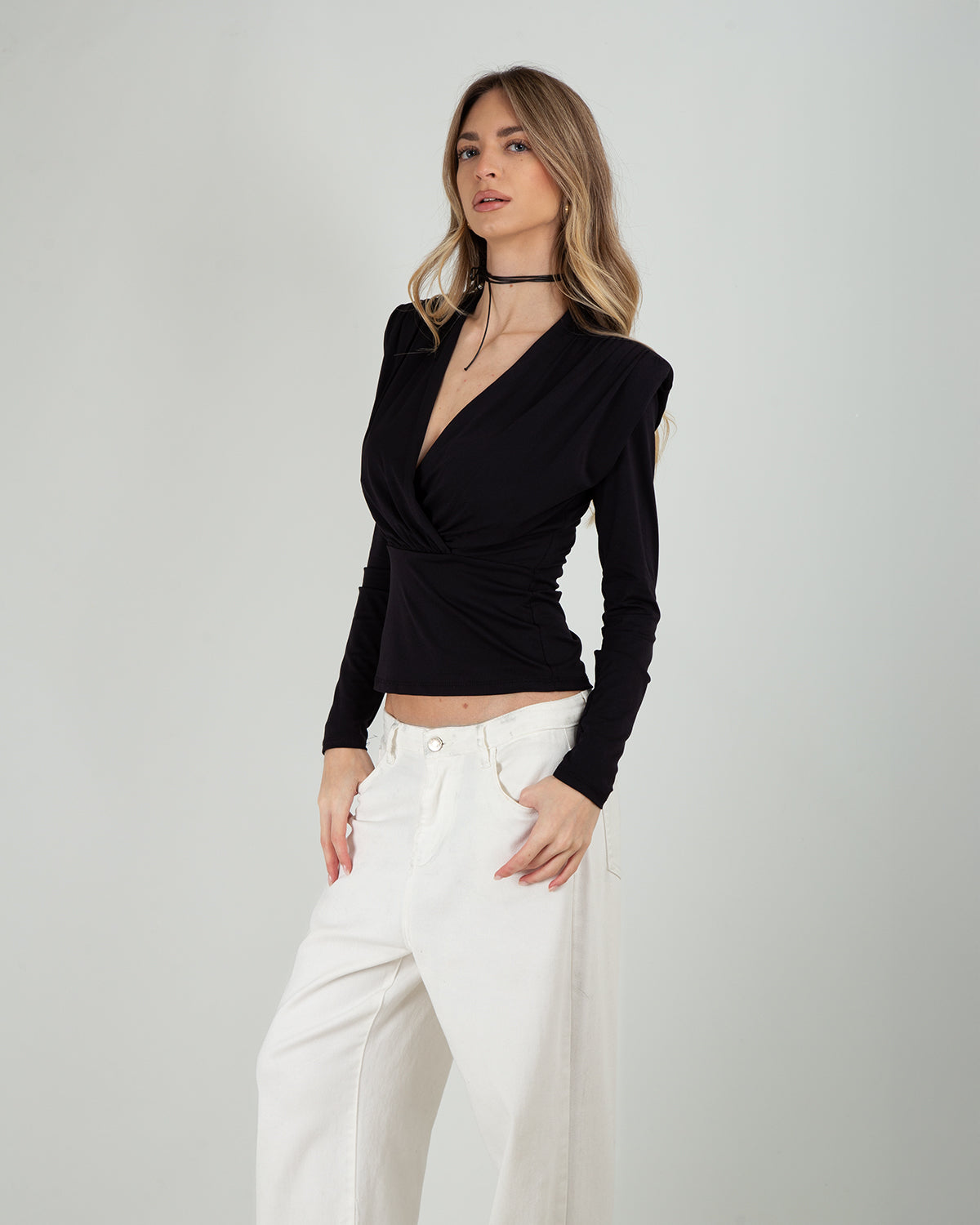 Dettagli: Top con incrocio frontale. Scollatura a V. Maniche lunghe. Spalline imbottite. Elegante e femminile