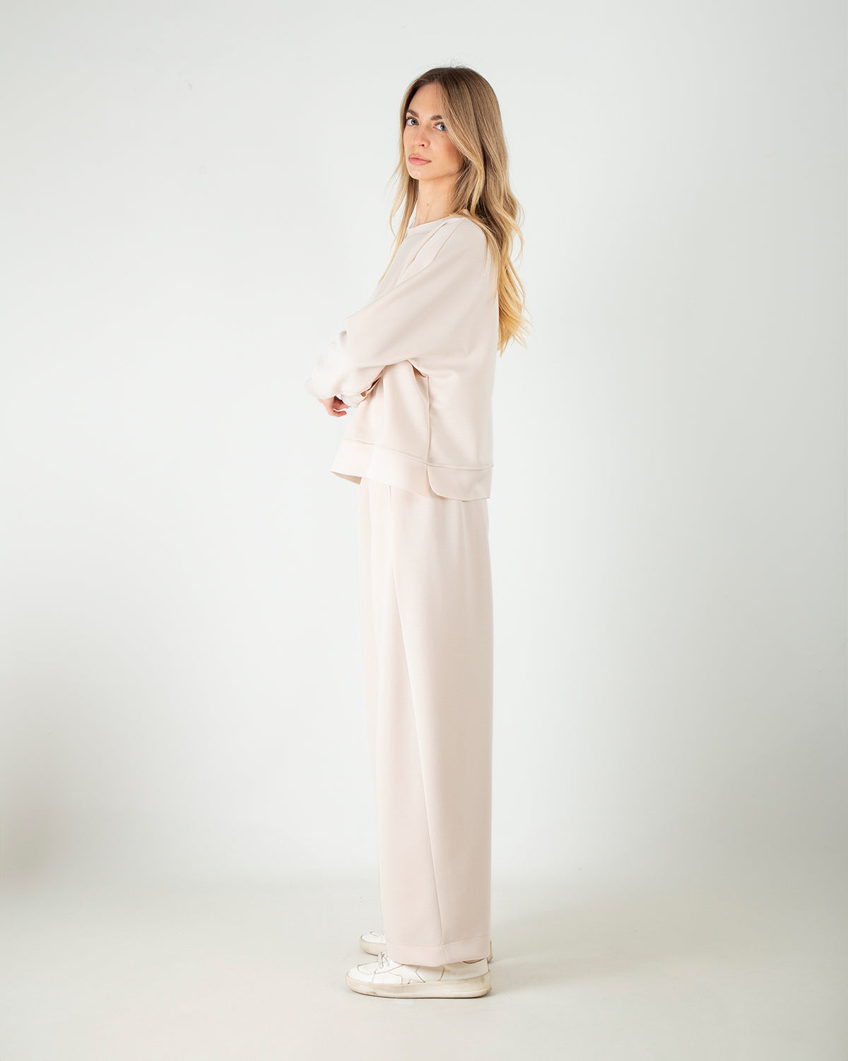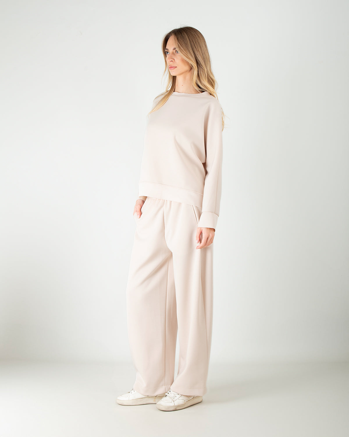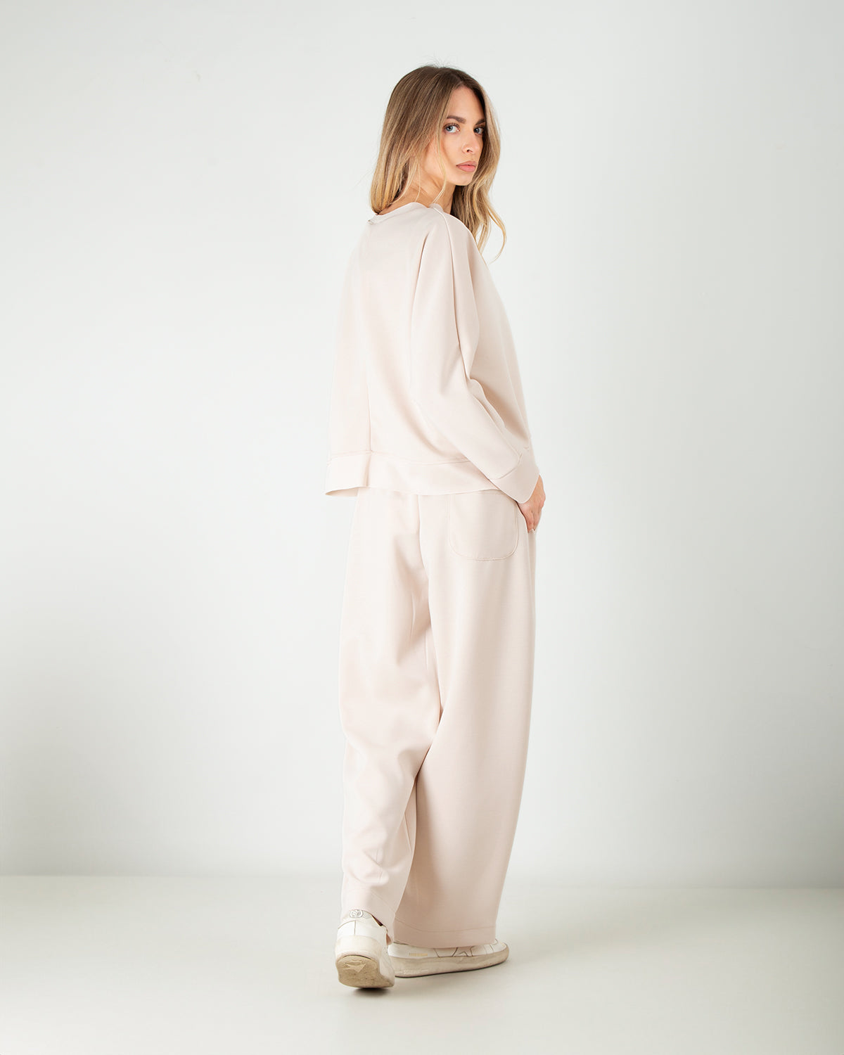 Dettagli: Tessuto scuba tecnico: struttura double-knit, liscio fuori, morbido dentro. Felpa over crop con scollo girocollo e spalle scese. Pantalone baggy con vita elasticizzata e tasche laterali a filo. Tasca posteriore discreta e funzionale. Silhouette morbida, look sporty chic.
