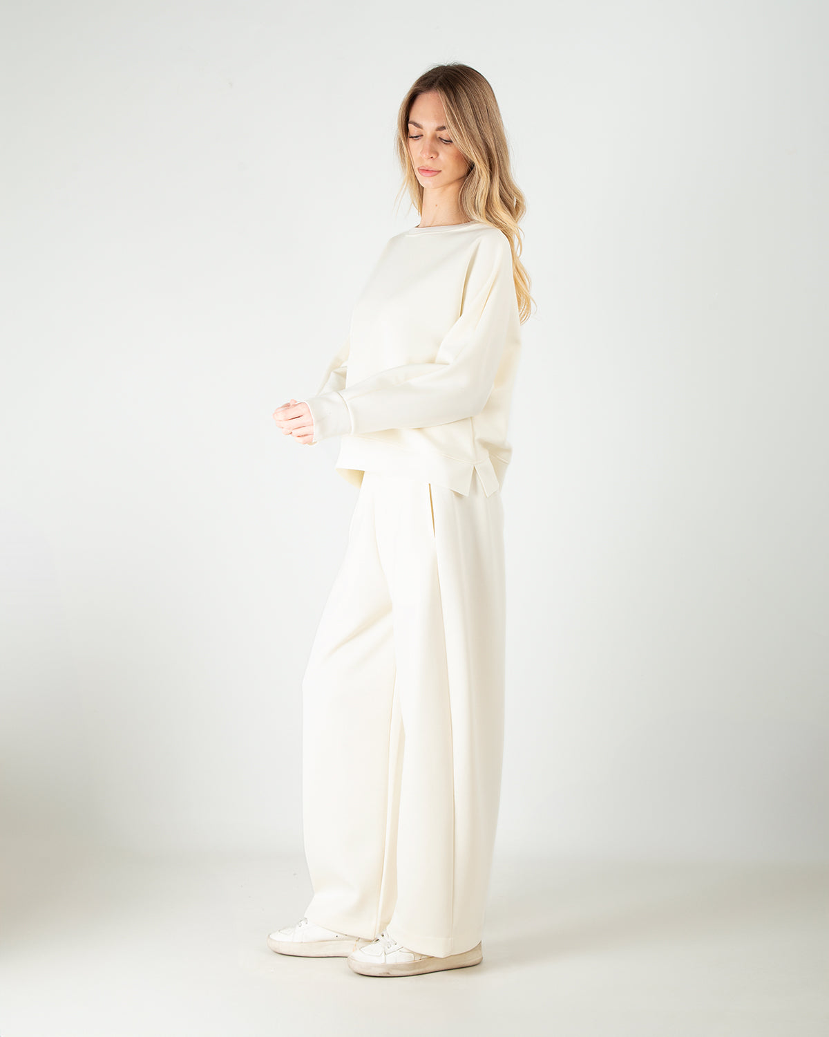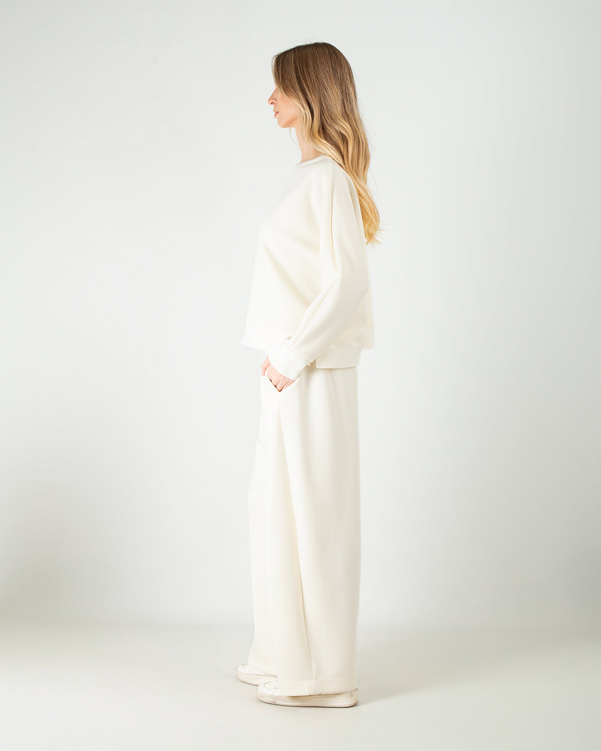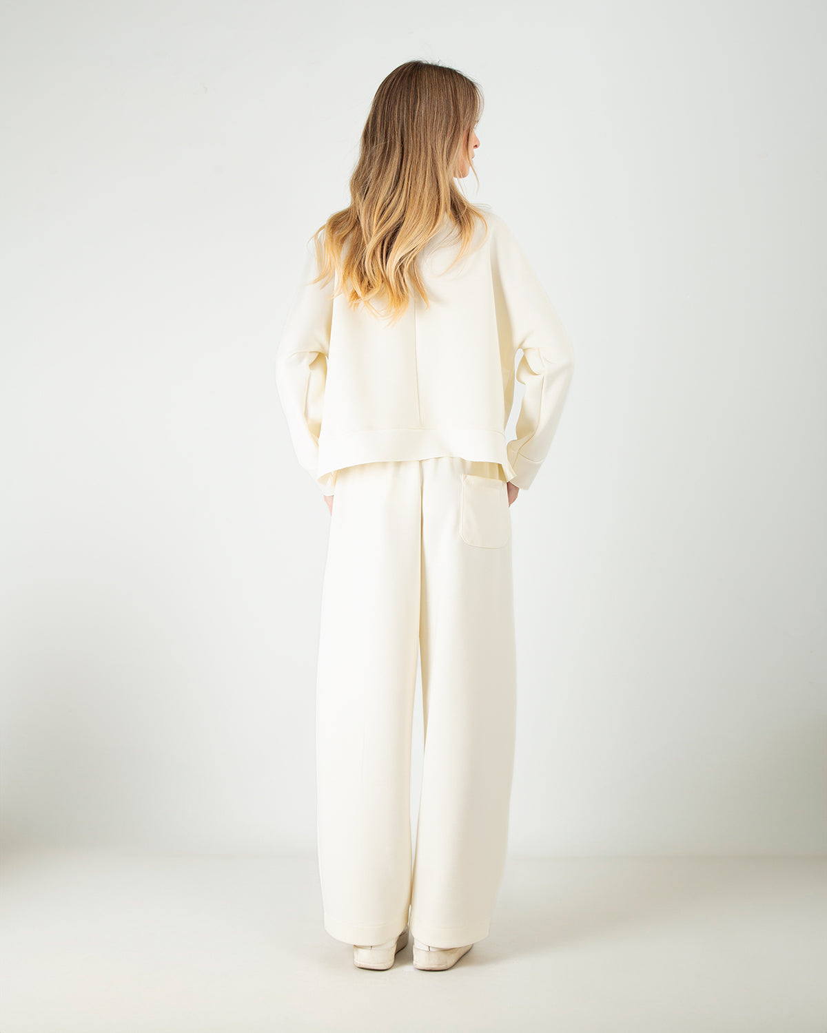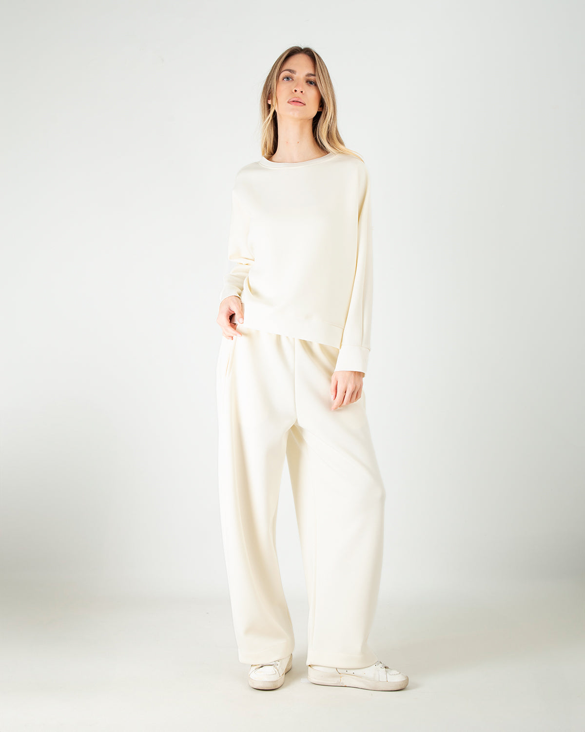 Dettagli: Tessuto scuba tecnico: struttura double-knit, liscio fuori, morbido dentro. Felpa over crop con scollo girocollo e spalle scese. Pantalone baggy con vita elasticizzata e tasche laterali a filo. Tasca posteriore discreta e funzionale. Silhouette morbida, look sporty chic.