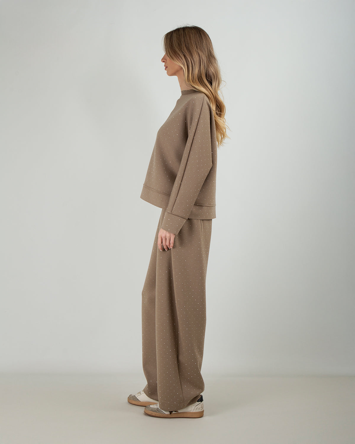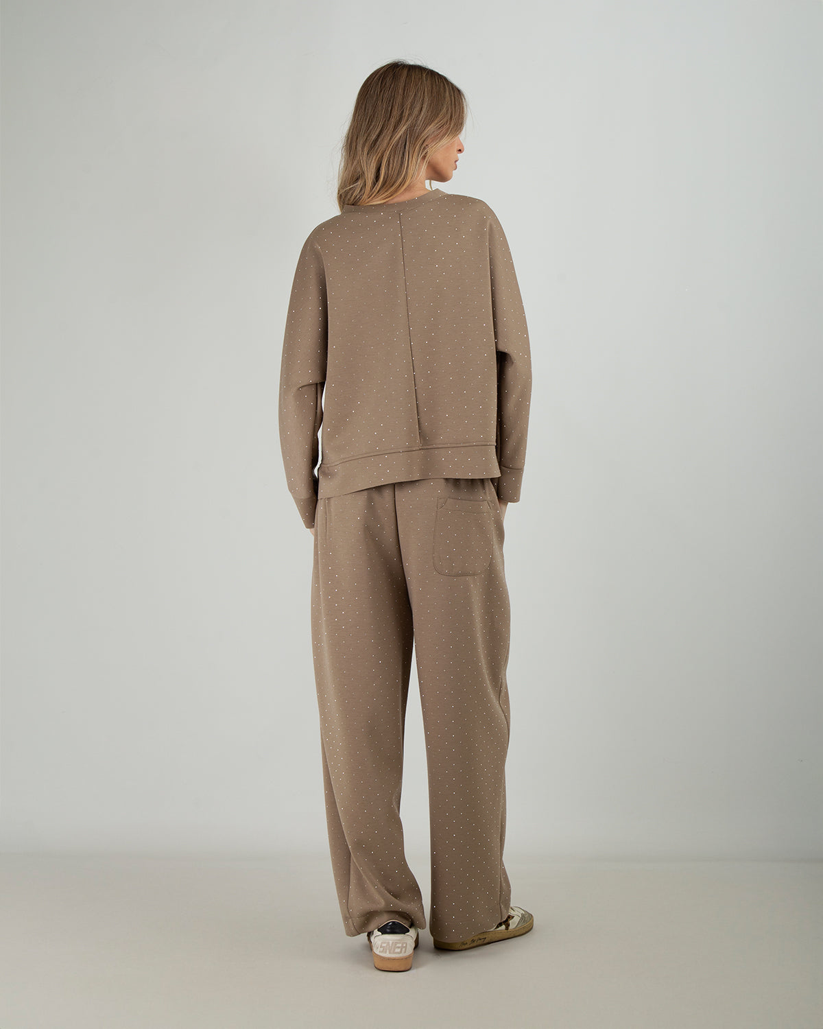 La nostra tuta scuba must have, uno dei capi più amati, ritorna in una nuova versione impreziosita da strass che donano luce e carattere al look. Pensata per la donna che ama unire stile e funzionalità con un’attitudine decisa, questa tuta interpreta alla perfezione l’equilibrio tra sporty e sofisticato. Realizzata in tessuto scuba compatto e leggermente strutturato, mantiene una straordinaria morbidezza al tatto. L’elasticità multidirezionale accompagna la figura con naturalezza, garantendo comfort e vestibilità su diverse corporature. Il completo è composto da felpa crop dalla linea oversize e pantalone baggy dal taglio rilassato: la felpa si appoggia delicatamente sul punto vita, mentre il pantalone scivola morbido sulle gambe. I dettagli di strass aggiungono un tocco luminoso e contemporaneo, rendendo il set ancora più speciale.