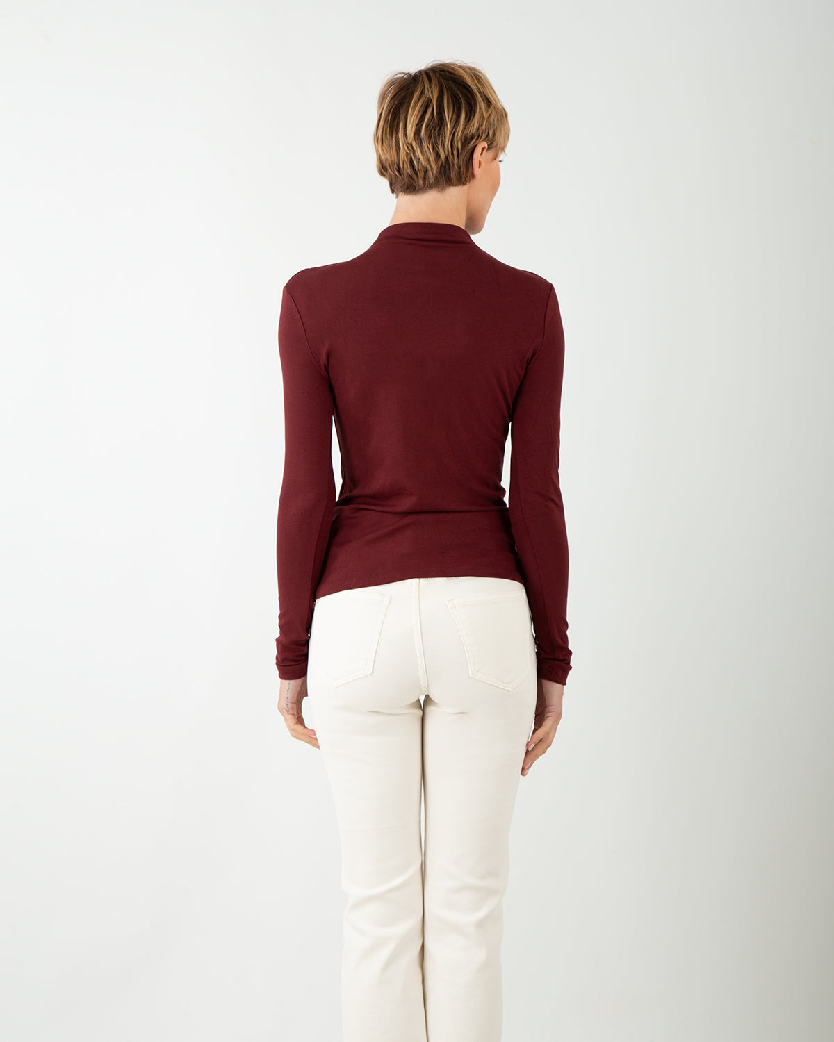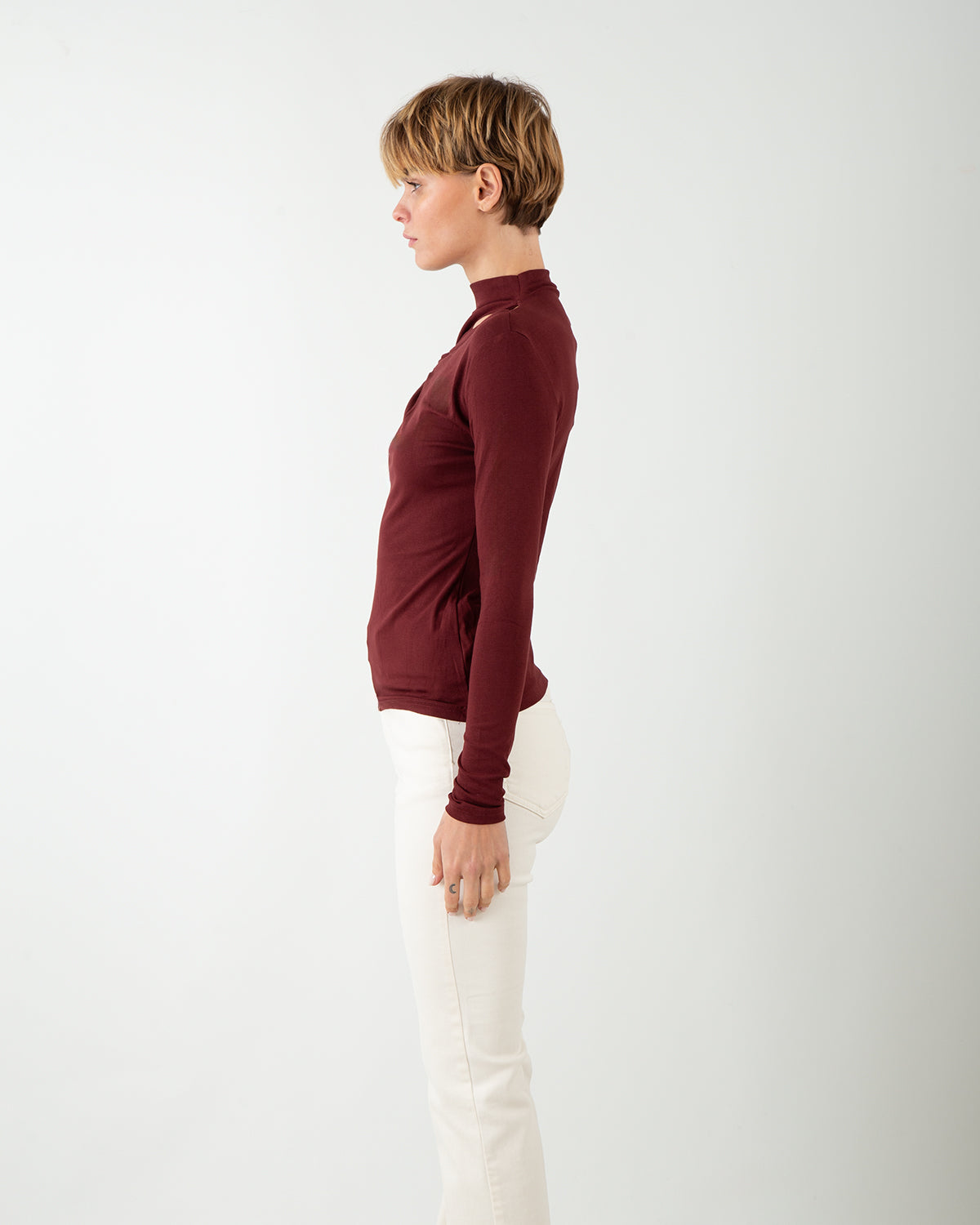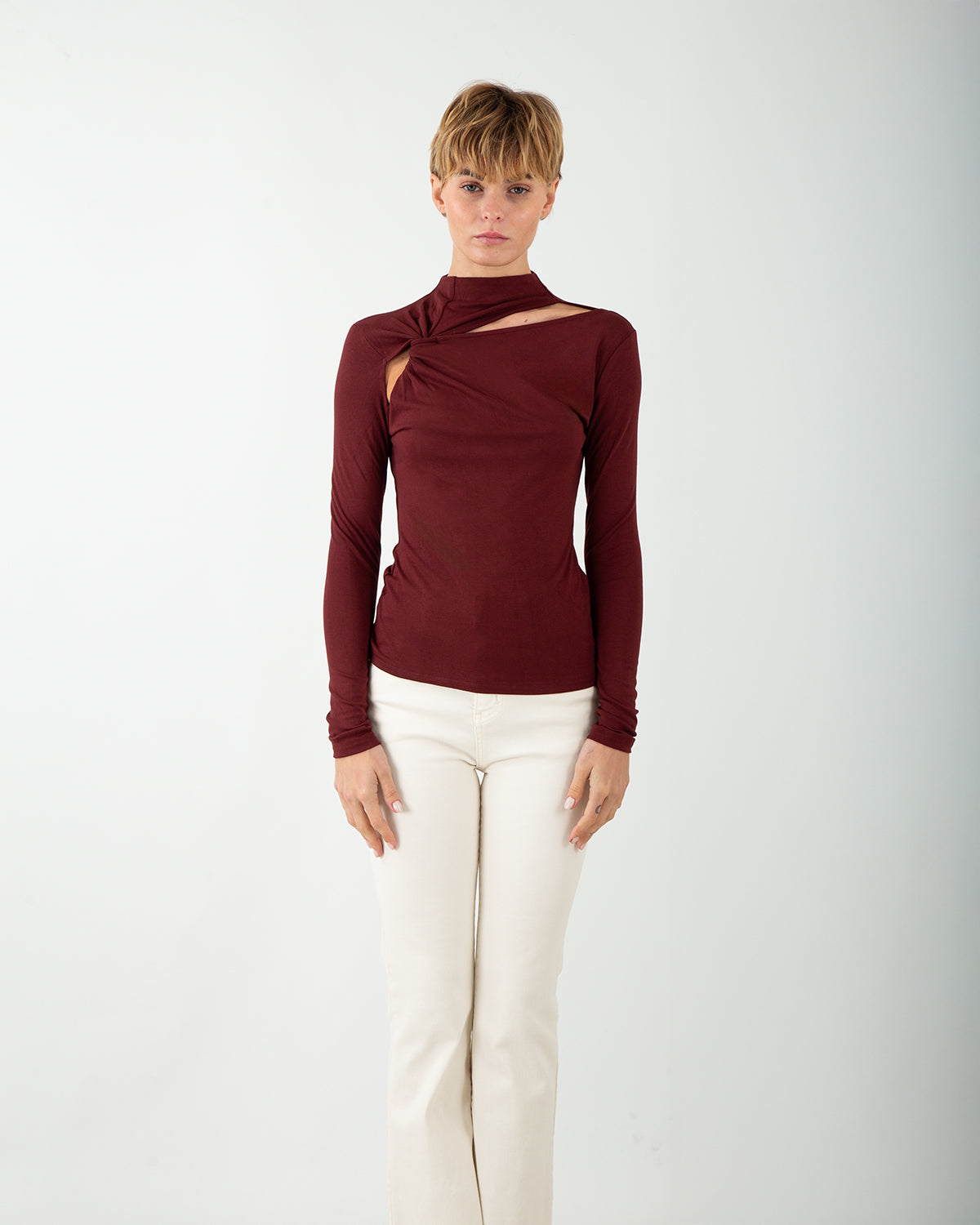 Realizzata in un morbido misto viscosa, questa maglia unisce comfort e sensualità in un design essenziale ma sofisticato. Il taglio aderente valorizza la figura, mentre il cut out con nodo sotto il collo aggiunge un tocco moderno e femminile. La tonalità bordeaux tinta unita la rende un capo versatile: perfetta sotto una giacca per un look raffinato da giorno, o da indossare da sola nelle serate più eleganti. Un piccolo dettaglio che trasforma un outfit in un gesto di stile.