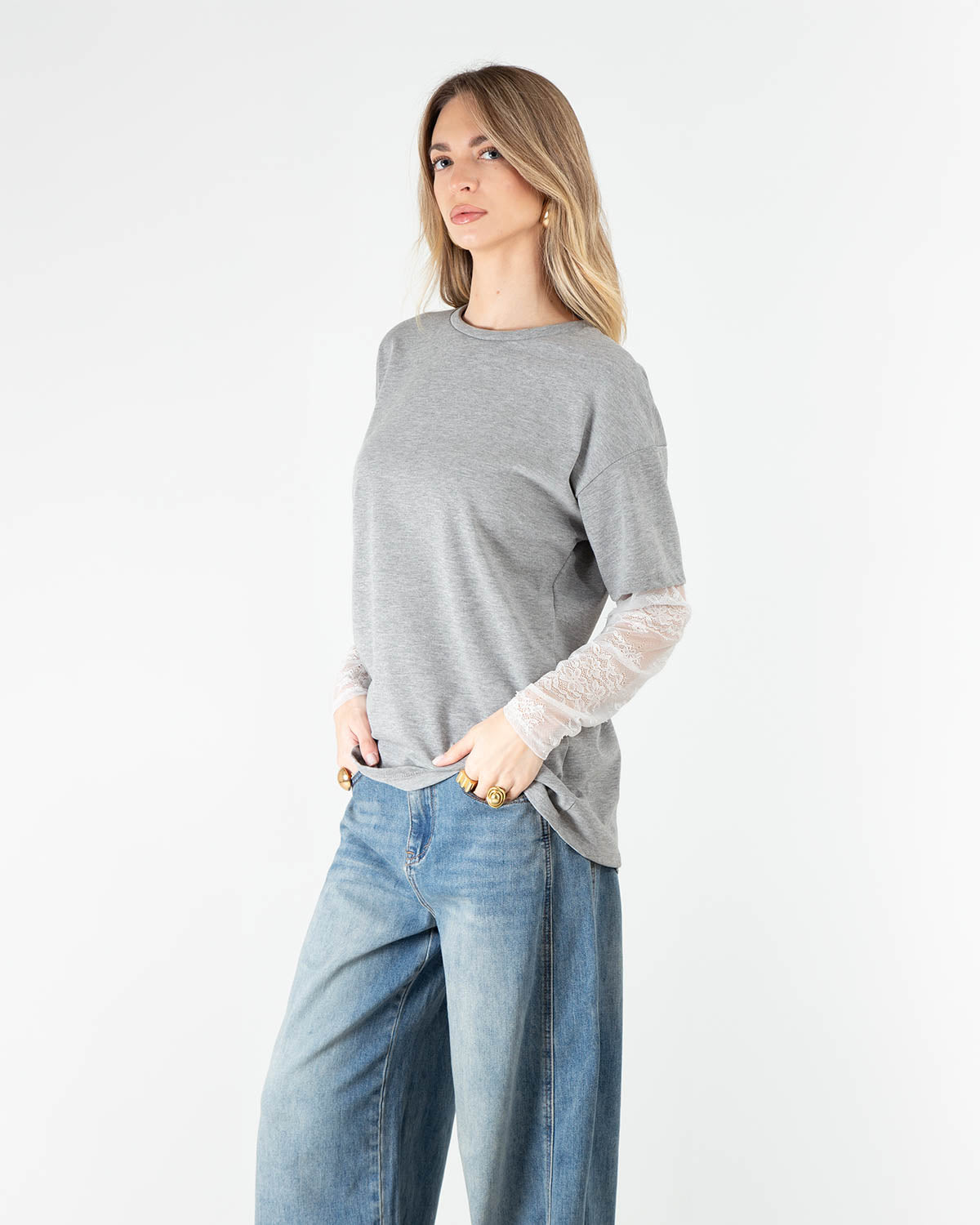Questa t-shirt realizzata in cotone morbido e traspirante, si distingue per le maniche lunghe in pizzo, che aggiungono un tocco raffinato e romantico al design essenziale. Perfetta da indossare da sola per un look femminile ma rilassato, oppure sotto blazer, cardigan o giacche per valorizzare outfit da giorno o da sera con un dettaglio elegante che non passa inosservato.