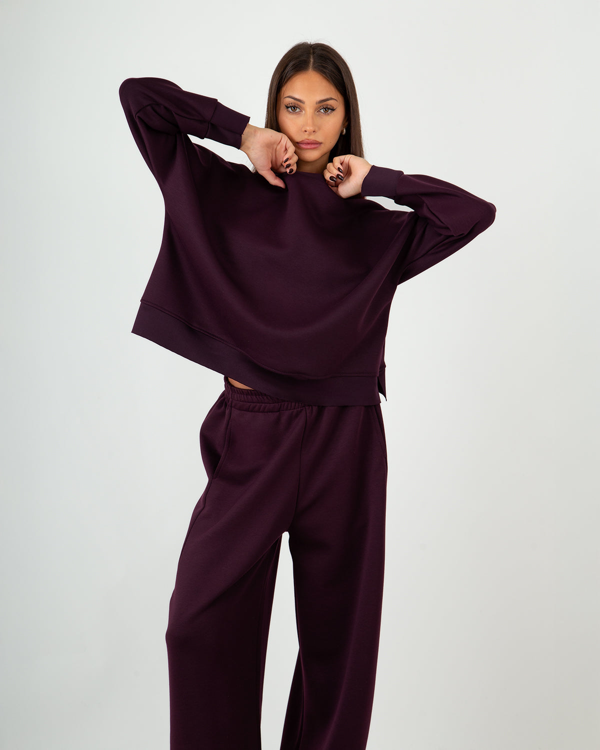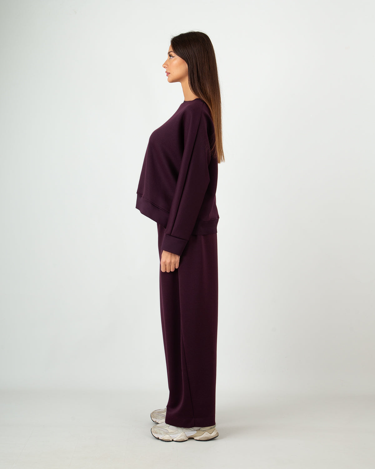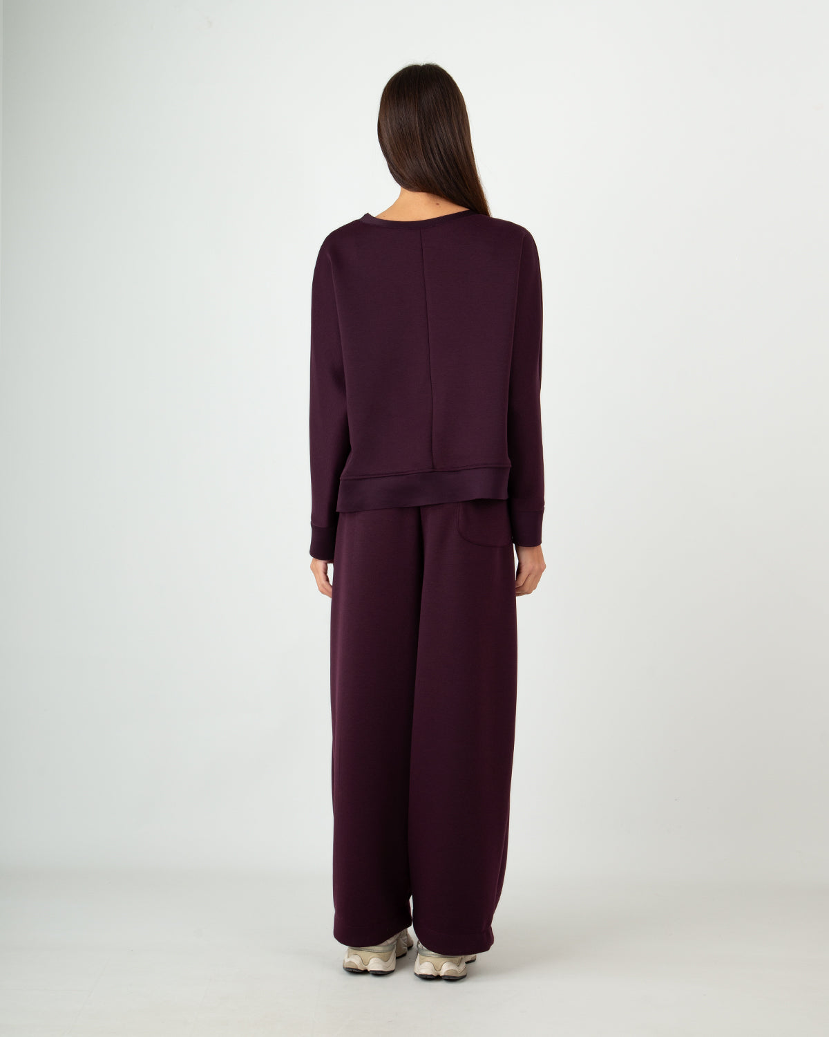 Dettagli: Tessuto scuba tecnico: struttura double-knit, liscio fuori, morbido dentro. Felpa over crop con scollo girocollo e spalle scese. Pantalone baggy con vita elasticizzata e tasche laterali a filo. Tasca posteriore discreta e funzionale. Silhouette morbida, look sporty chic.