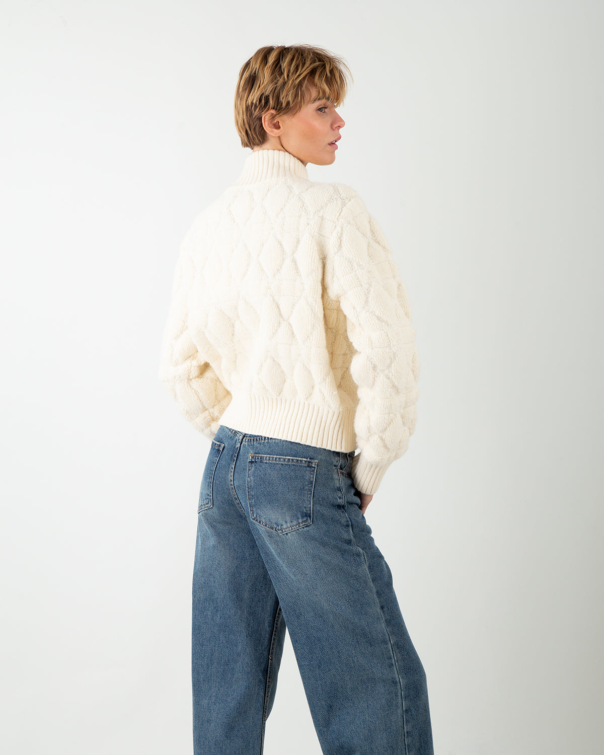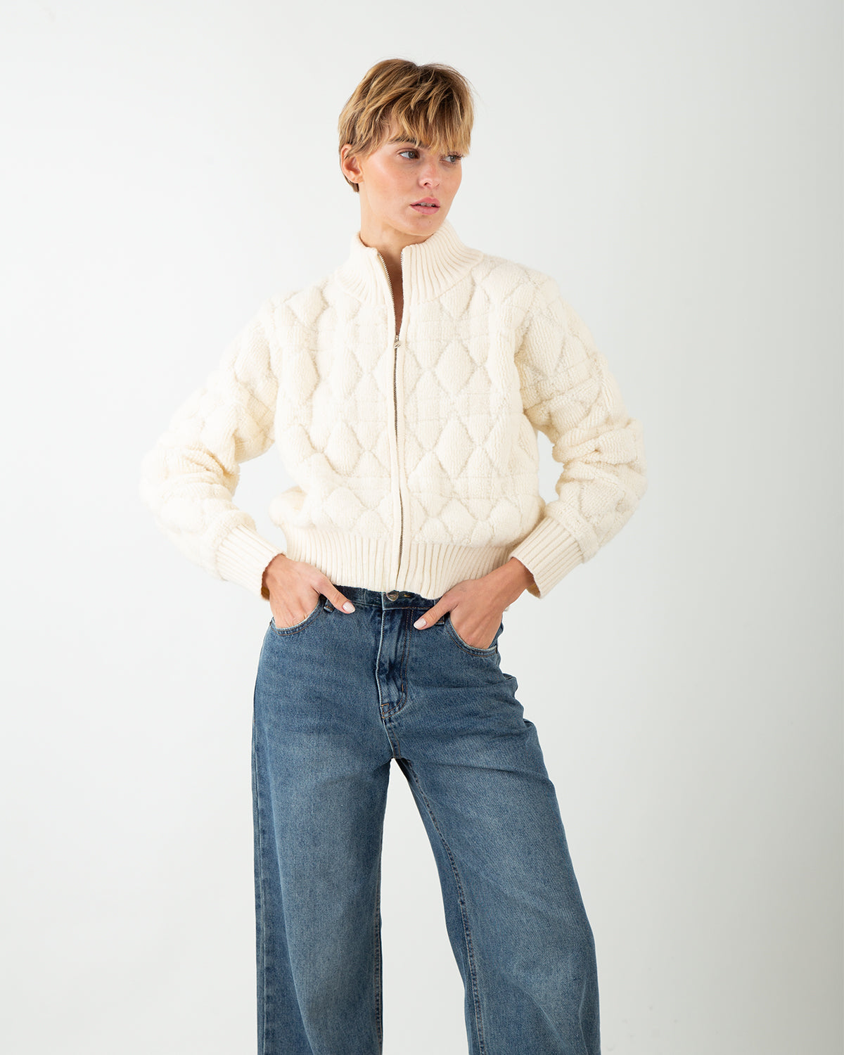 Un capo dallo spirito contemporaneo, perfetto per affrontare la stagione con stile. Questo bomber in maglia bouclé unisce la morbidezza e il calore del tessuto alla forza di un design moderno. La trama geometrica dona movimento e personalità, mentre i dettagli a costine su collo, polsini e fondo definiscono la silhouette con un tocco sporty-chic. La vestibilità leggermente over e la zip frontale completano un capo versatile e ricercato, ideale per aggiungere un accento moderno e raffinato ai look quotidiani.