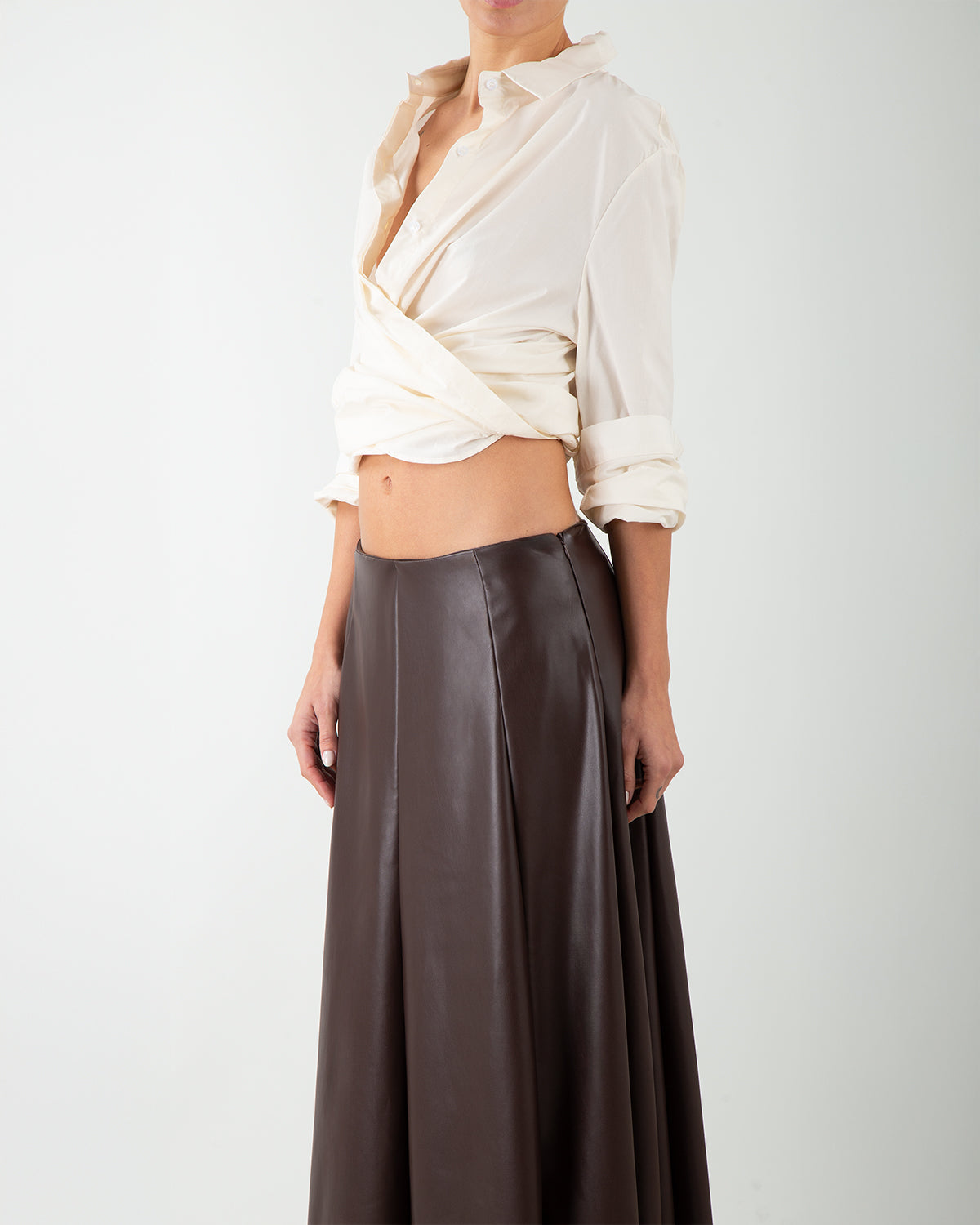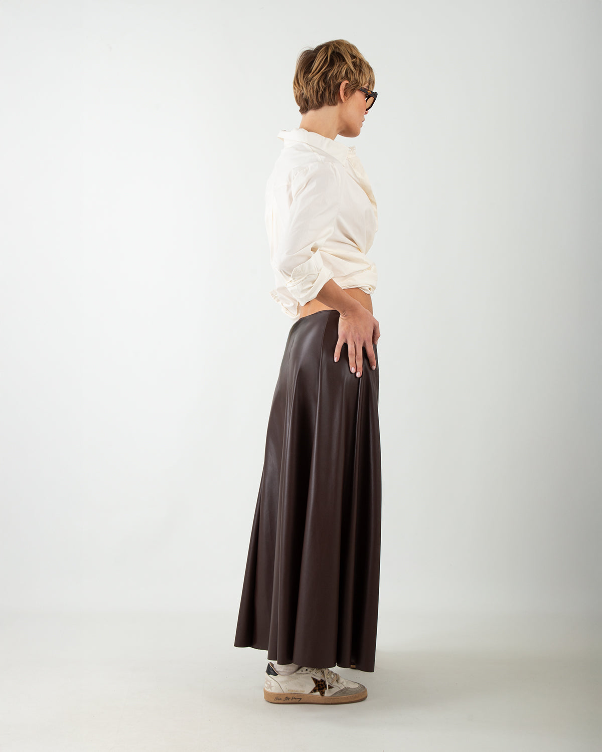 Ein Kleidungsstück mit starkem und vielseitigem Charakter, perfekt für die schicksten und lässigsten Looks. Dieser Rock in A-Linie aus Kunstleder schmiegt sich dank der Nähte, die die Taille markieren und die Silhouette verschlanken, sanft an die Figur an. Der unsichtbare seitliche Reißverschluss garantiert ein sauberes und raffiniertes Design, während die weiche Innenseite für Komfort und ein angenehmes Tragegefühl sorgt. Kombinieren Sie ihn mit einer eleganten Bluse für ein formelles Outfit oder mit einem Maxipullover und Turnschuhen für einen moderneren Look. Dieser Rock vereint Weiblichkeit und Stil, ohne auf Funktionalität zu verzichten.