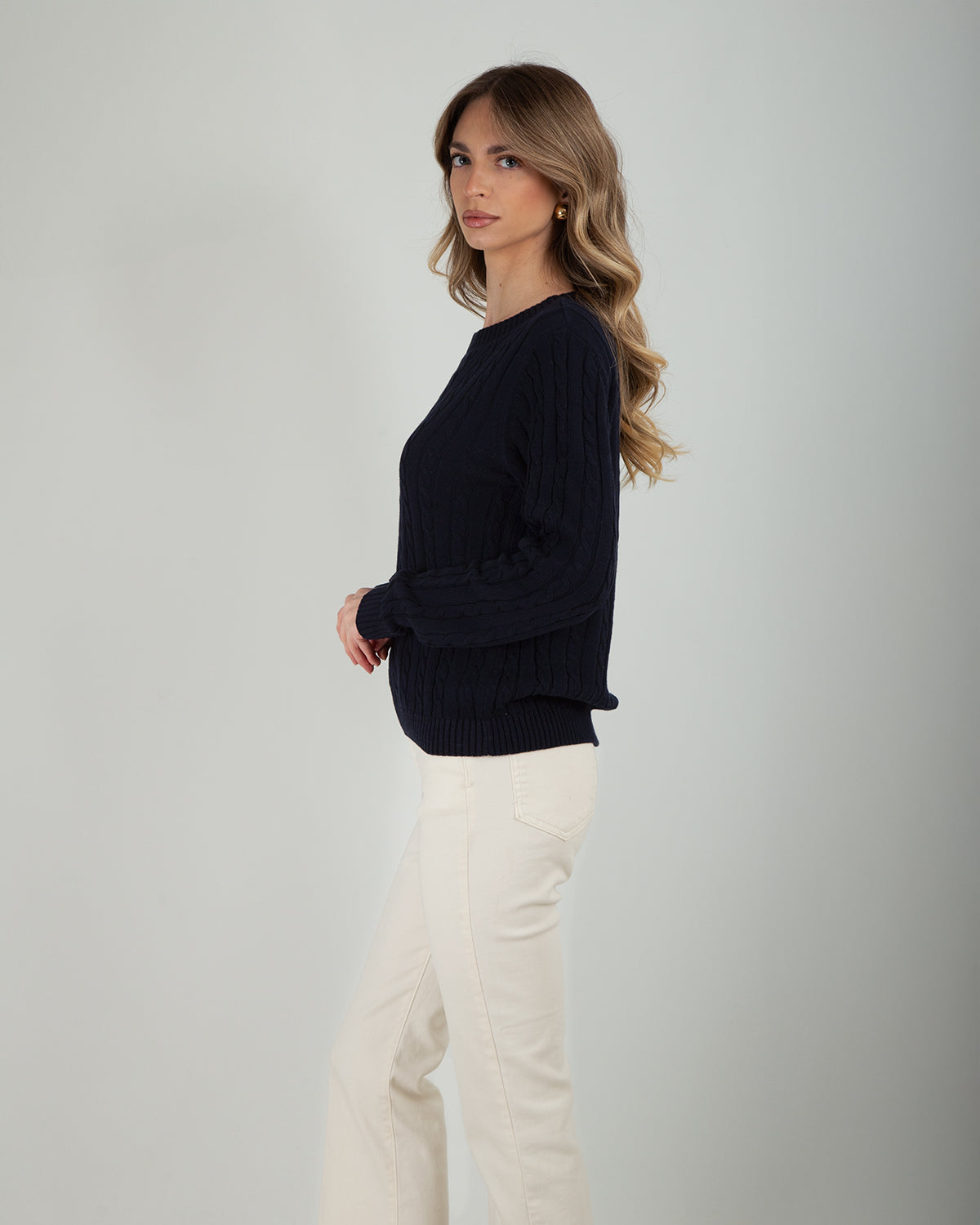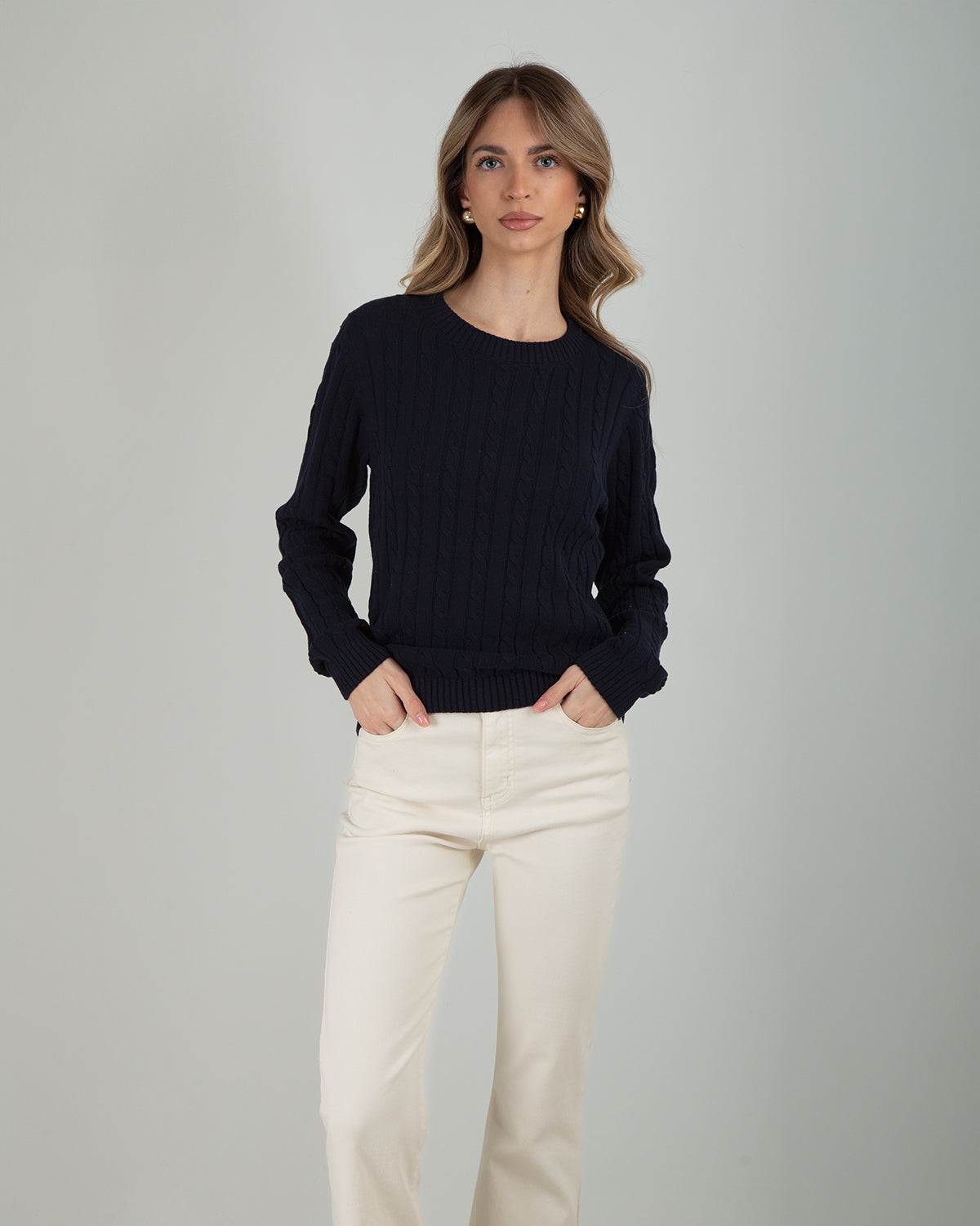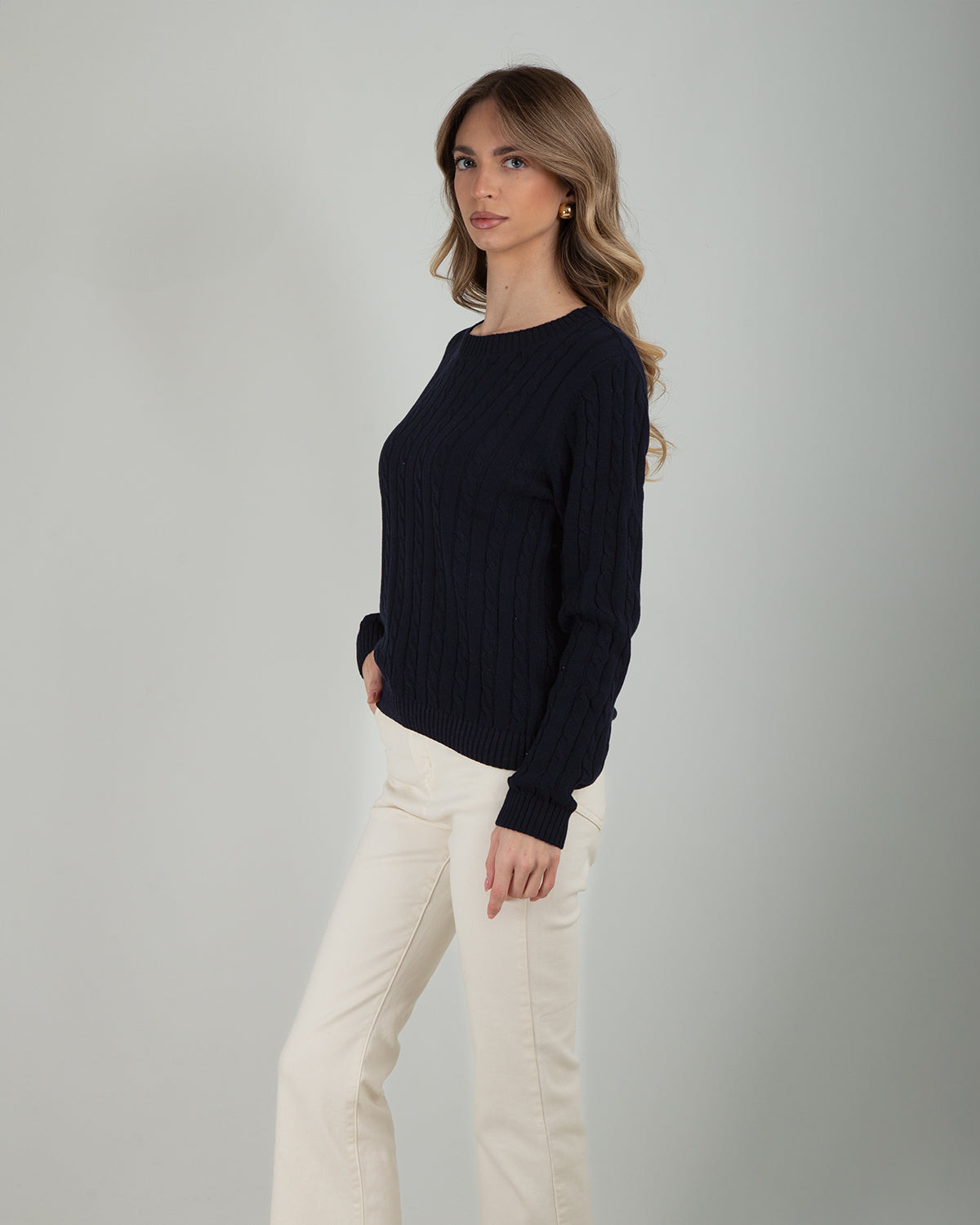 Maglia girocollo in 100% cotone con lavorazione a trecce, elegante e senza tempo.