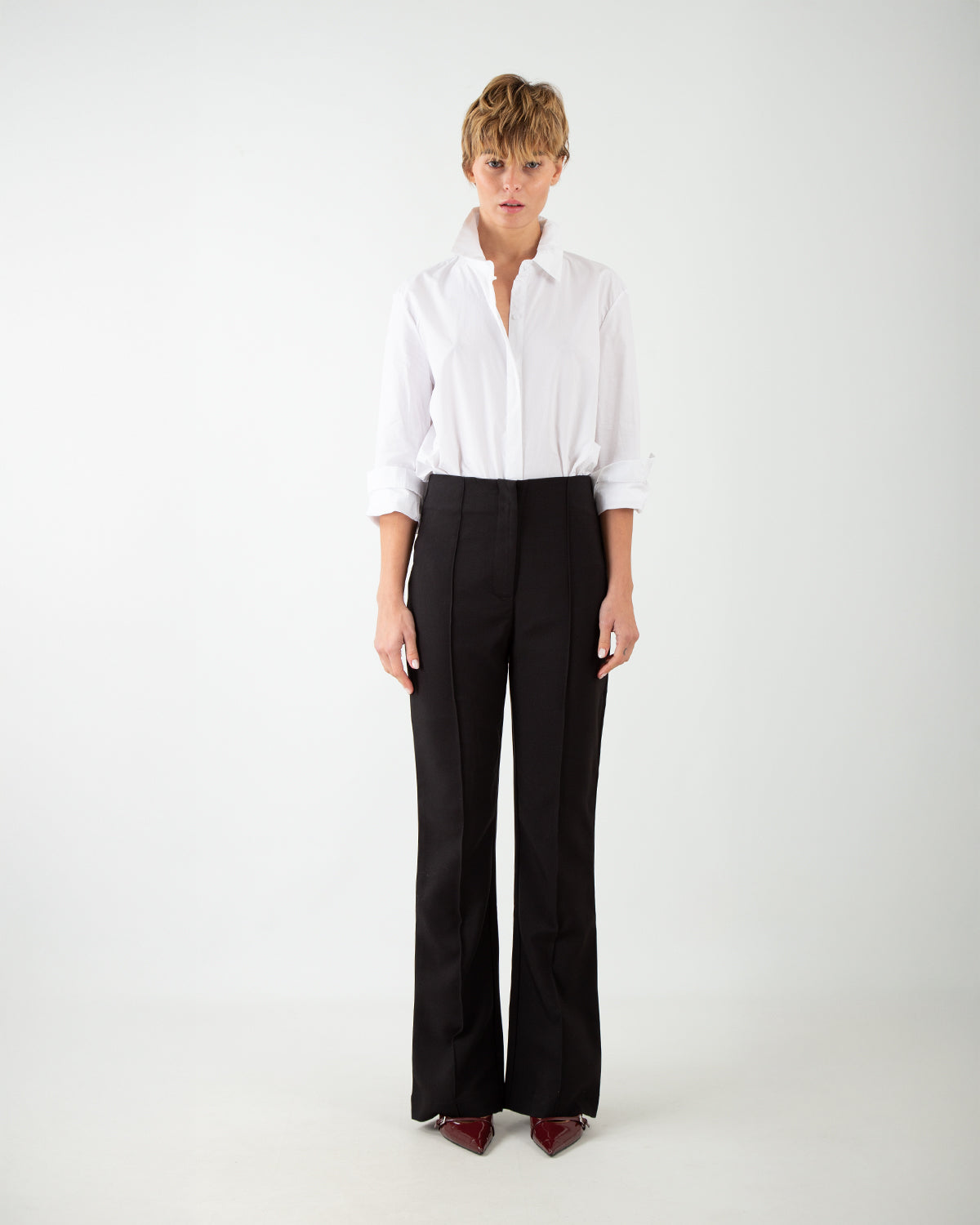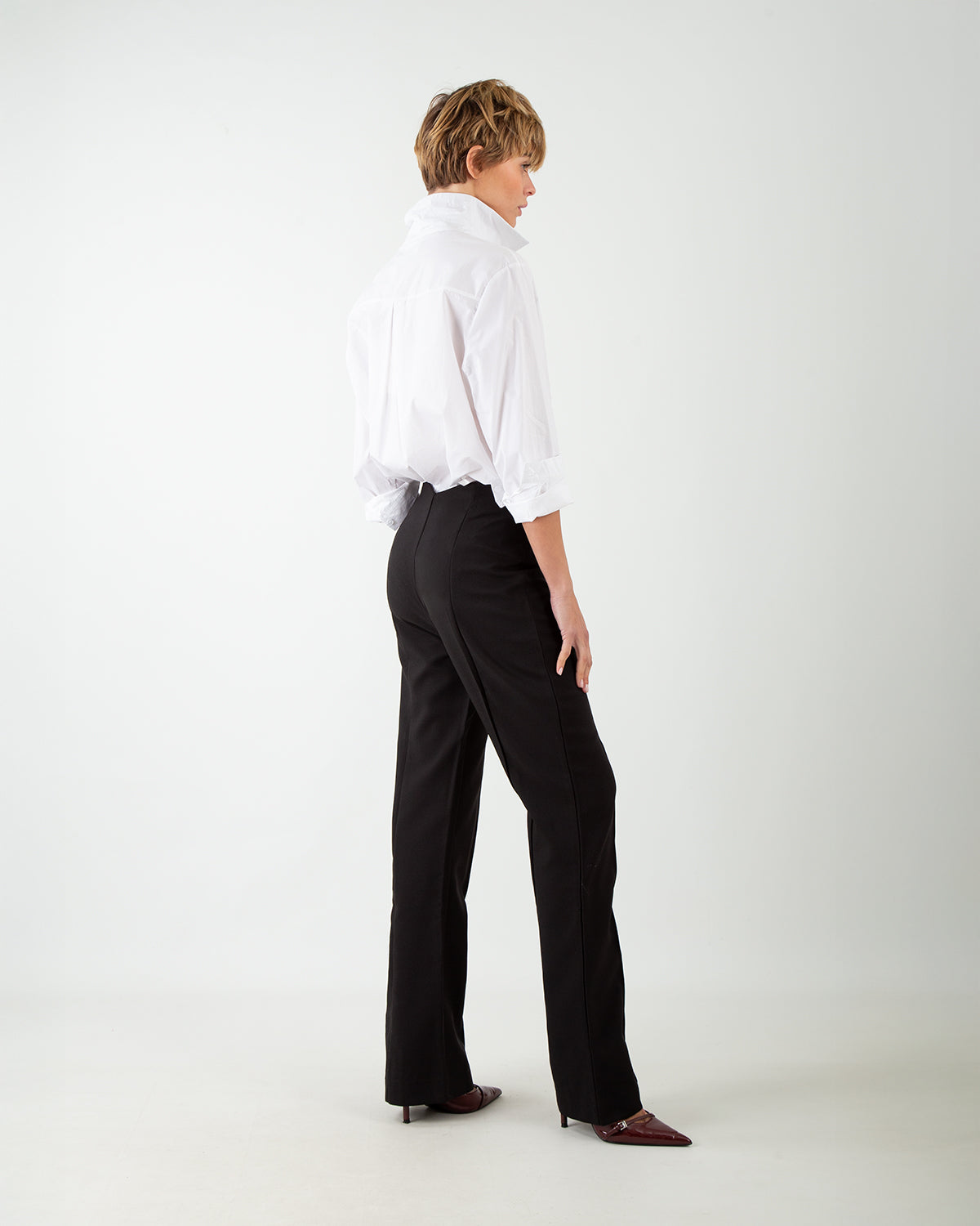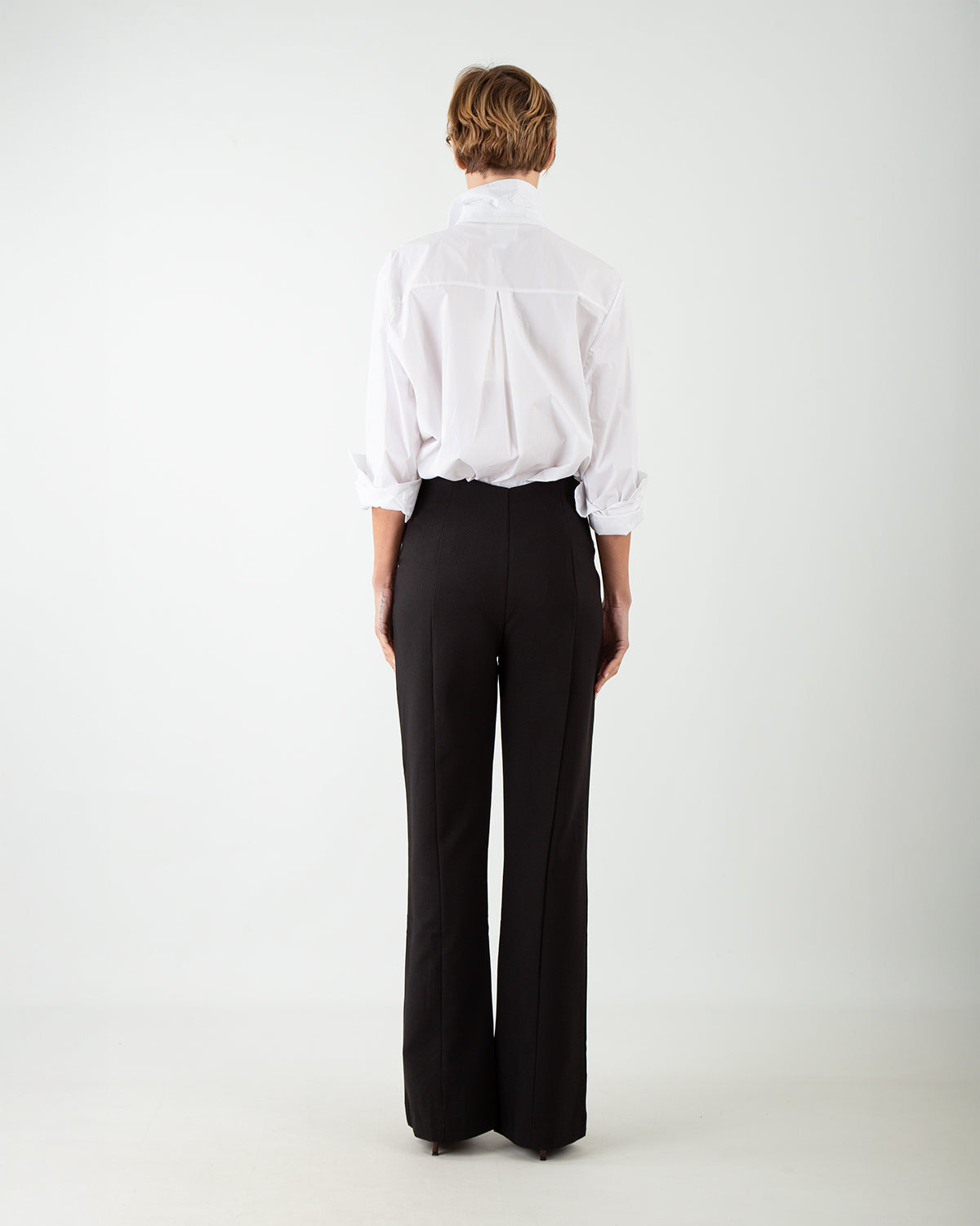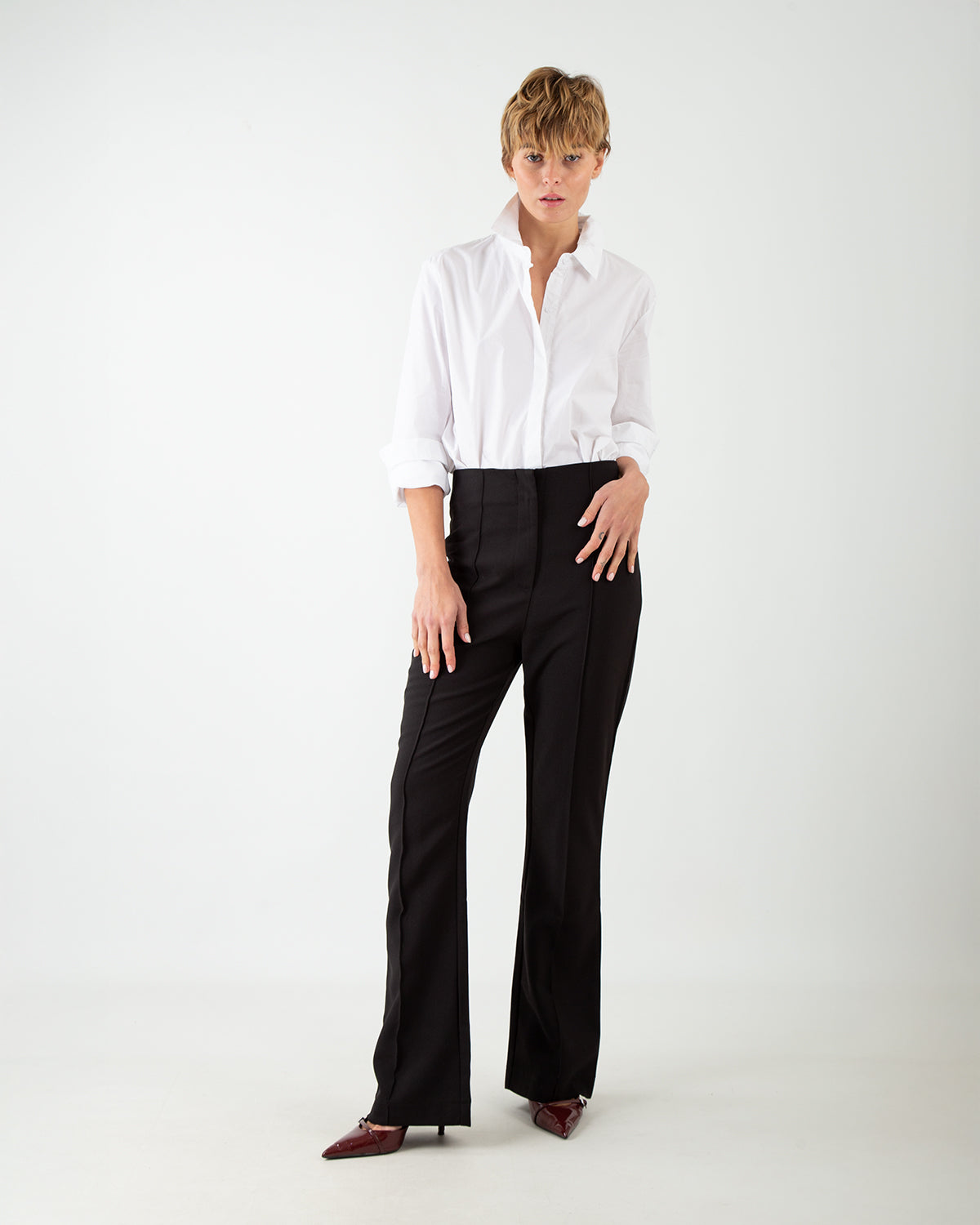 Diese Schlaghose aus einer Viskosemischung betont die Silhouette dank der Mittelnaht, die die Figur verschlankt. Der mittelhohe Bund definiert elegant die Taille, während das leicht ausgestellte Gesäß die Möglichkeit bietet, sie mit einem Absatz für einen raffinierten Look oder mit einem Turnschuh für ein moderneres Outfit zu kombinieren. Eine vielseitige Hose, die Weiblichkeit und Eleganz für jede Gelegenheit vereint.