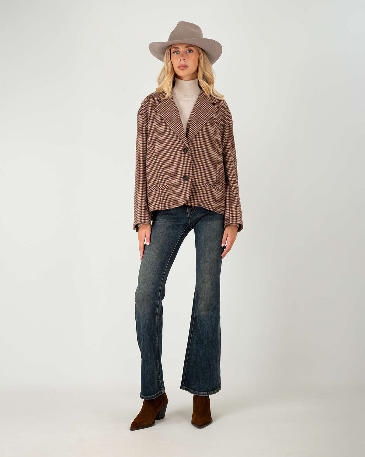 This short plaid blazer reinterprets the masculine classic with a modern, casual spirit. Designed for the woman who loves unstructured elegance, it is the perfect garment to accompany you through the cooler months with style and personality. The over fit gives comfort and a contemporary allure, while the short cut lends itself to pairing with high-waisted pants or midi skirts. The wide lapel collar recalls sartorial inspiration, balanced by slightly dropped shoulders that give a softer look. The micro plaid pattern in warm tones makes it versatile and ideal for the fall season, perfect for both casual daytime outfits and more curated looks. A timeless garment that can be reinterpreted differently each time.