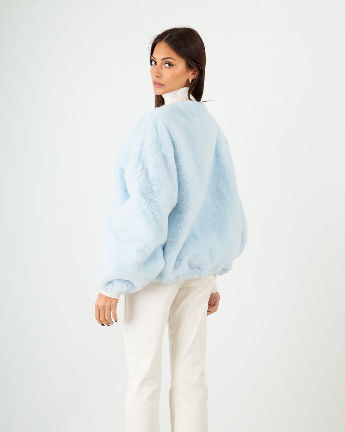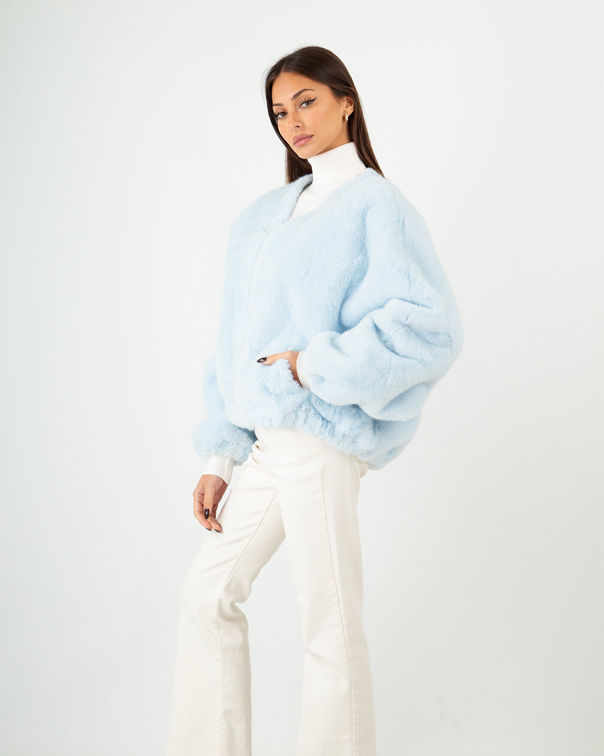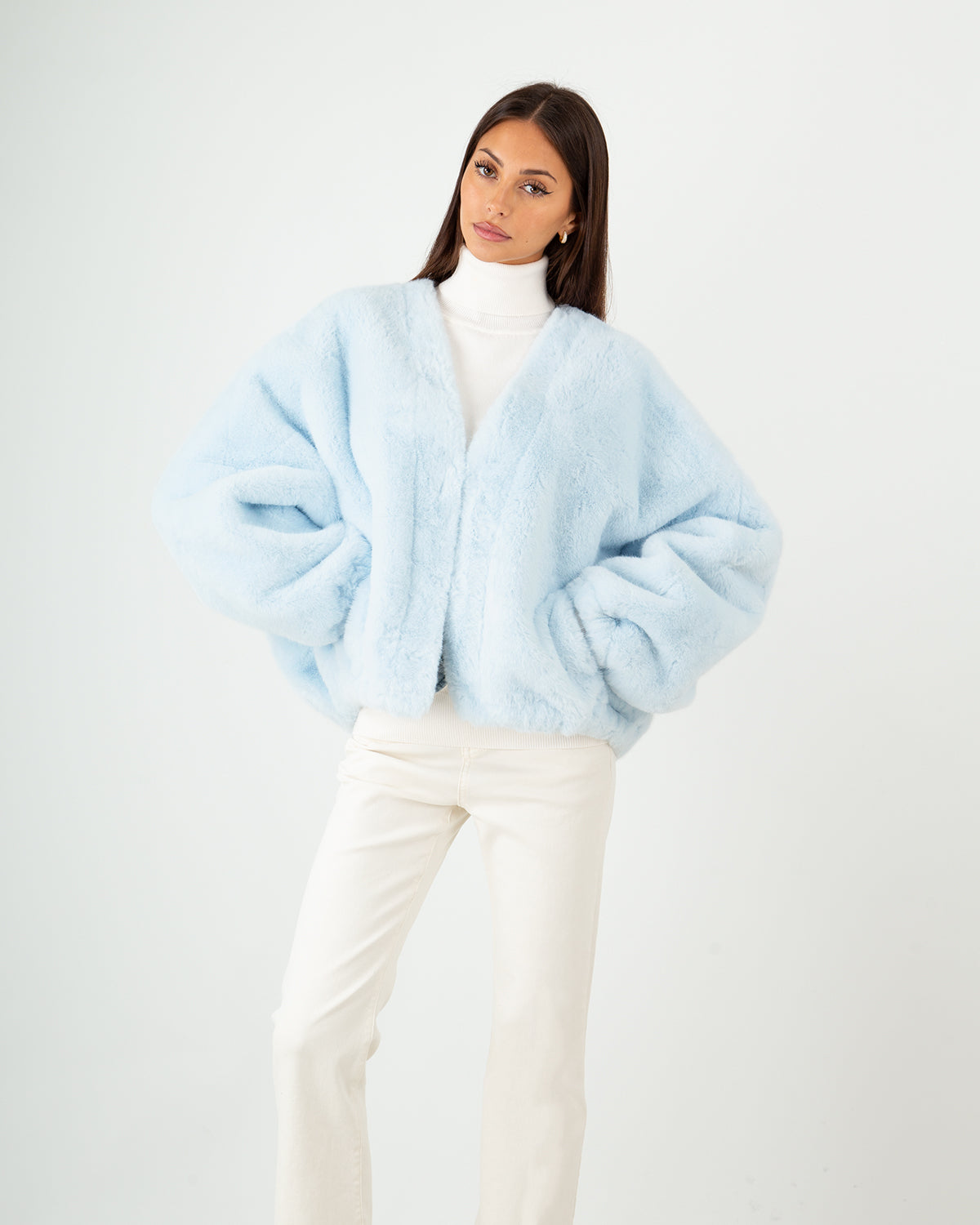 This short faux fur coat with oversize fit is the perfect ally to face the cold seasons with a contemporary touch. Soft, enveloping and cruelty-free, it gives a bold look without sacrificing comfort, designed for those who like to stand out with elegance and awareness. The design features a gathered effect that adds texture and movement, while the dropped shoulder and collarless V-neck create a relaxed yet sophisticated silhouette. The regular length makes it extremely versatile: it pairs perfectly with casual looks, but also lends itself to more sophisticated styling. Two side pockets complete the garment with discreet functionality. An urban chic must-have, perfect for layering over sweaters or turtlenecks on colder days.
