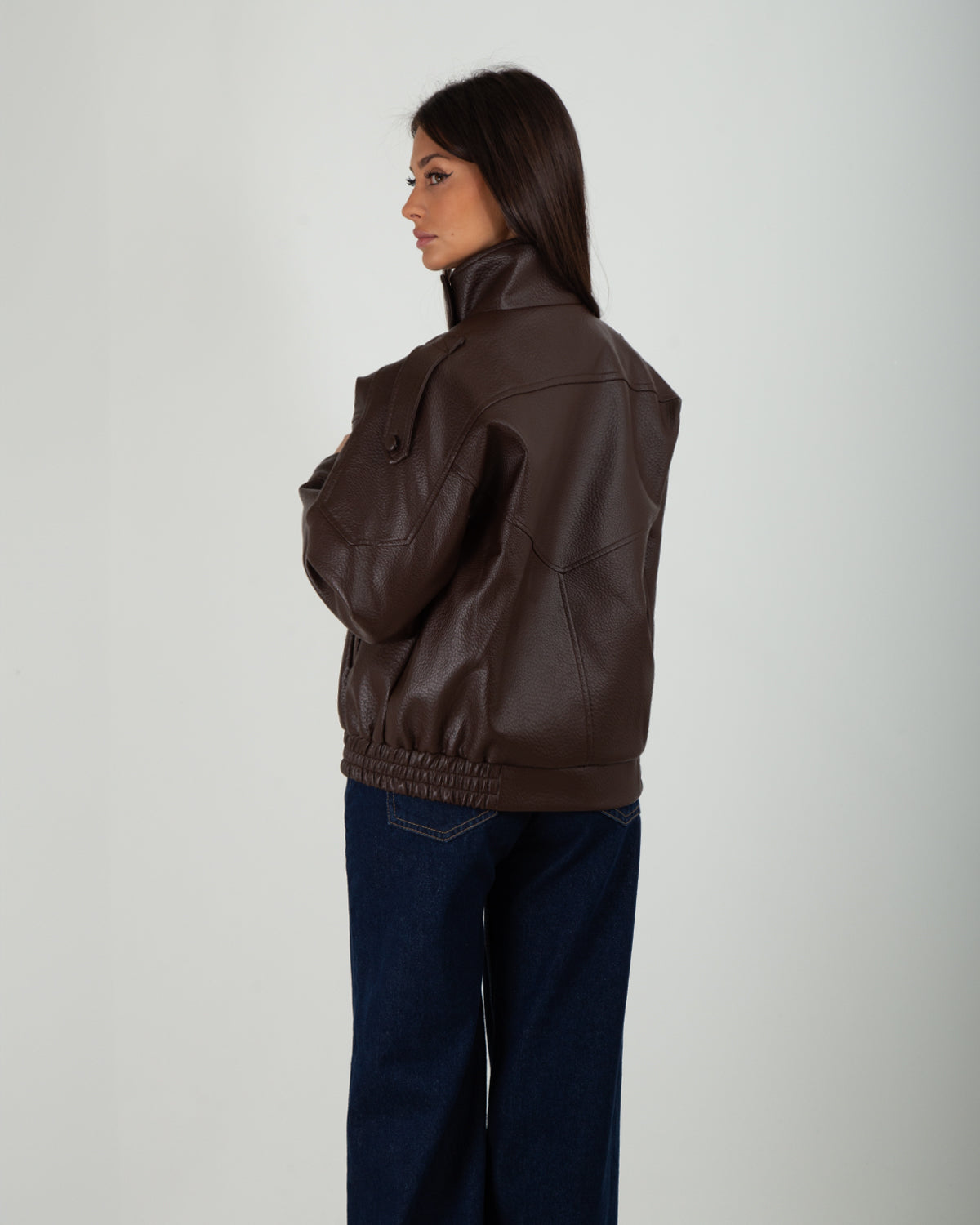 Il Bomber Ecopelle Effetto Martellato è un capo di tendenza che unisce stile deciso e dettagli ricercati. Realizzato in ecopelle con effetto martellato, dona al look una texture moderna e sofisticata. La chiusura con zip frontale rende il capo pratico e dinamico, mentre il collo alto con reverse in pelle aggiunge struttura e carattere. I bottoni ricoperti sui revers e sulle maniche impreziosiscono il design con un dettaglio elegante. Le tasche anteriori lo rendono funzionale per l’uso quotidiano, mentre l’arricciatura laterale sul fondo crea volume e movimento, contribuendo a definire una silhouette contemporanea. Un capo in trend, perfetto per completare look urbani e moderni, da abbinare a jeans, pantaloni sartoriali o gonne per creare contrasti di stile.