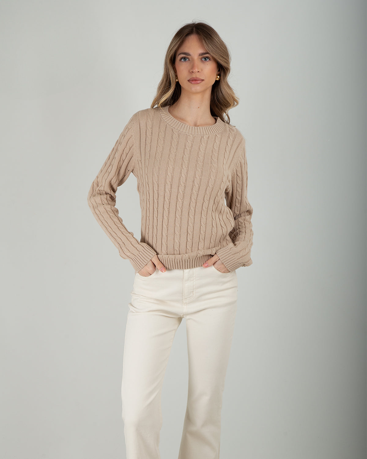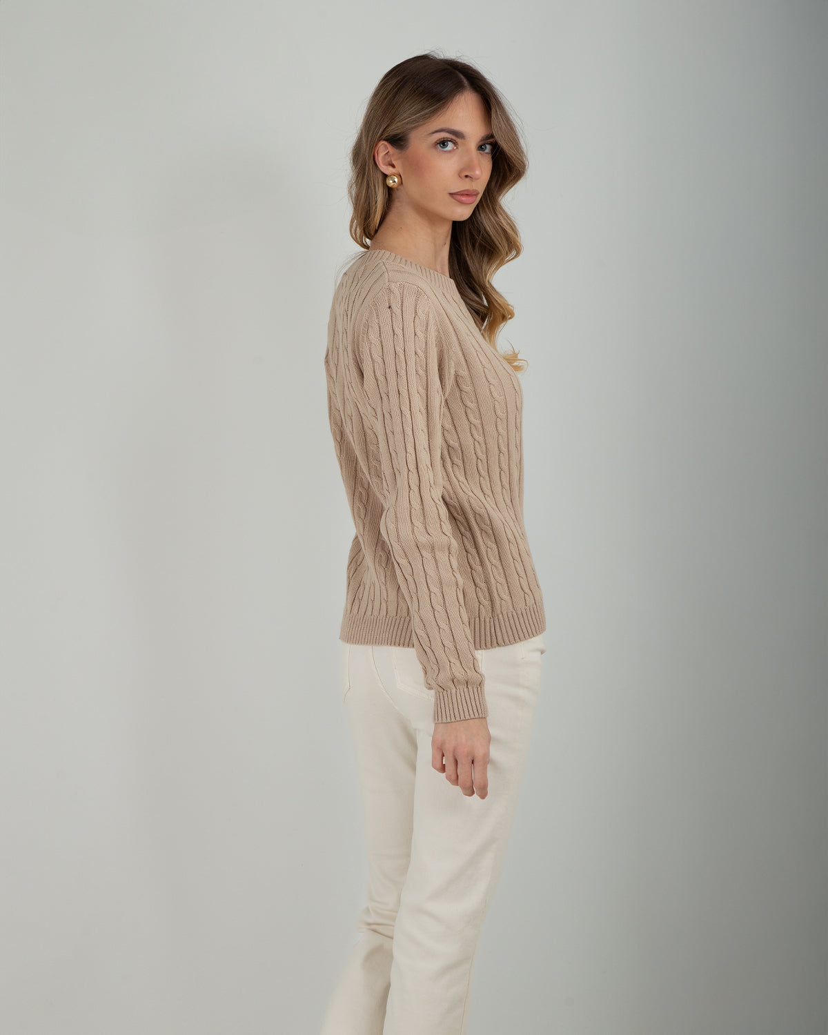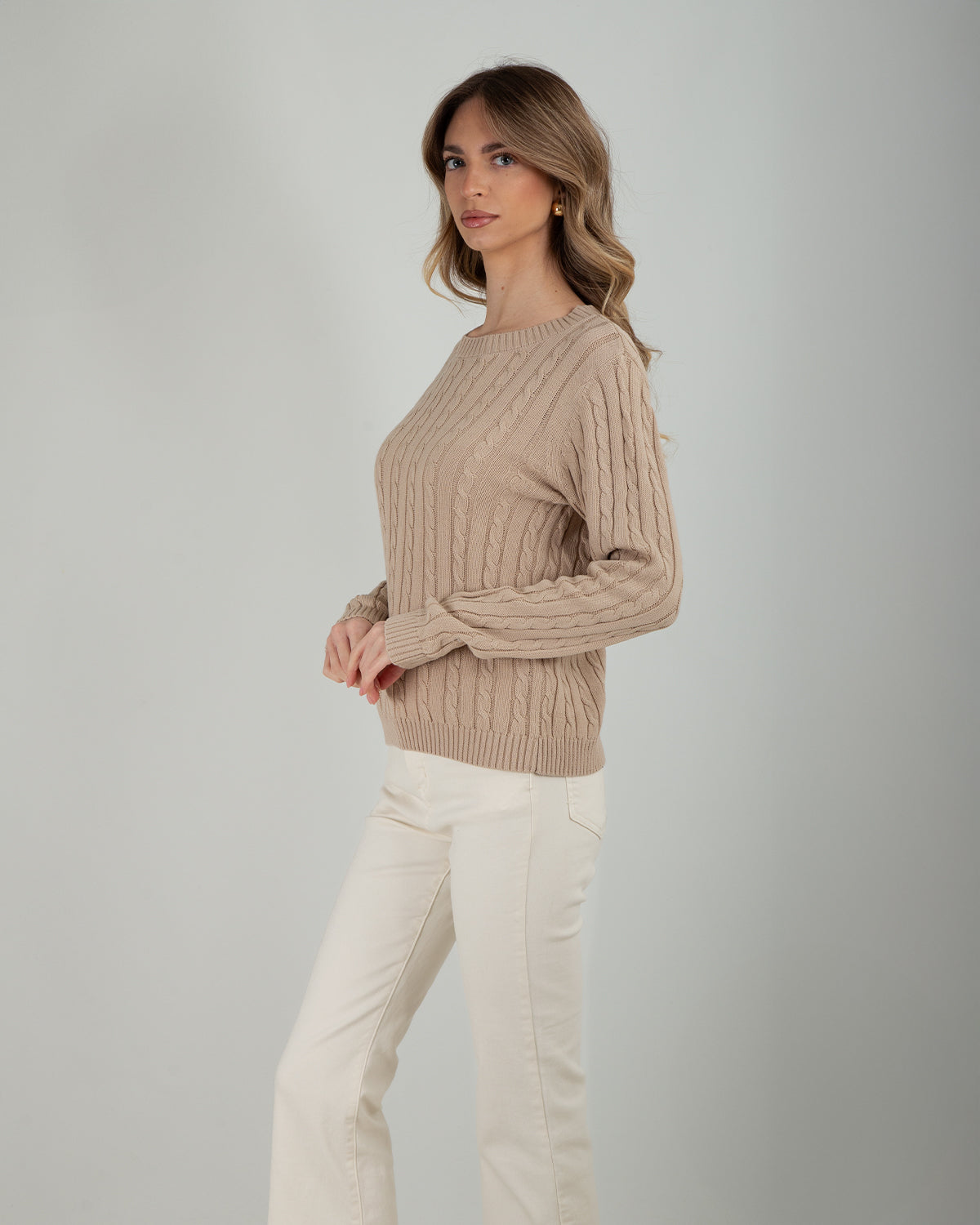 Maglia girocollo in 100% cotone con lavorazione a trecce, elegante e senza tempo.