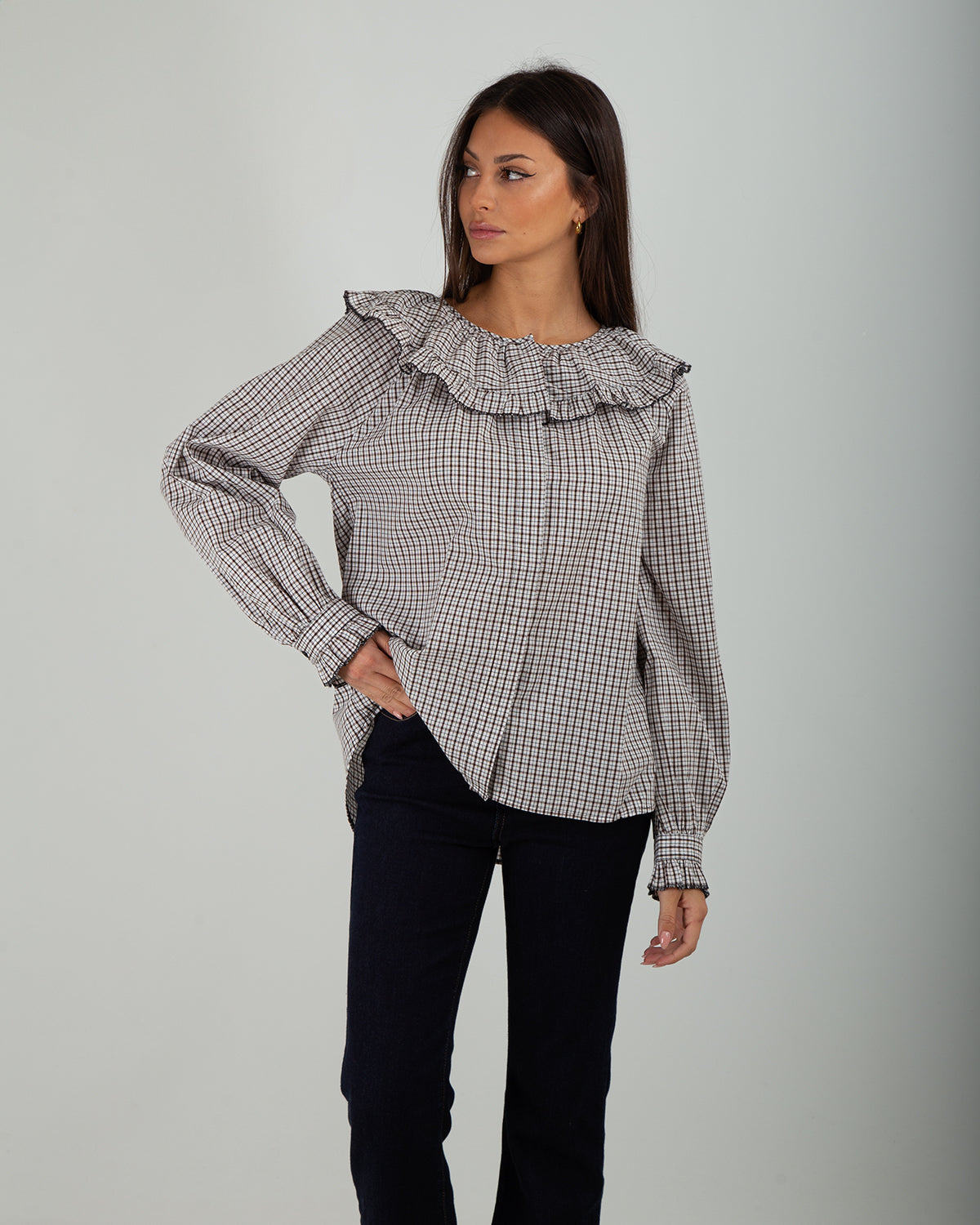 La Camicia Quadri Rouge Collo Moro è un capo raffinato che combina una fantasia a quadri con dettagli femminili e distintivi. Il punto di forza è il rouge sul colletto e sui polsini, che dona movimento e un tocco romantico al design della camicia. La linea pulita la rende facile da abbinare a pantaloni sartoriali, jeans o gonne, permettendo di creare outfit eleganti ma anche più casual. Il contrasto tra la fantasia a quadri e i dettagli sul colletto e sui polsini rende questo capo originale e perfetto per chi ama distinguersi con stile. Ideale per look da giorno, per l’ufficio o per occasioni in cui si desidera un outfit curato ma non eccessivo.