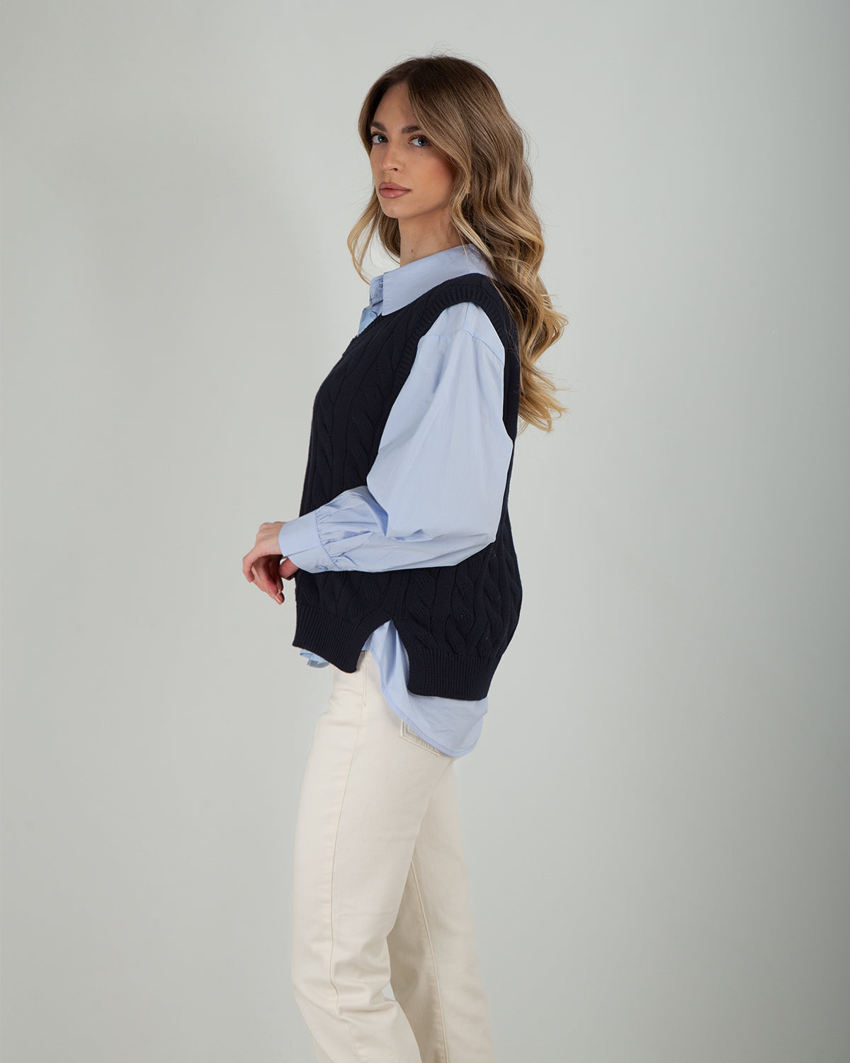 Gilet in 100% cotone con lavorazione a trecce, ideale da indossare sopra camicie.