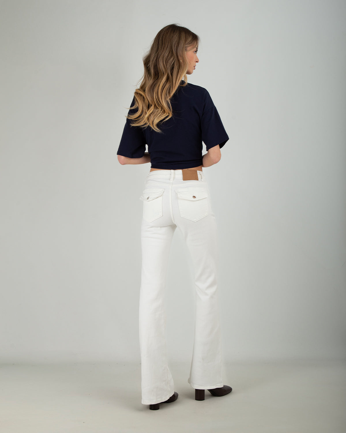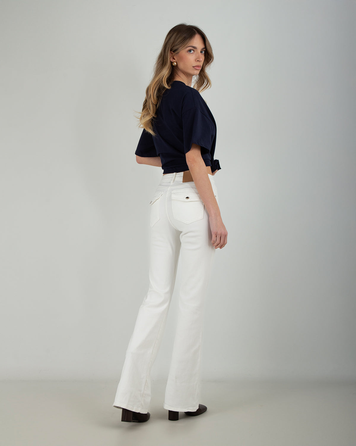 Il Jeans Zampa Taschine è un capo iconico che richiama uno stile vintage rivisitato in chiave moderna. Il fit a zampa slancia la silhouette e allunga visivamente la gamba, creando un effetto elegante e armonioso. La vita alta valorizza il punto vita, rendendolo perfetto da abbinare a top, camicie o maglie infilate. Le taschine sul retro aggiungono un dettaglio pratico e completano il design con semplicità. Ideale per la primavera, si presta a look casual con sneakers o sandali, ma anche a outfit più ricercati con tacchi e blazer. Un jeans versatile e femminile, perfetto per ogni occasione.