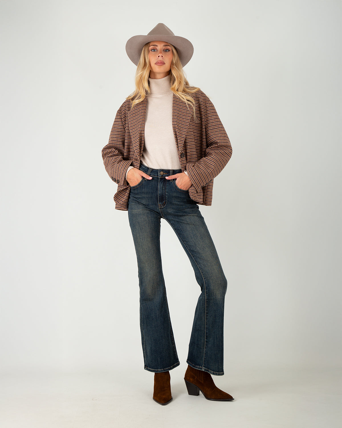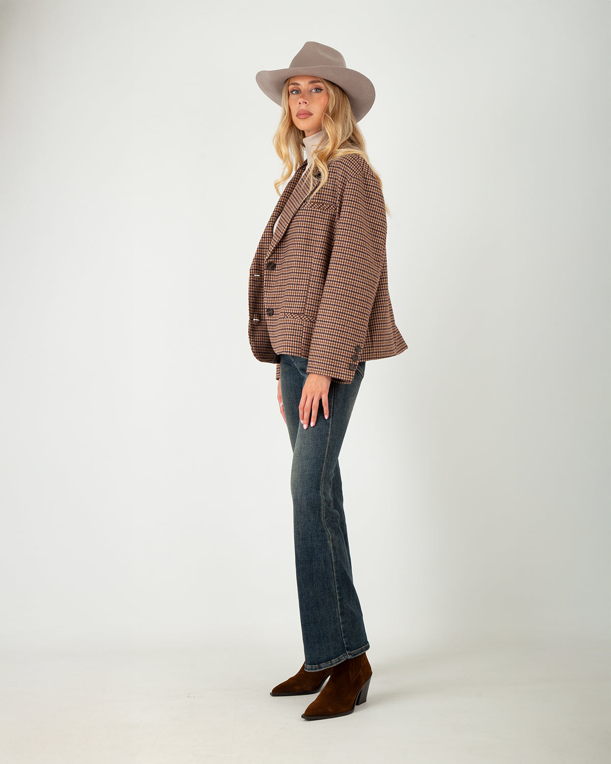 This short plaid blazer reinterprets the masculine classic with a modern, casual spirit. Designed for the woman who loves unstructured elegance, it is the perfect garment to accompany you through the cooler months with style and personality. The over fit gives comfort and a contemporary allure, while the short cut lends itself to pairing with high-waisted pants or midi skirts. The wide lapel collar recalls sartorial inspiration, balanced by slightly dropped shoulders that give a softer look. The micro plaid pattern in warm tones makes it versatile and ideal for the fall season, perfect for both casual daytime outfits and more curated looks. A timeless garment that can be reinterpreted differently each time.