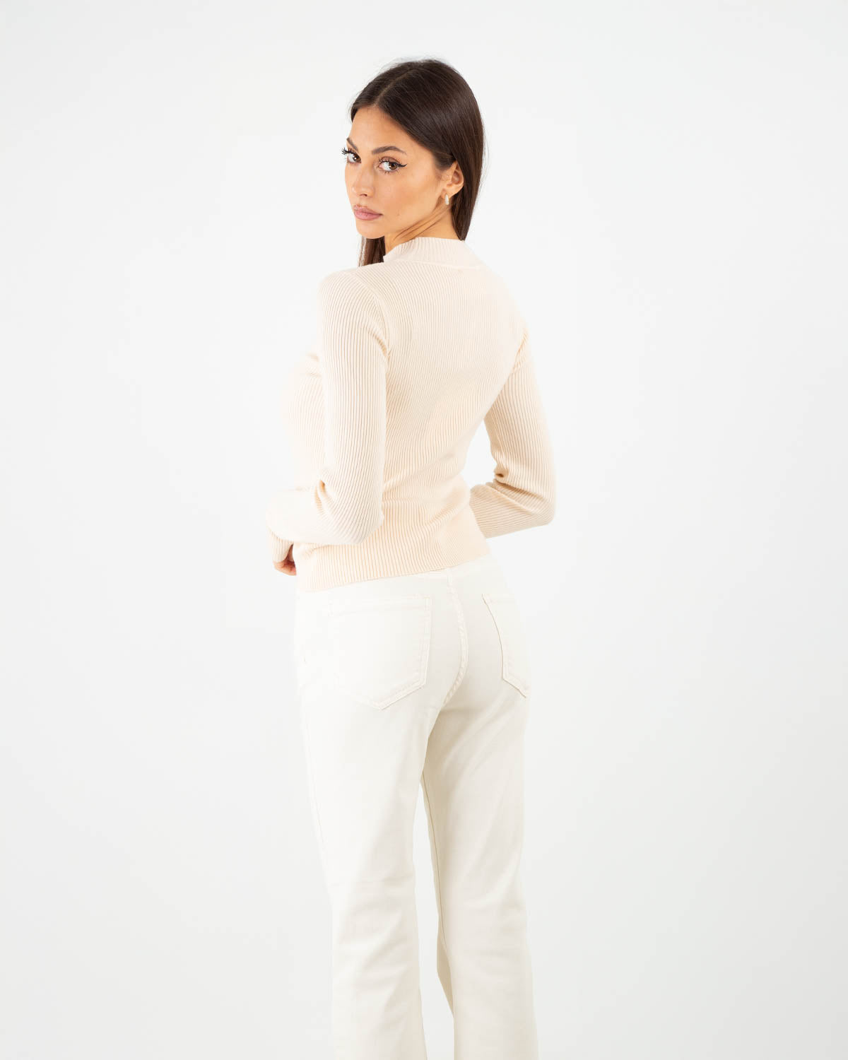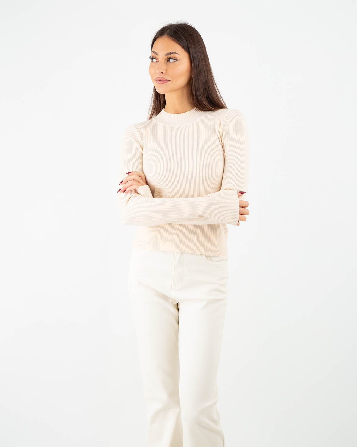 In a warm viscose blend, this mock neckline combines comfort and style thanks to its crop and fitted design, designed to follow the silhouette without sacrificing softness. The ribbed knit gives a refined touch and makes it an ideal garment for creating games of volumes and proportions. Perfect under jackets and blazers, it adds character to any outfit while maintaining a minimal and versatile mood.