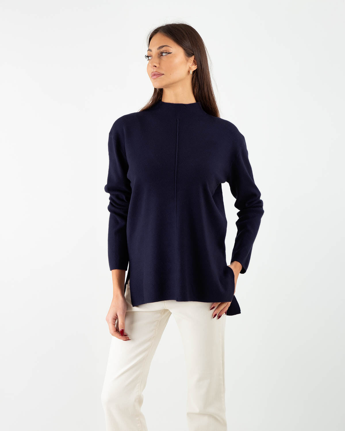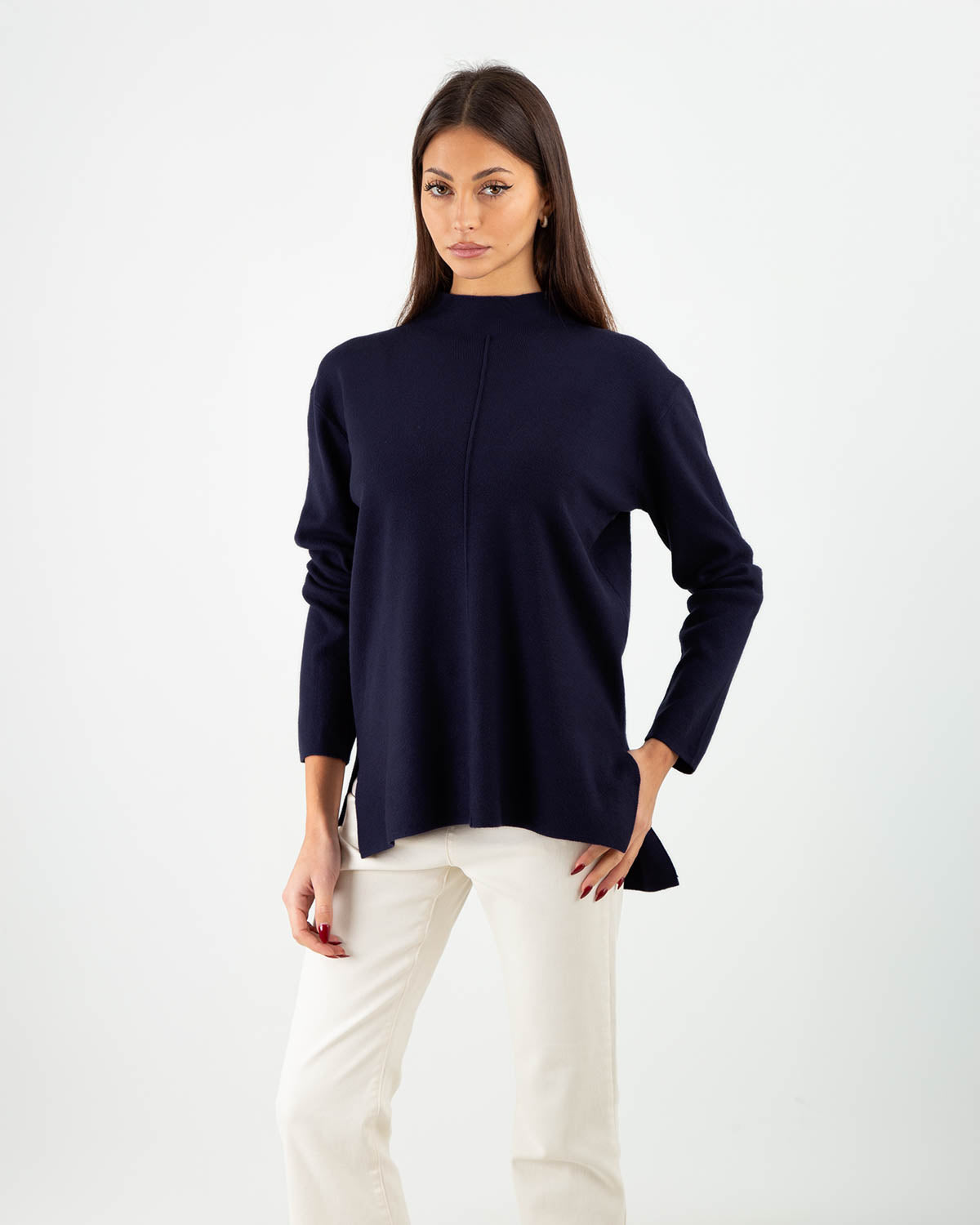 Made from a soft viscose blend, this sweater combines comfort and style with an oversized cut that falls naturally over the body. The front seam helps flatter the figure, adding a minimal yet refined detail. A versatile garment, ideal on its own for a clean look or under jackets and blazers for stylish layering during winter.