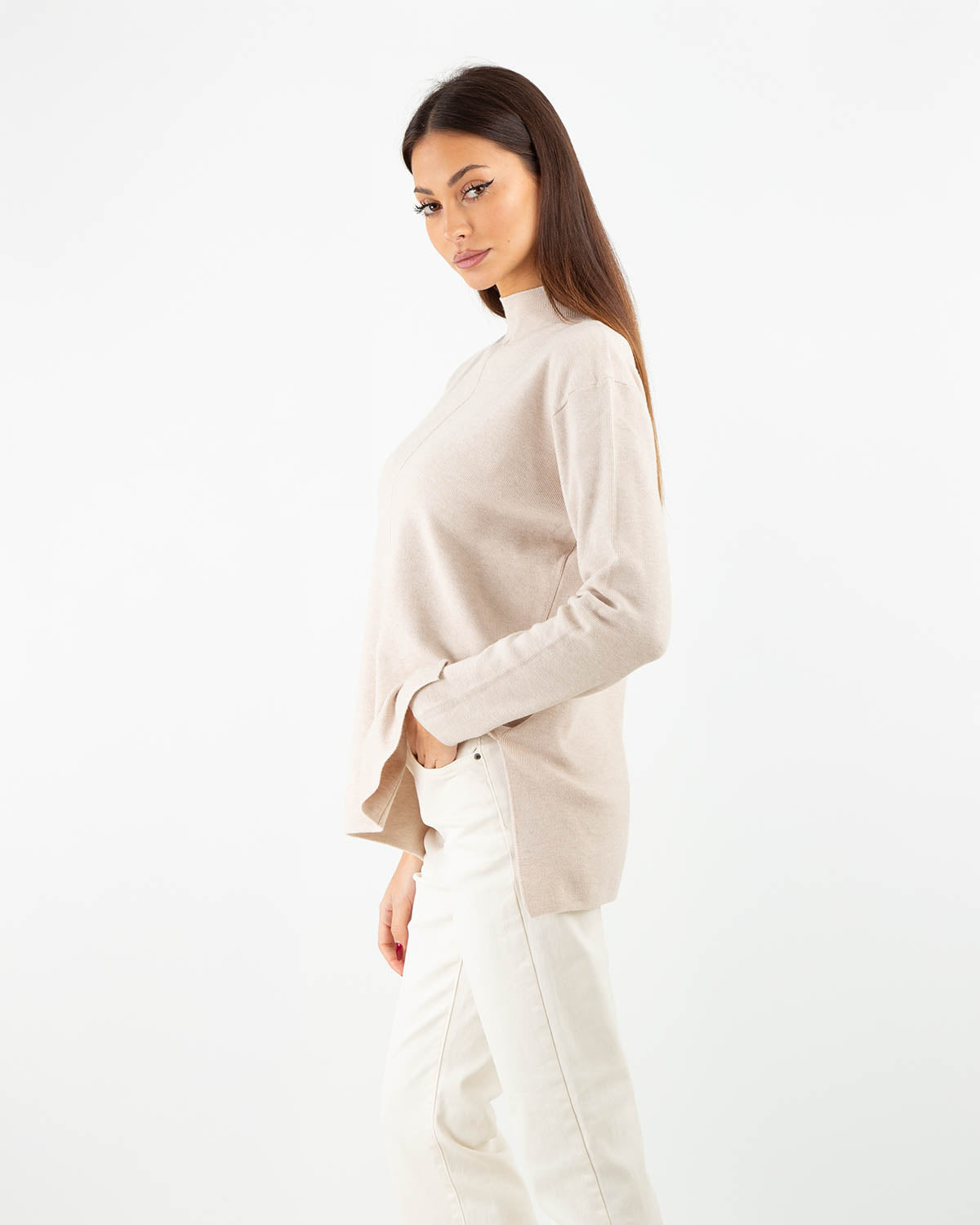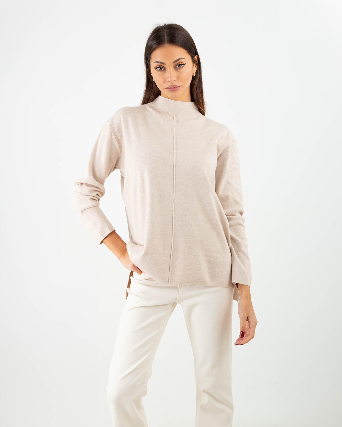 Made from a soft viscose blend, this sweater combines comfort and style with an oversized cut that falls naturally over the body. The front seam helps flatter the figure, adding a minimal yet refined detail. A versatile garment, ideal on its own for a clean look or under jackets and blazers for stylish layering during winter.