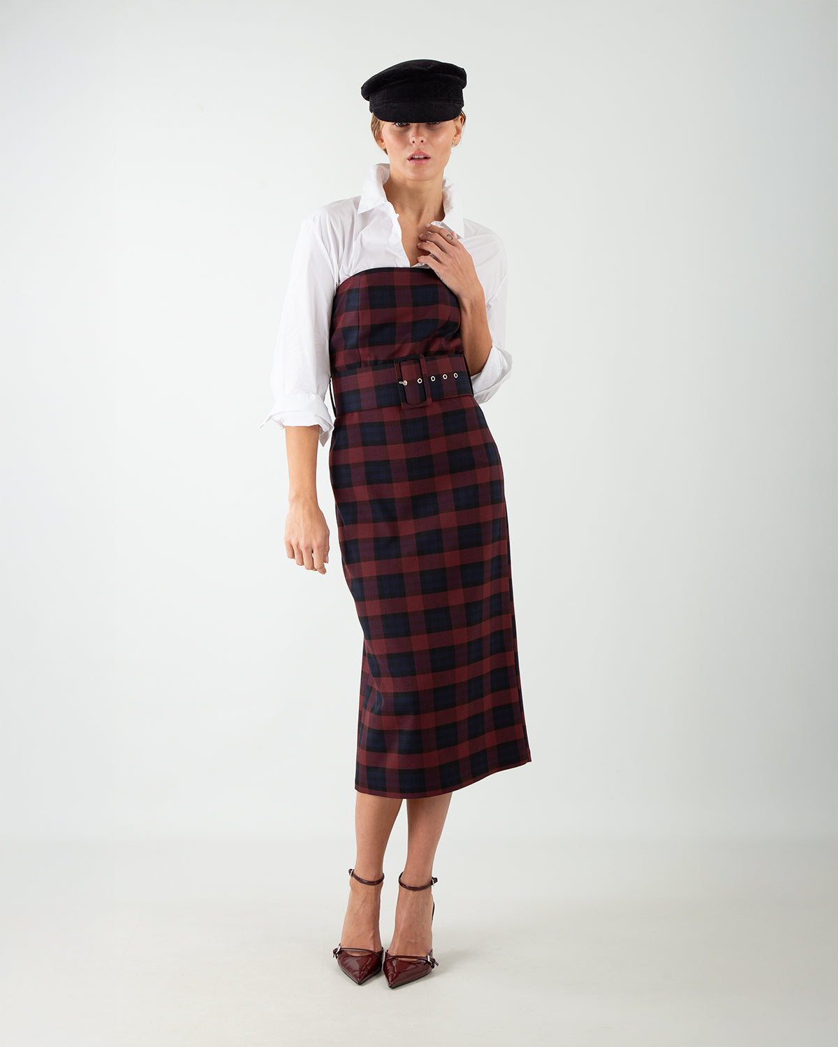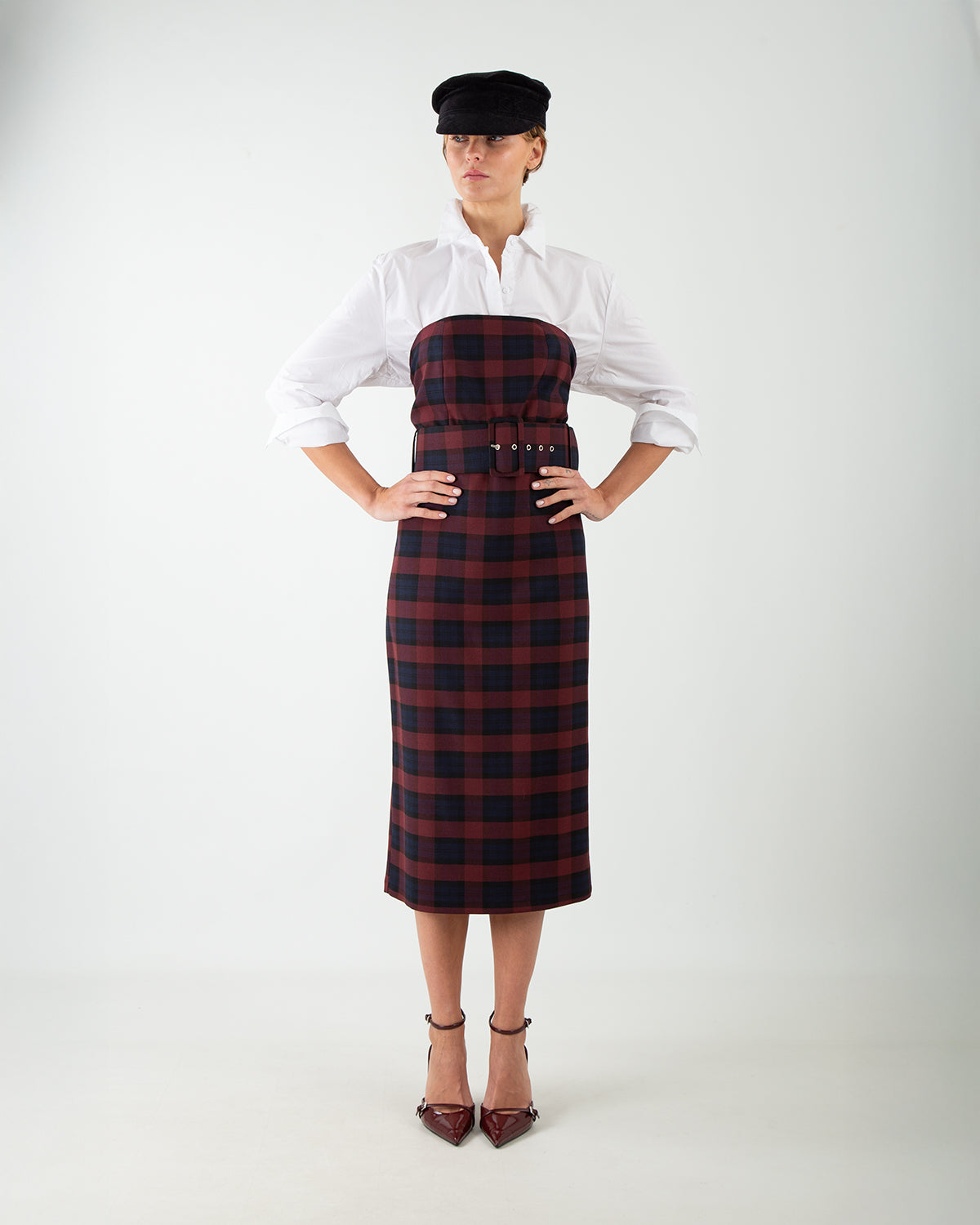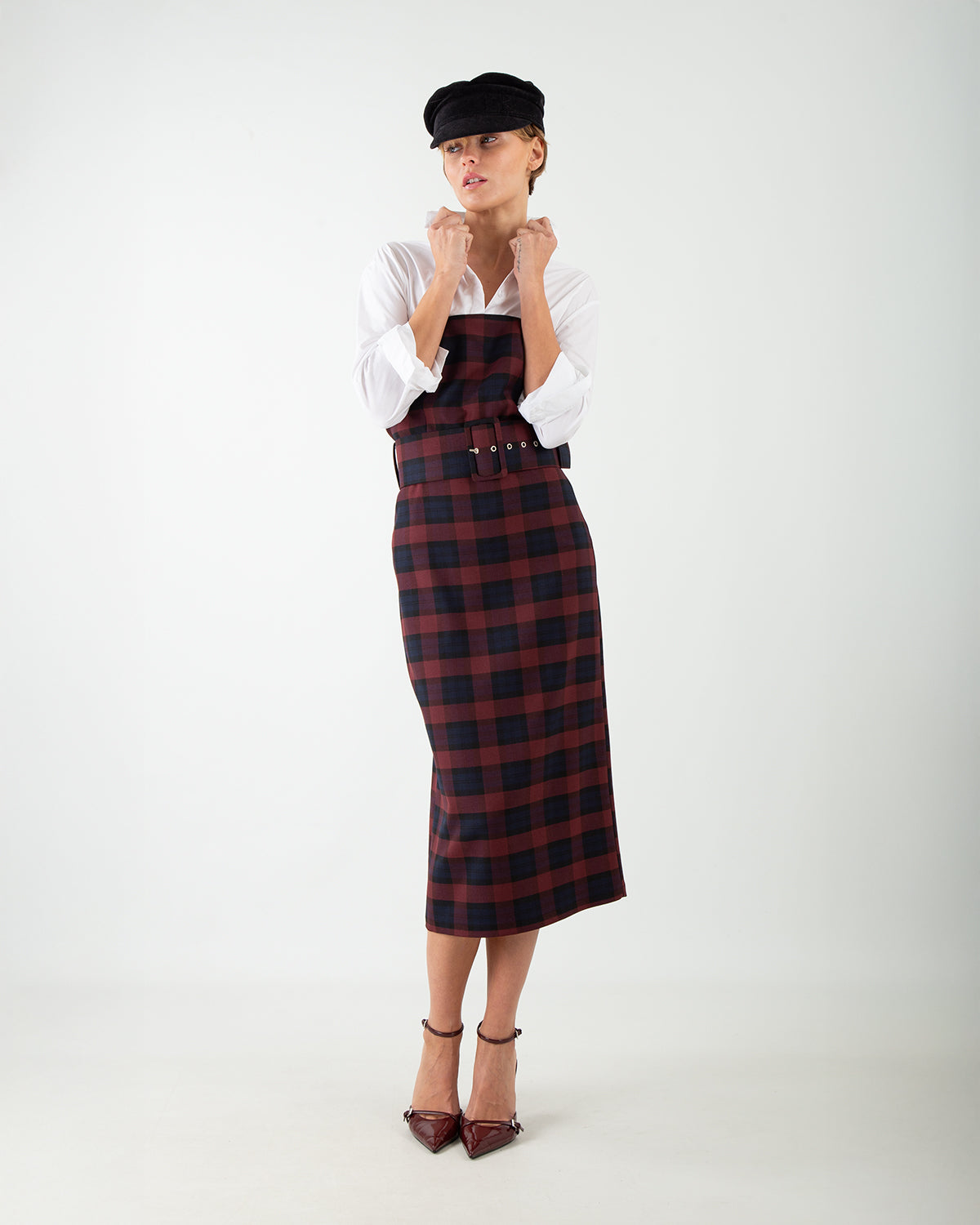Questo abito a fascia in morbido misto viscosa valorizza la silhouette grazie alla cintura in tessuto che segna delicatamente il punto vita. Il motivo a quadri in tonalità nero, blu e bordeaux dona carattere e versatilità al look, perfetto da indossare da solo o sovrapposto a una camicia bianca per un outfit sofisticato e ricercato. Un abito elegante pensato per chi ama distinguersi in ogni occasione.