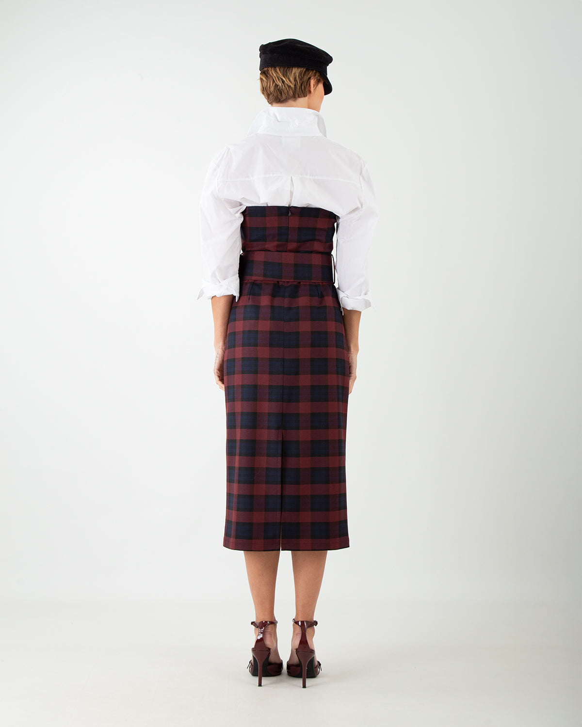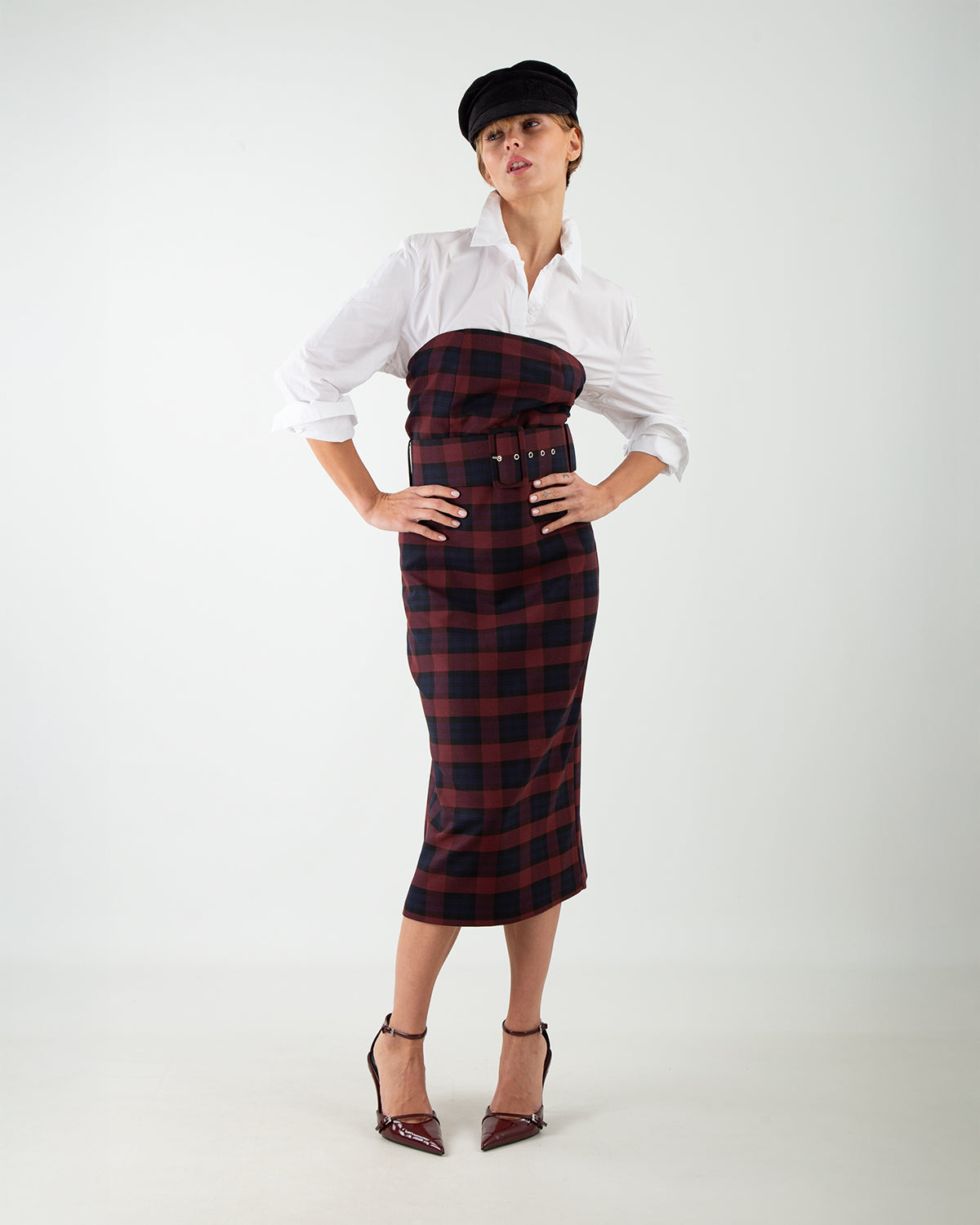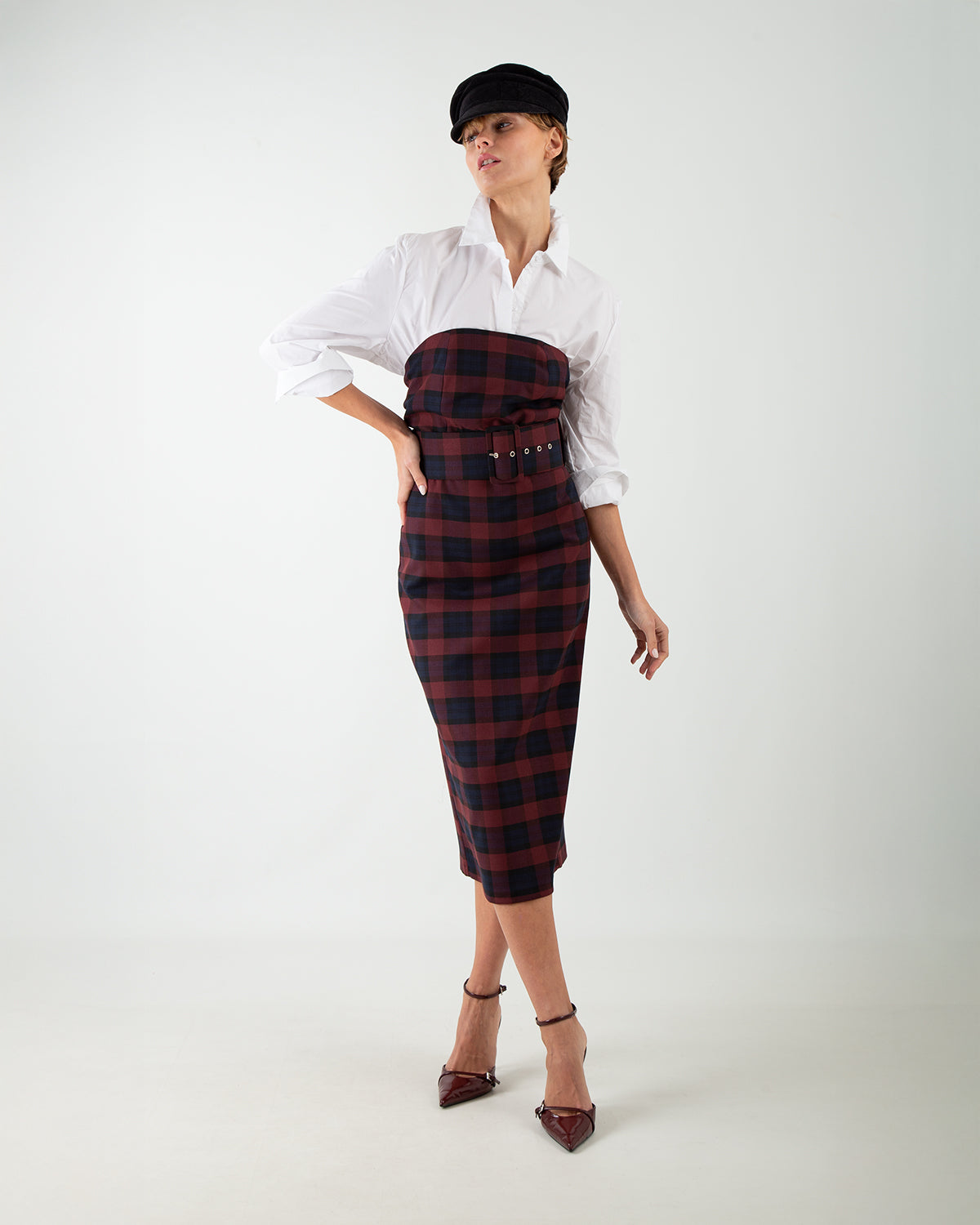 Questo abito a fascia in morbido misto viscosa valorizza la silhouette grazie alla cintura in tessuto che segna delicatamente il punto vita. Il motivo a quadri in tonalità nero, blu e bordeaux dona carattere e versatilità al look, perfetto da indossare da solo o sovrapposto a una camicia bianca per un outfit sofisticato e ricercato. Un abito elegante pensato per chi ama distinguersi in ogni occasione.